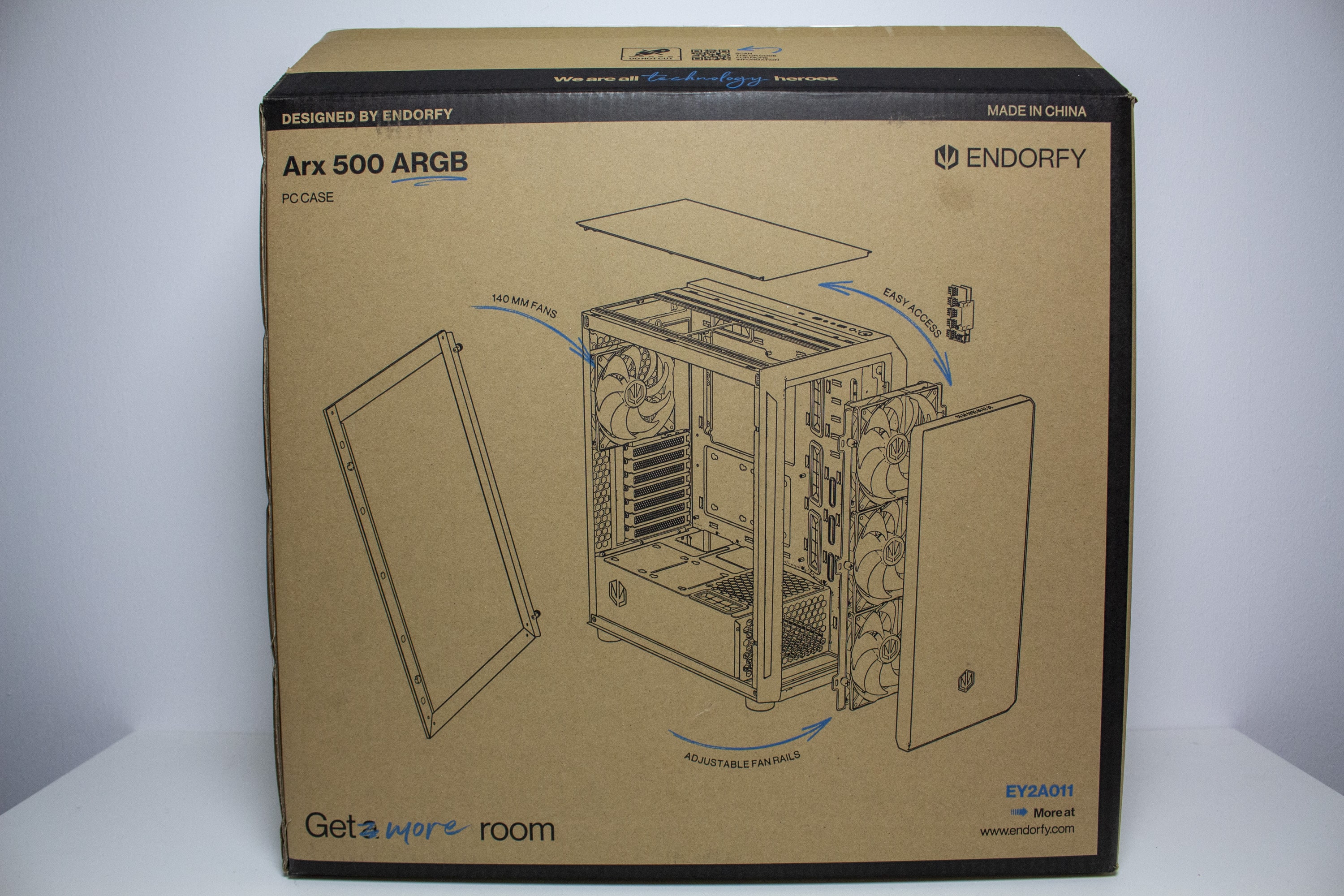 In Bezug auf die Verpackung bleibt es beim ENDORFY Arx 500 ARGB unspektakulär. Die Kartonage ist braun und wurde mit schwarzer sowie blauer Farbe für Akzente bedruckt. Außerdem sind zwei schematische Zeichnungen des Midi-Towers sowie eine Tabelle mit allen technischen Daten zu erkennen. Eine Auflistung der wichtigsten Features gibt es zusätzlich noch oben drauf. Im Karton hüllt ENDORFY das Arx 500 in zwei herkömmliche Styroporblöcke sowie eine Folie aus Kunststoff. Außerdem wurde vor dem Seitenfenster eine 25 Millimeter starke Schaumstoffmatte platziert und auch eine Schutzfolie wurde auf die Scheibe geklebt.