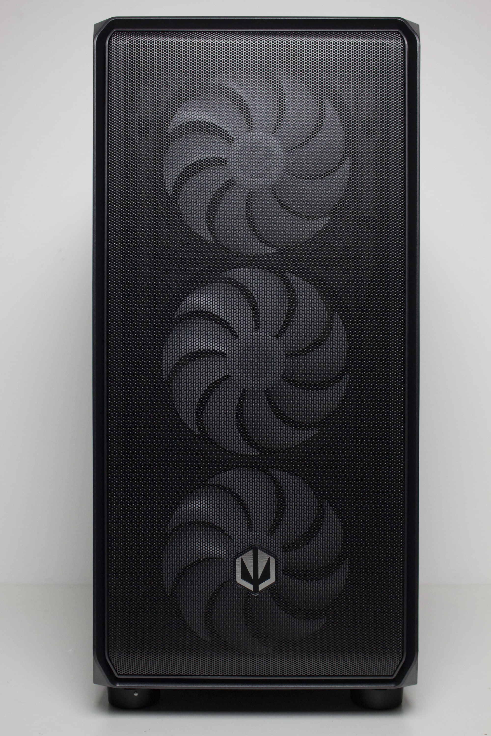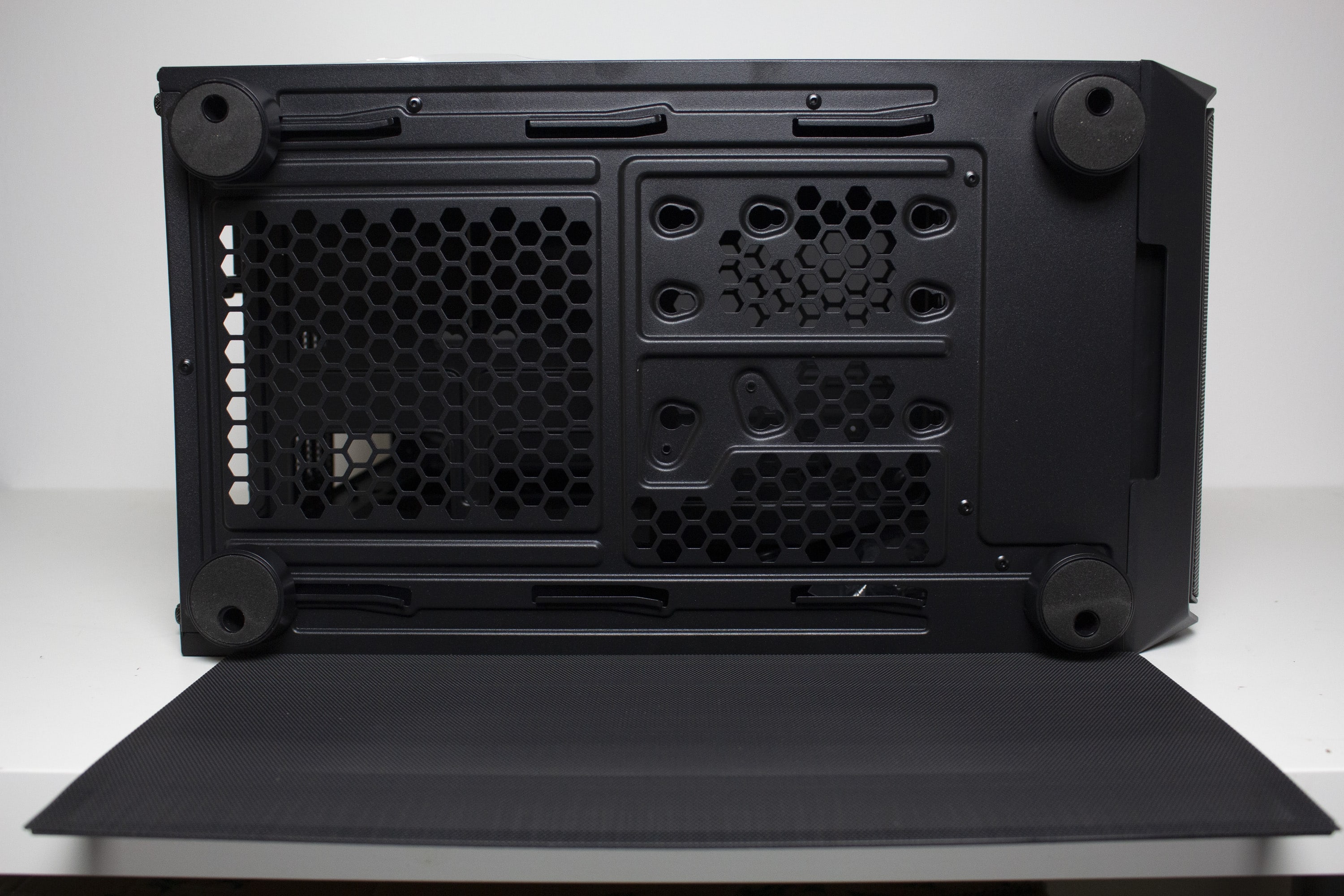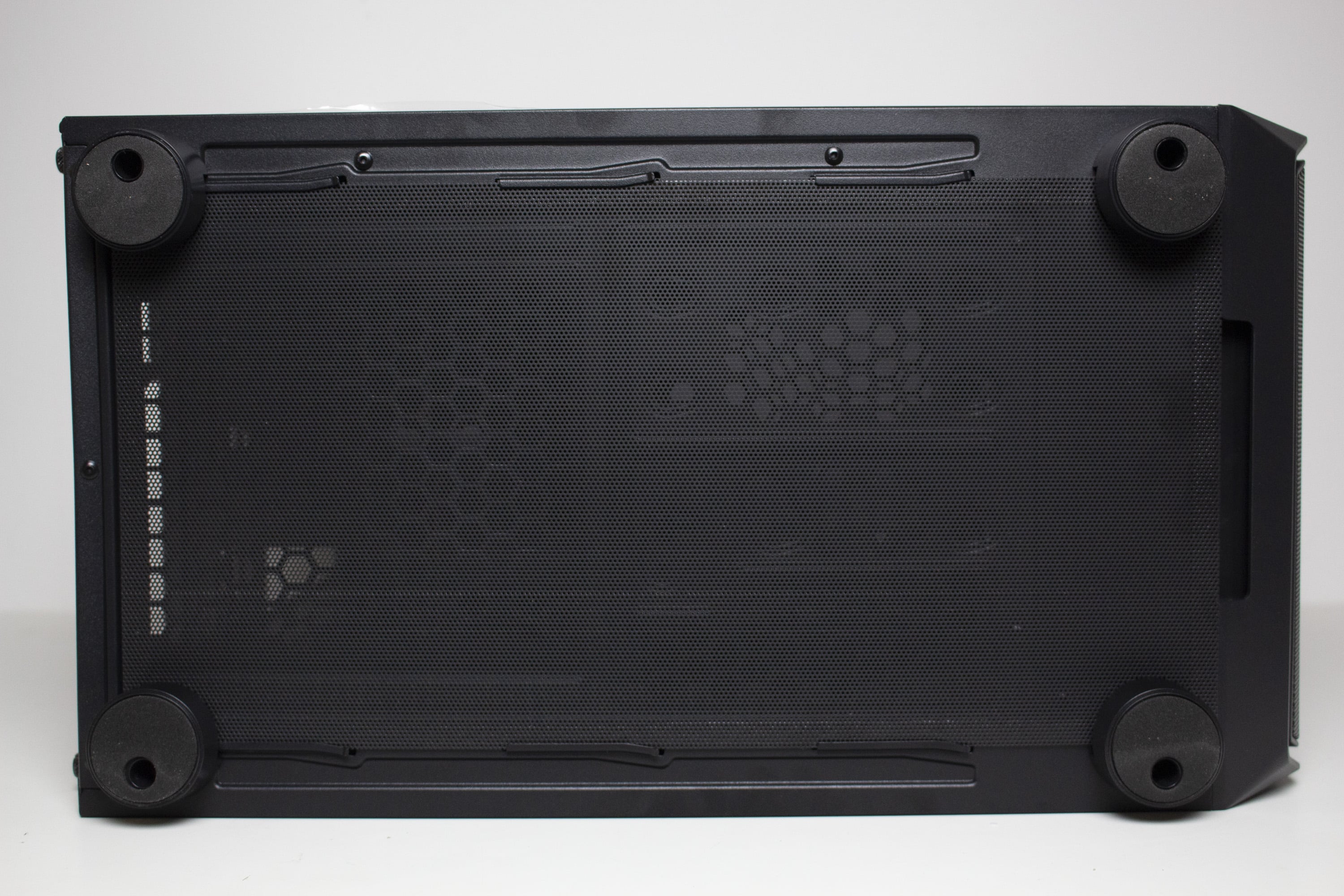 Die Unterseite wird von einem großflächigen Belüftungsgitter dominiert. Anders als in der Front ist es im Boden aber deutlich gröber perforiert. Die Perforation soll dafür sorgen, dass das Netzteil von unter dem Gehäuse ausreichend Frischluft ansaugen kann. Für ausreichend Abstand zwischen Gehäuse und Boden verbaut ENDORFY vier große Standfüße aus schwarzem Kunststoff. Zum Schutz des Untergrundes wurden diese Füße jeweils mit einer Schicht Moosgummi beklebt.