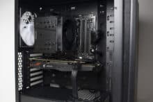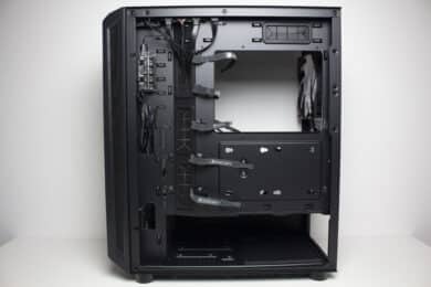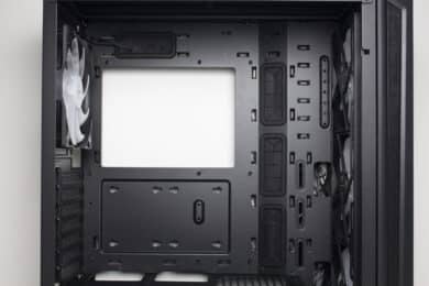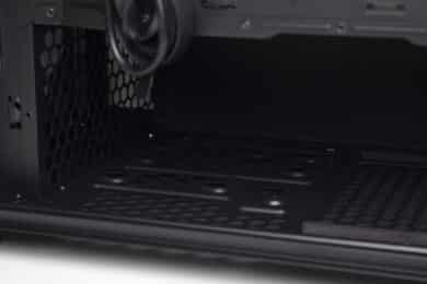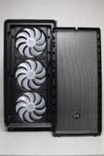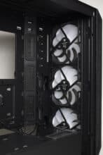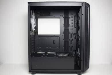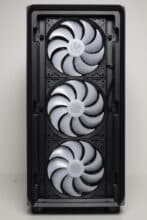 Im vorderen Bereich können die drei vorinstallierten Gehäuselüfter ungehindert Luft in den Innenraum befördern. Die warme Luft wird dann an der Rückseite durch den vierten vorinstallierten 140-mm-Lüfter wieder ausgeblasen. Für weitere Lüfter oder einen Radiator gibt es im Deckel oder der Front ausreichend Platz.