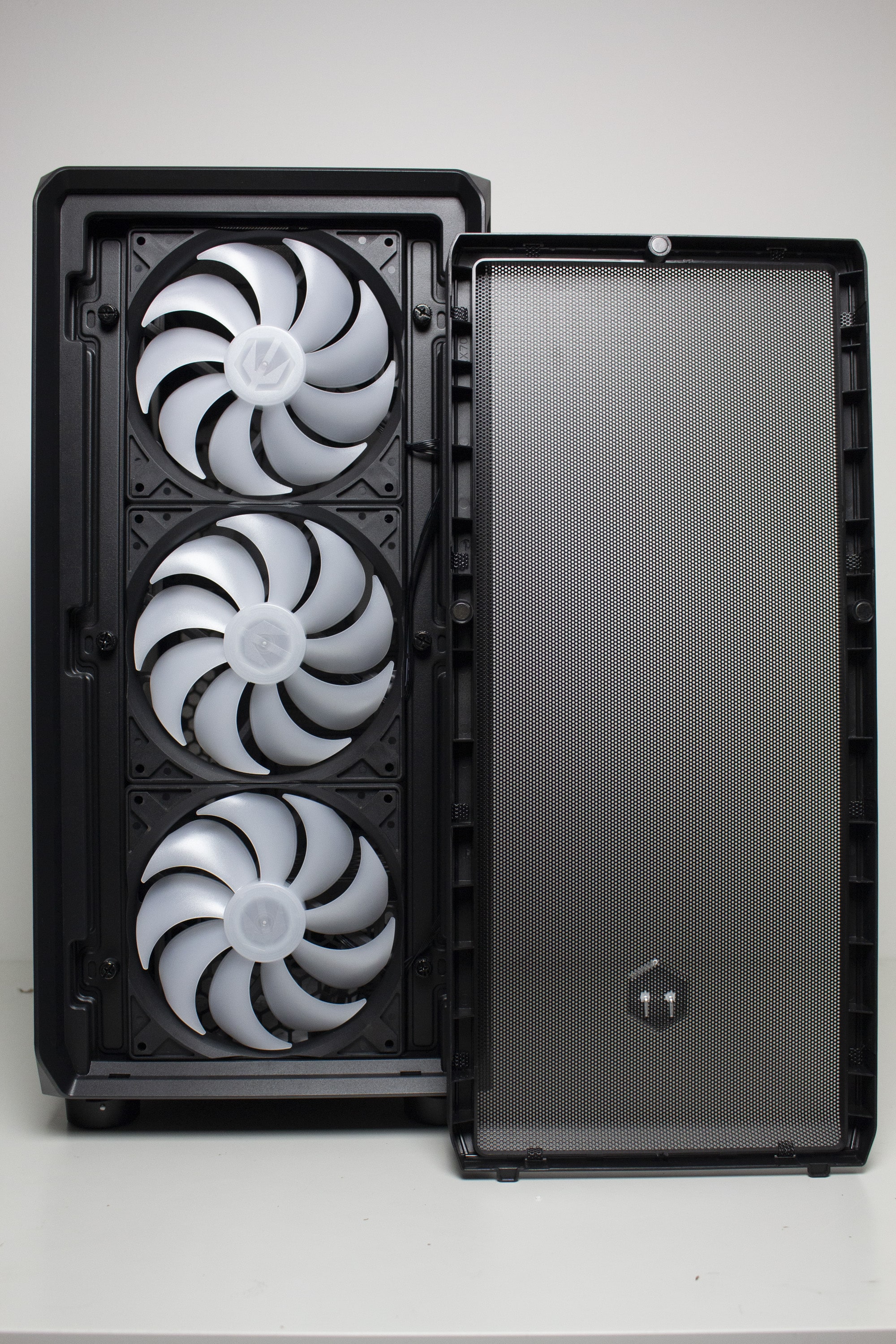 Auf den ersten Blick gibt es zwischen dem Arx 700 und Arx 500 äußerlich keinen Unterschied. Auch beim Arx 500 dominiert in der Front ein großes Meshgitter, welches von einem Kunststoffrahmen umrandet ist, in den zusätzliche Magnete eingearbeitet wurden. Dadurch kann das Meshpanel einfach entfernt und gereinigt werden. Außerdem erhält man einen klaren Blick auf die drei vorinstallierten 140-mm-Lüfter mit ARGB-Beleuchtung.