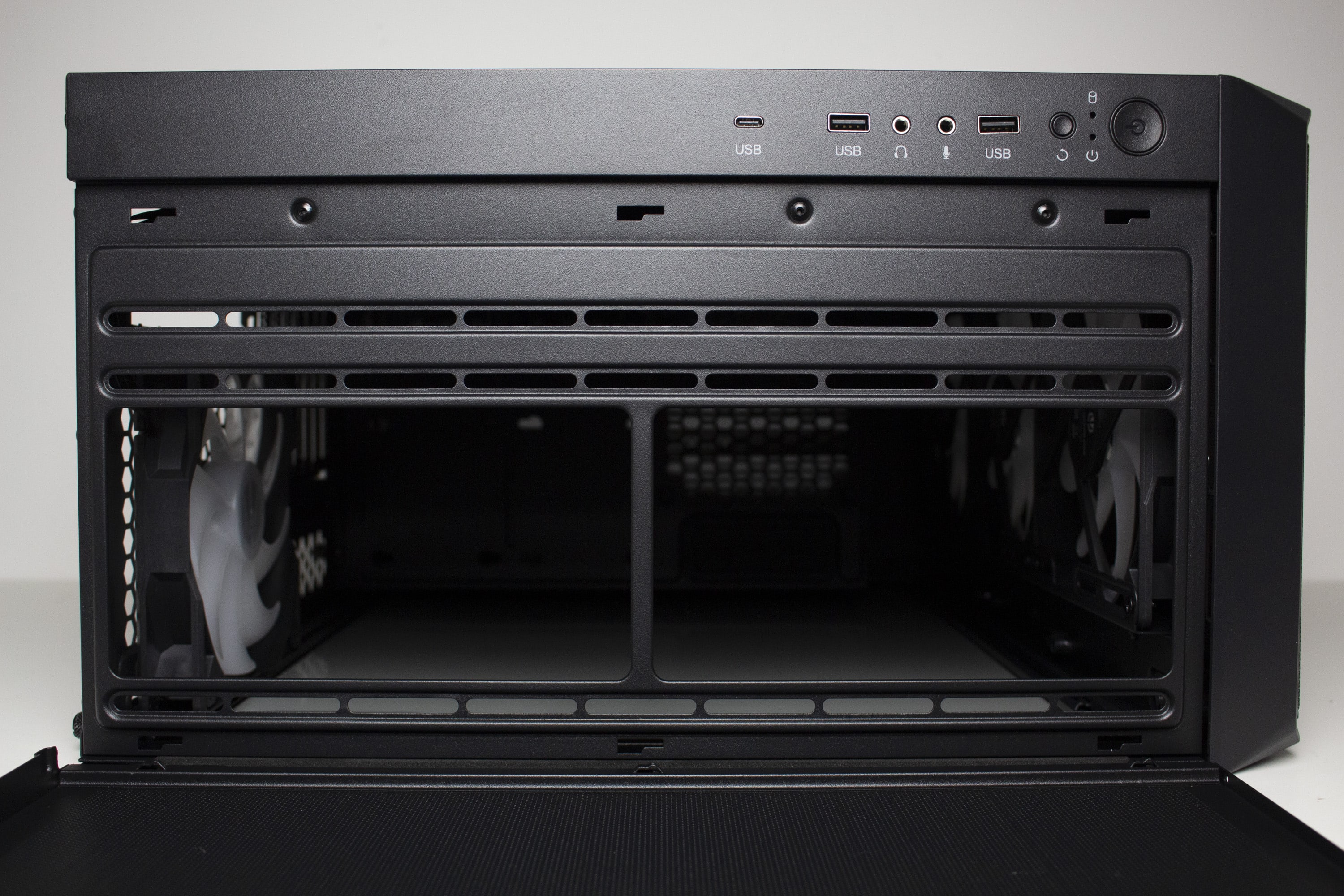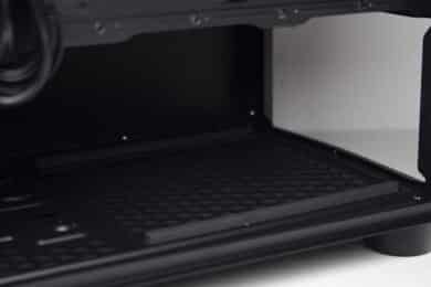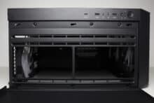 Ein weiterer Kunststoffrahmen schließt bündig mit den Seiten sowie dem Deckel ab und wurde mit weiteren Belüftungsöffnungen ausgestattet. Einen zusätzlichen Staubfilter gibt es an der Front leider nicht.