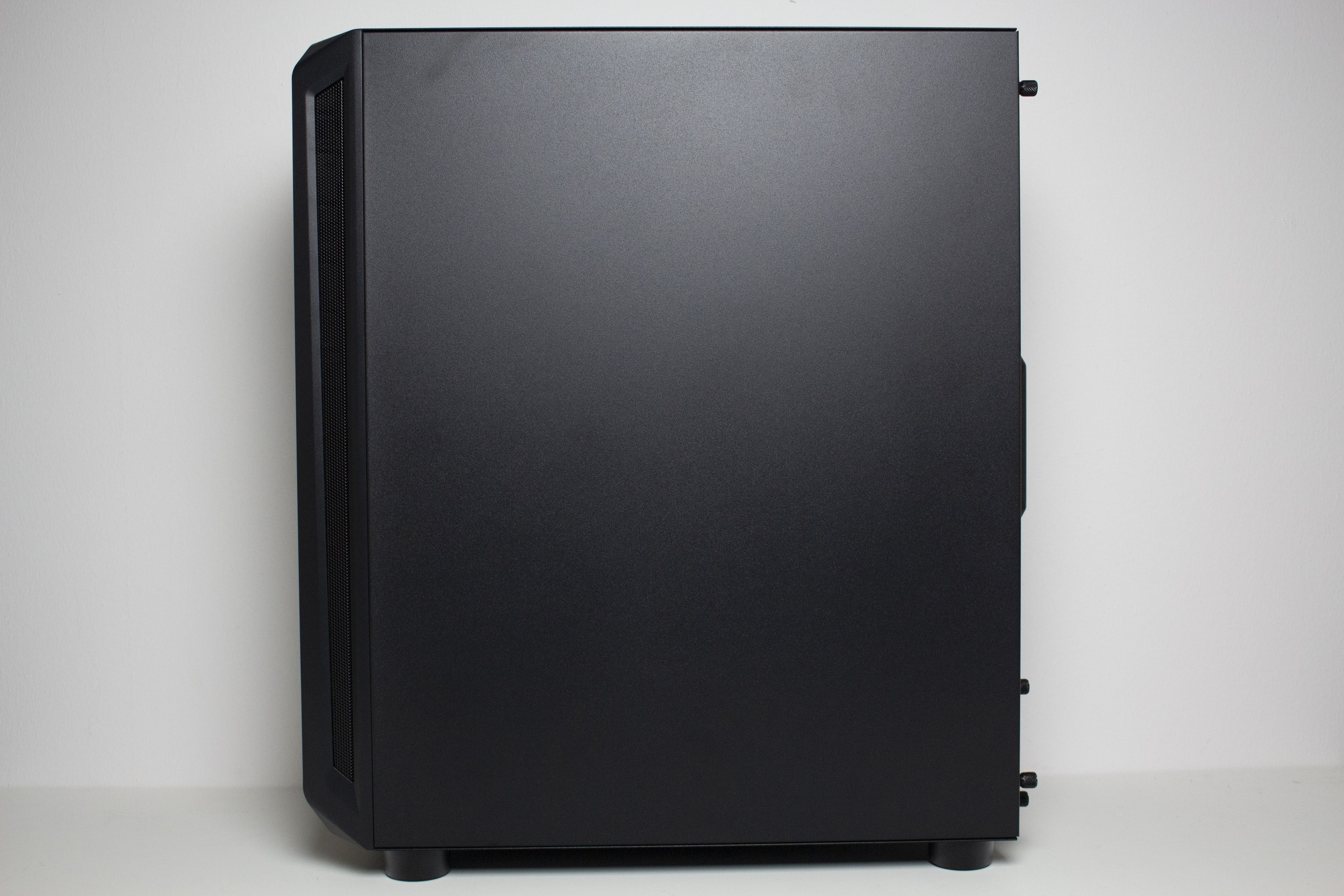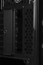 Das linke Seitenteil des Arx 500 besteht aus Hartglas und wurde nicht verdunkelt. Das ermöglicht einen ungetrübten Blick ins Innere. Zur Erleichterung der Demontage wurde die Scheibe zudem auf einen Stahlrahmen geklebt, der am Heck mit zwei Rändelschrauben befestigt wird. Das rechte Panel besteht aus normalem Stahl, kann eine ausreichenden Stabilität vorweisen und wurde ebenfalls mit Rändelschrauben ausgestattet. Zudem verfügt es über einen Griffmulde am hinteren Ende.