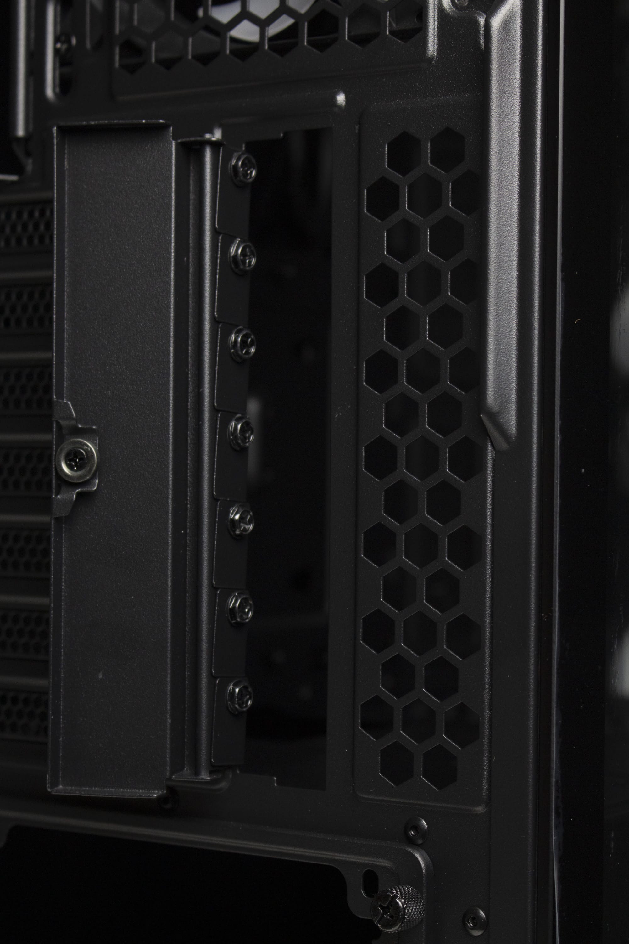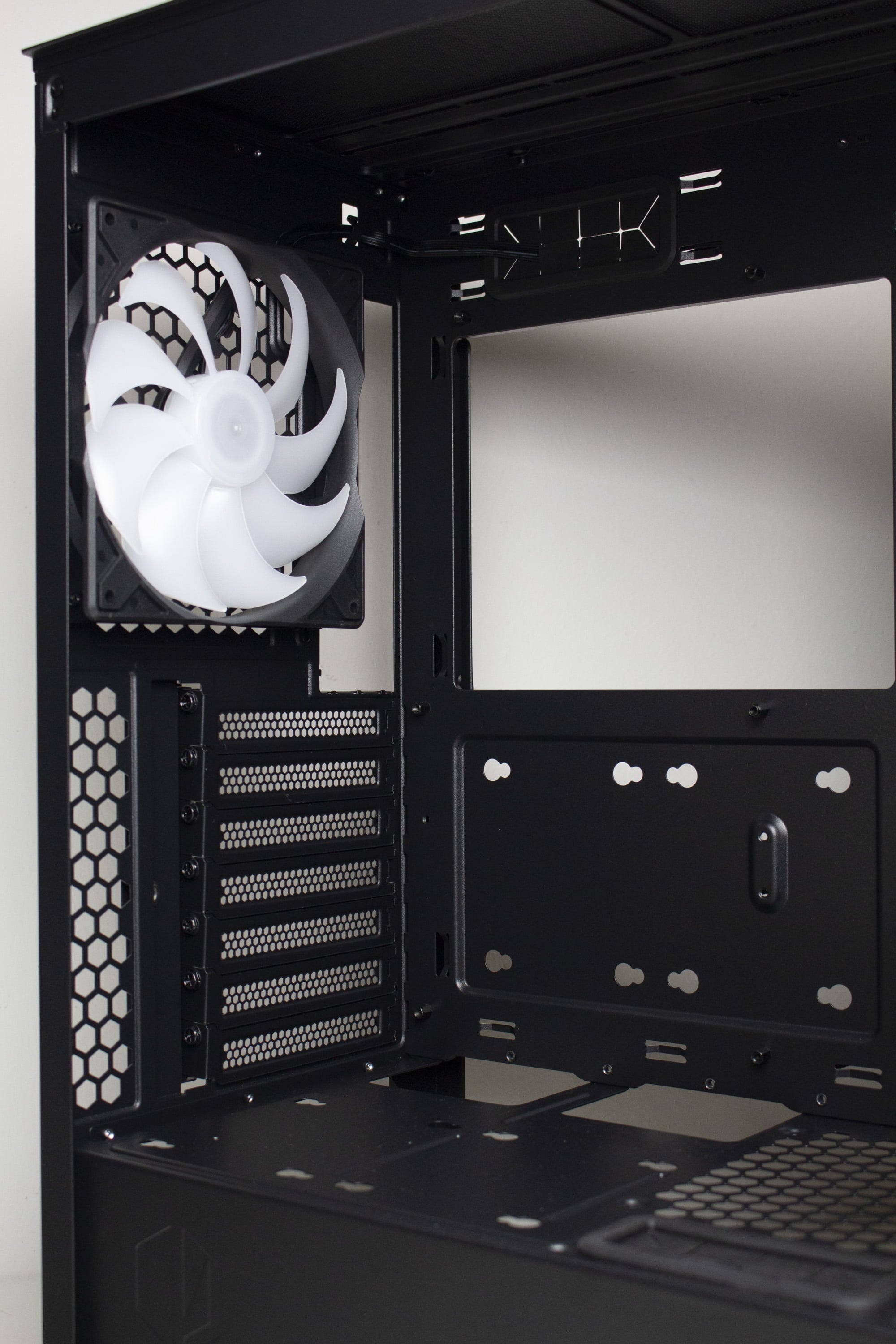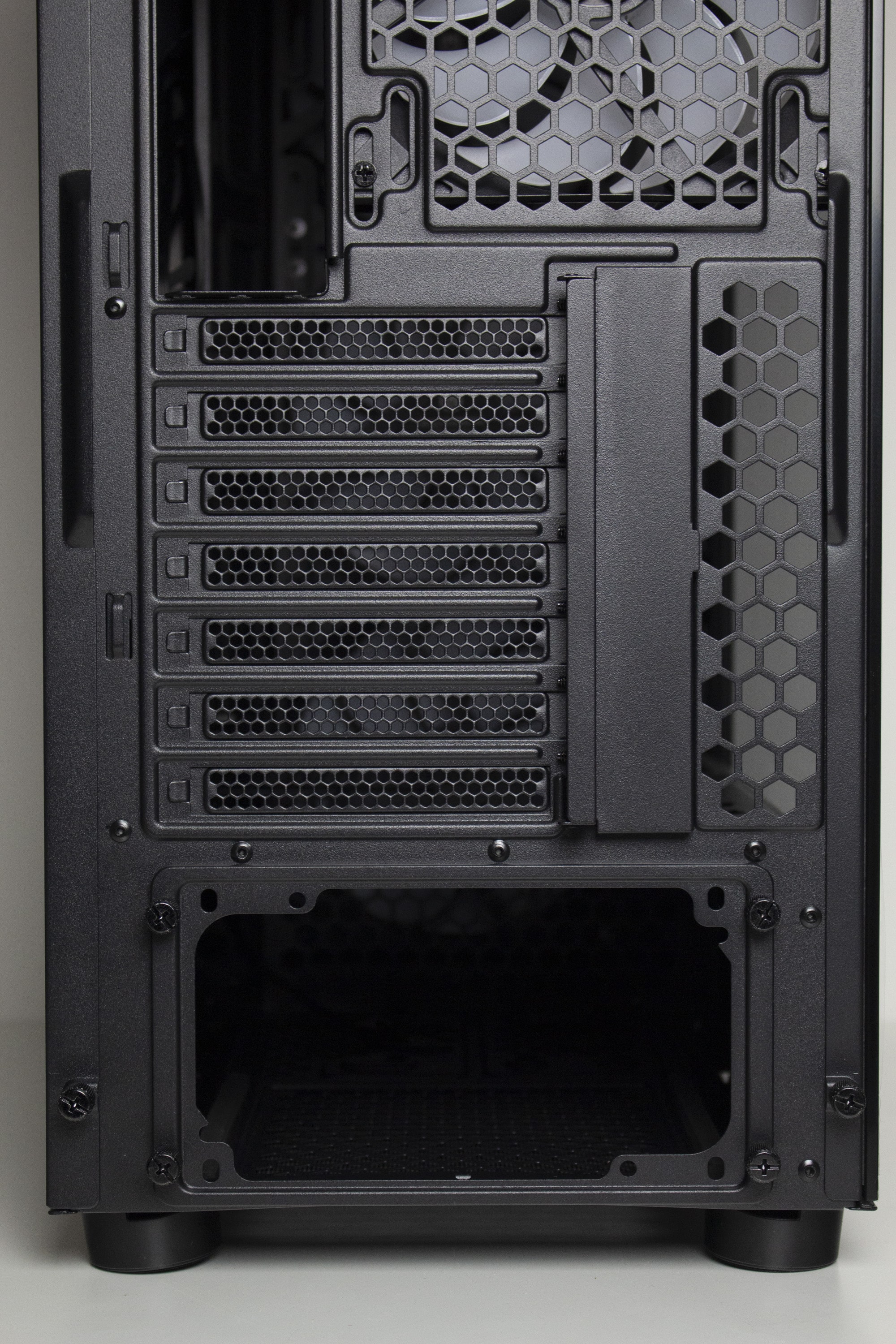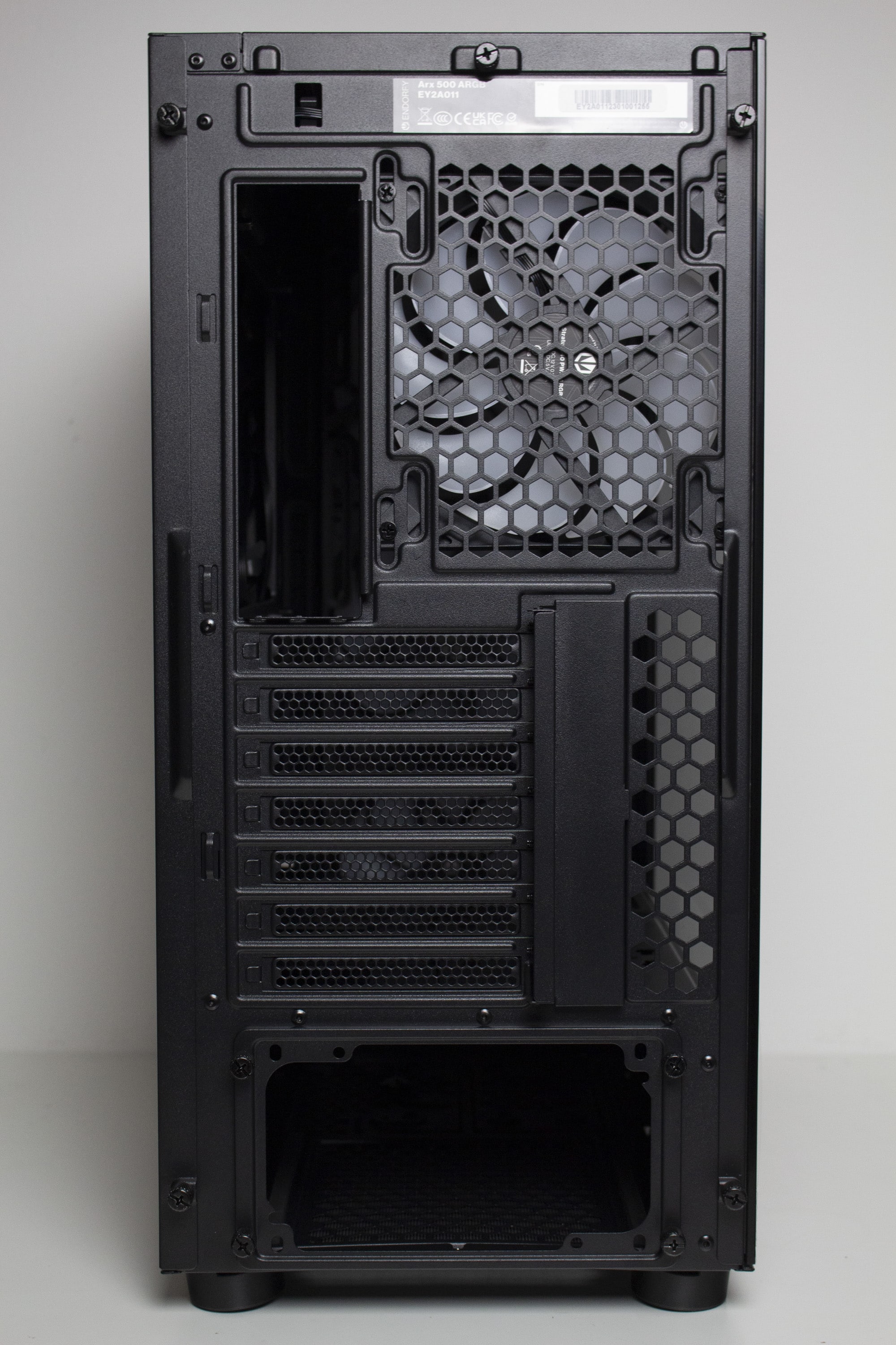 Die Gestaltung der Rückseite ist identisch zum Arx 700. Im unteren Bereich finden wir eine Öffnung für die Rückseite des Netzteils. Darüber hat ENDORFY sieben wiederverwendbare Slotblenden platziert, die außerhalb des Gehäuses verschraubt werden müssen. Die dazugehörige Abdeckung verfügt über einen Magneten. Oberhalb der Slotblenden lässt sich zuletzt noch der vierte 140-mm-Lüfter mit ARGB-Beleuchtung erkennen.