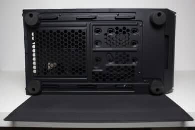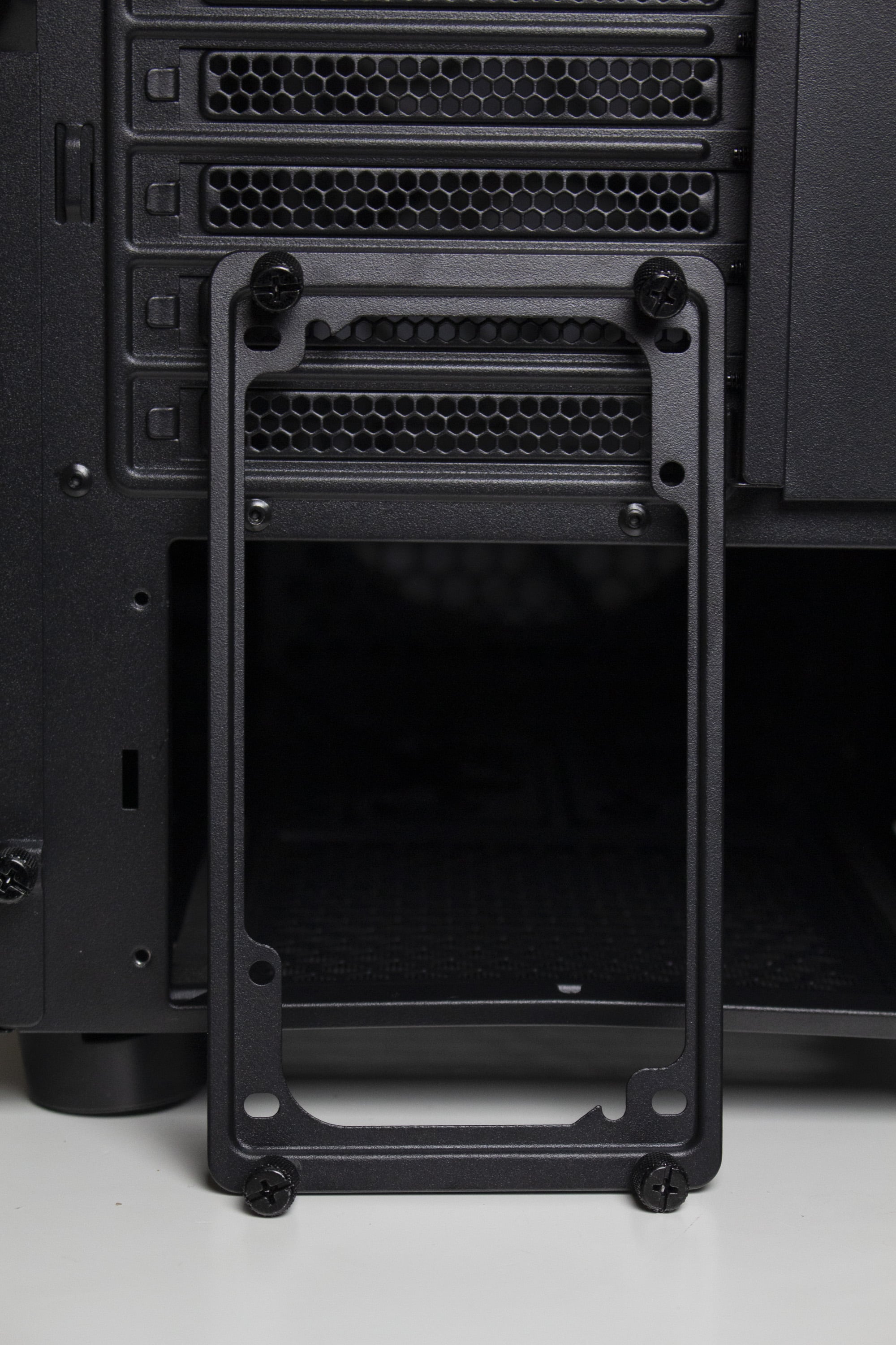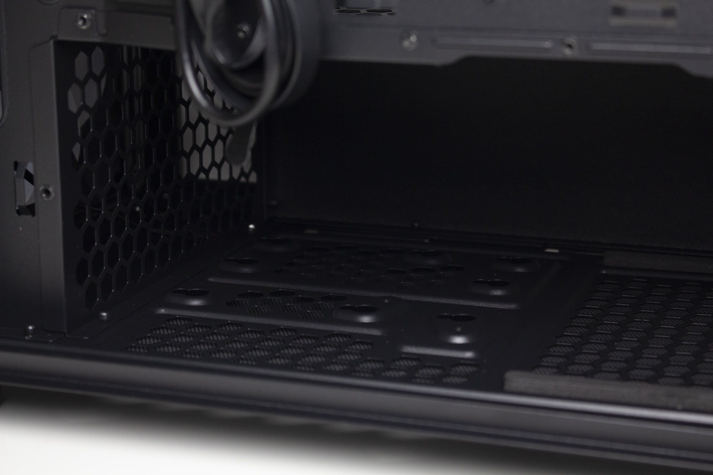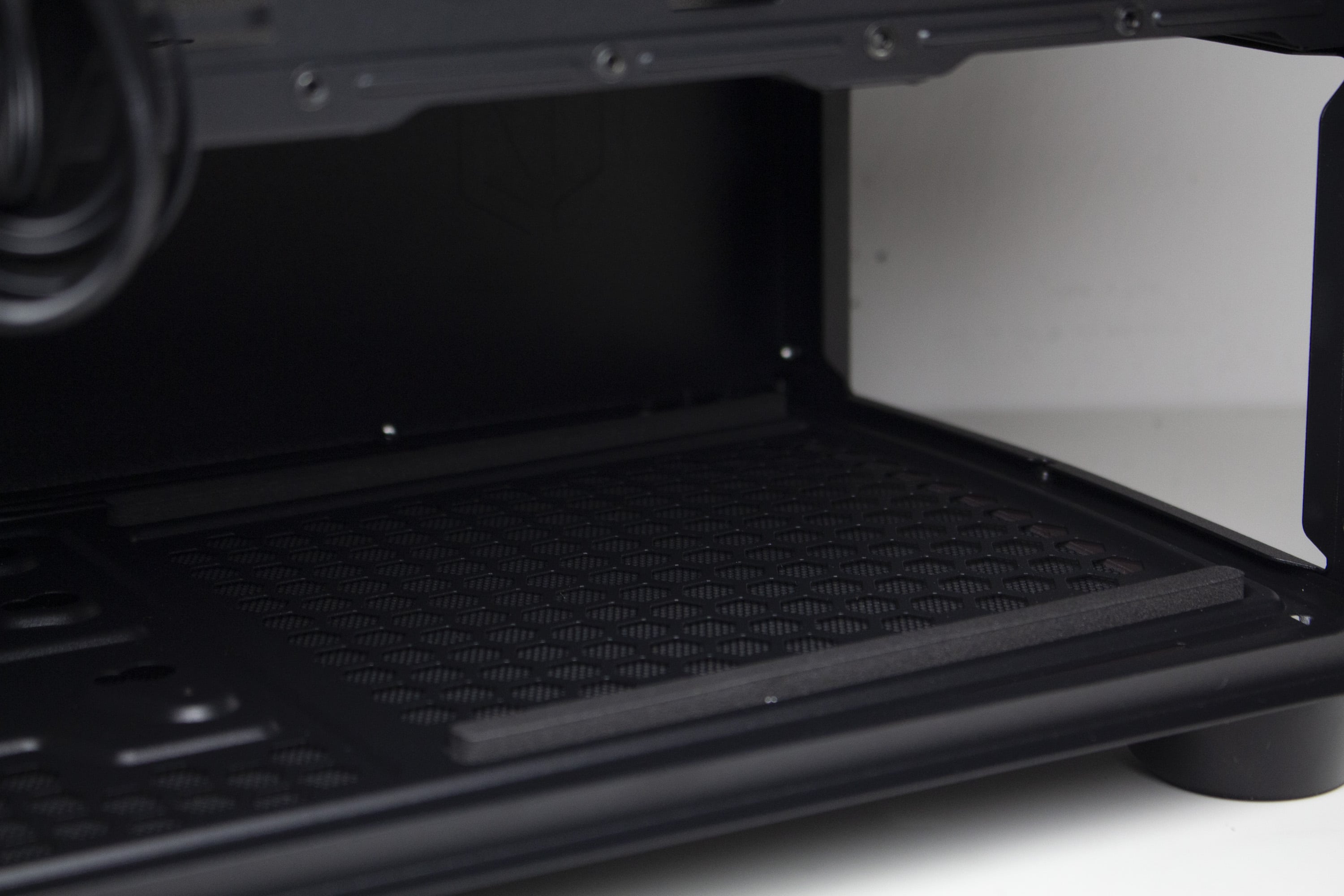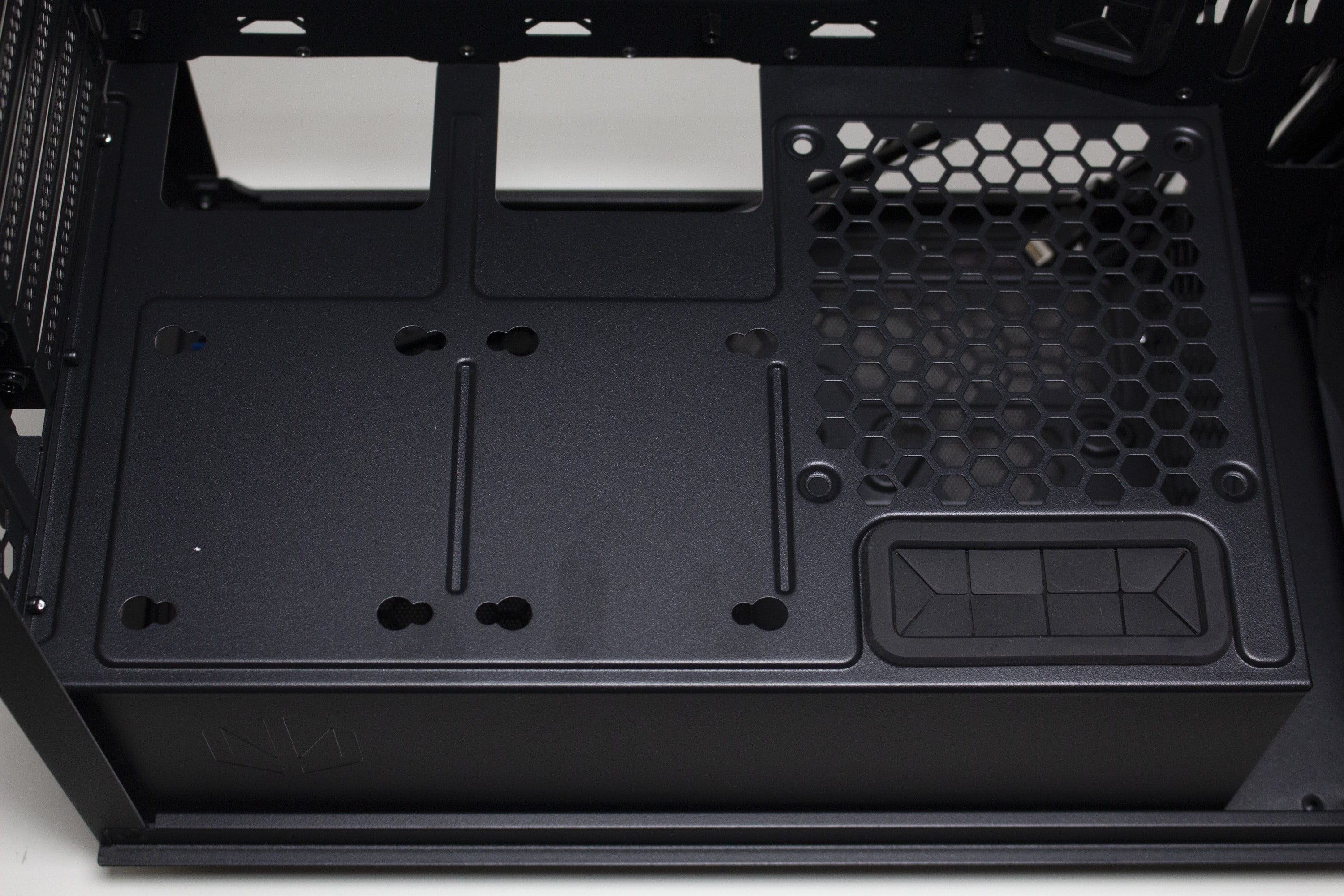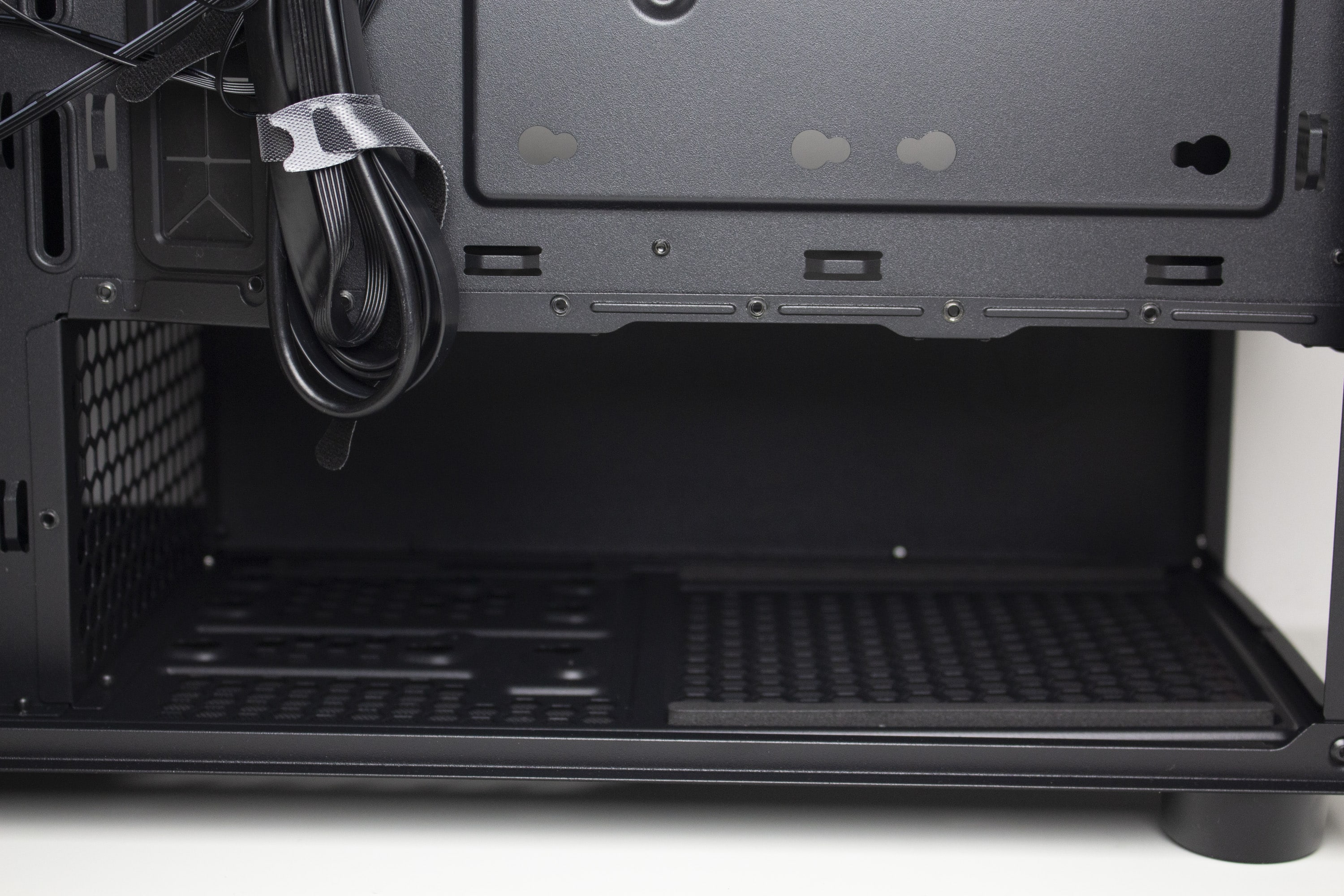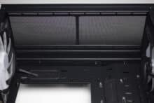 Im unteren Bereich finden wir die integrierte Netzteilabdeckung des Arx 500. Sie soll insgesamt die Optik aufwerten, indem das Netzteil, die Datenträger und sämtliche Kabel darunter versteckt werden können und dadurch der PC deutlich aufgeräumter aussieht. Zusätzlich lassen sich an der Oberseite drei weitere Öffnungen für Kabel finden, von denen eine ebenfalls gummiert ist. Interessant ist außerdem die Platzierung eines Montagplatzes für einen 120-mm-Lüfter. Ebenfalls perforiert ist die Vorderseite der Abdeckung, die zur Gehäusefront zeigt.
