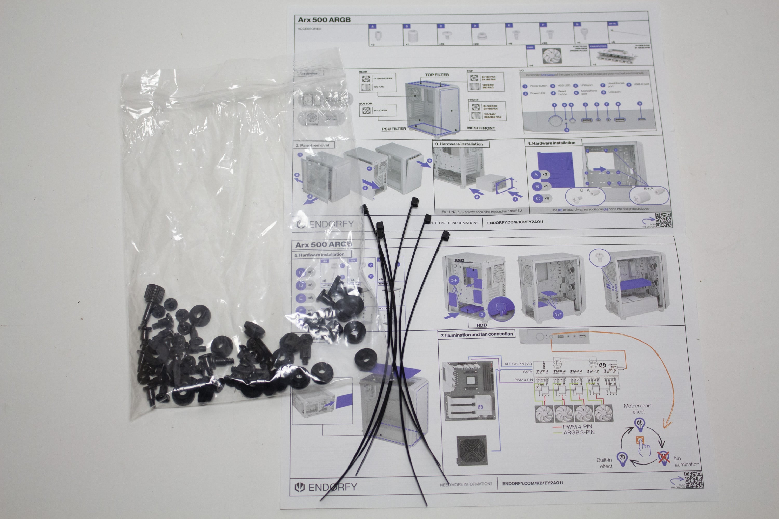 Für das Zubehör platziert ENDORFY einen Kunststoffbeutel hinter dem Mainboard-Tray. Der Beutel beinhaltet neben Kabelbindern auch alle notwendigen Montageschrauben sowie Gummientkoppler für die HDD-Montage. Weiterhin verbaut der Hersteller insgesamt vier 140-mm-ARGB-Lüfter sowie eine PWM- bzw. RGB-Steuerplatine und einen Staubfilter für den Gehäuseboden. Wie auch schon beim Arx 700, verzichtet ENDORFY beim Arx 500 auf die Beilage von Netzteilschrauben, da diese in der Regel dem Netzteil beiliegen.
