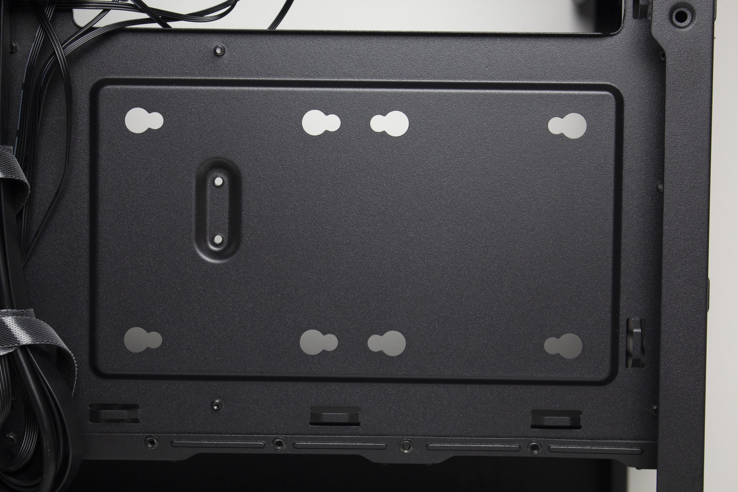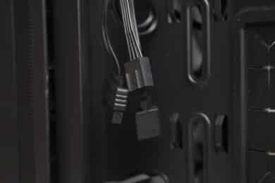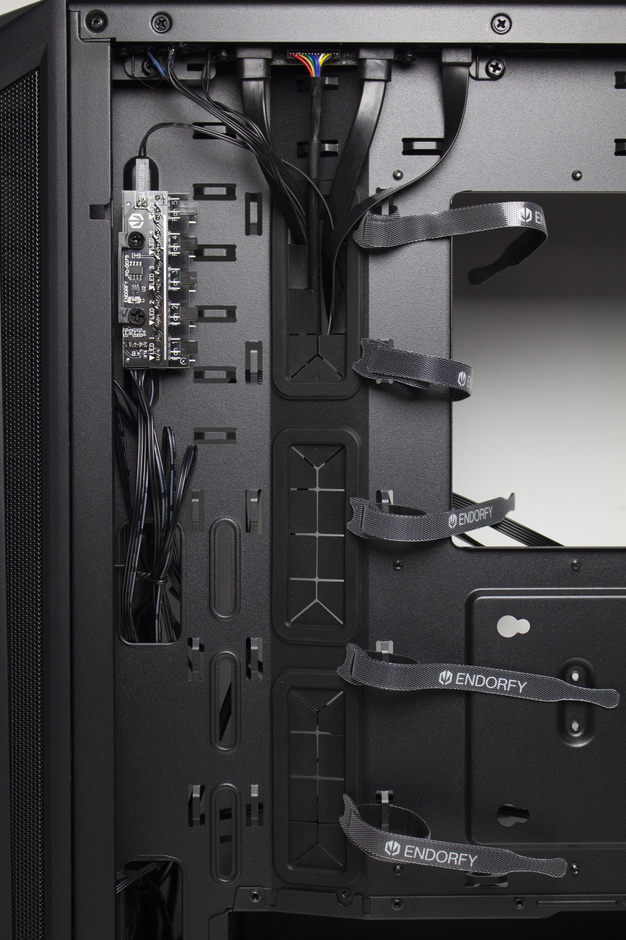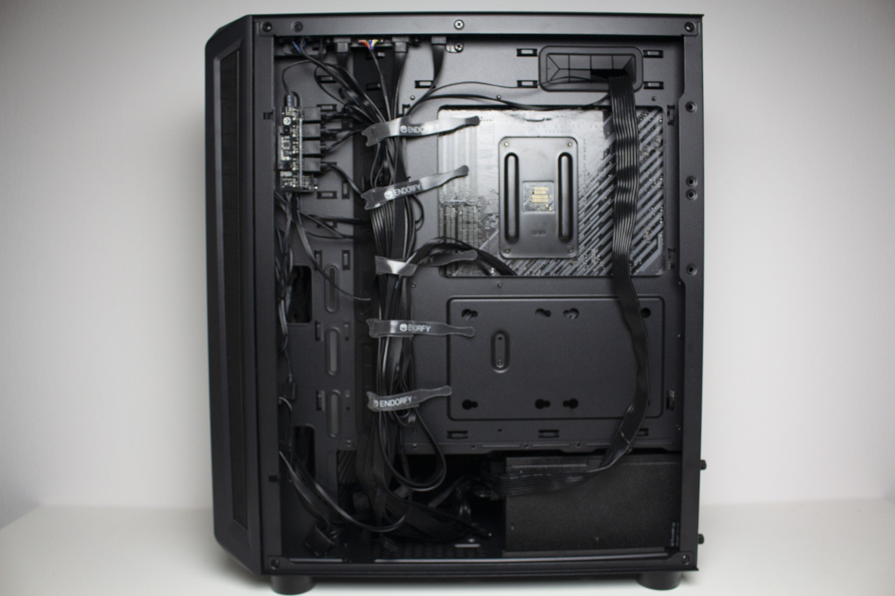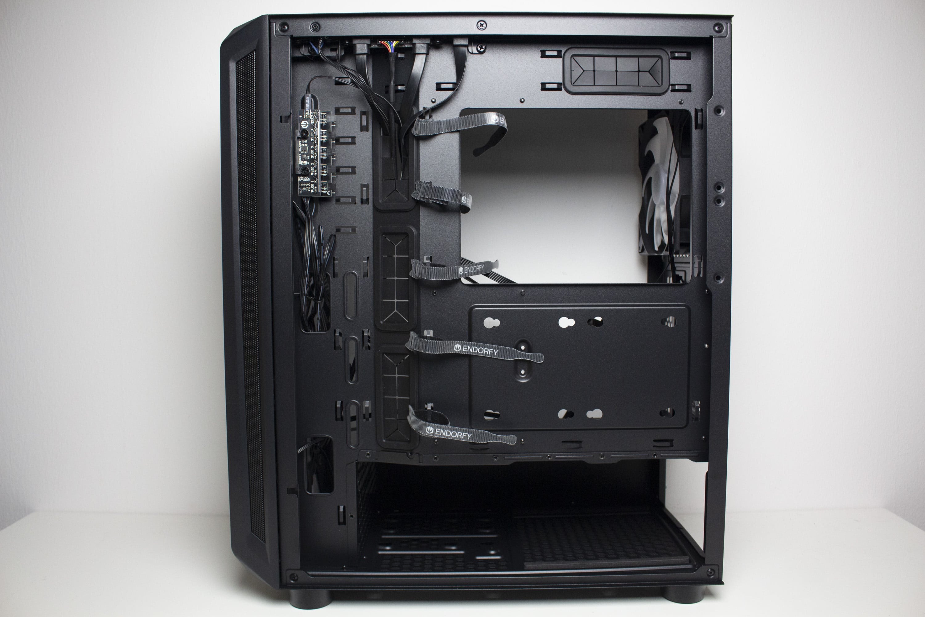 Ansonsten gibt es an der Rückseite viel Platz für Kabel. Besonders der Kabelkanal auf der linken Seite bietet mehr als genug Stauraum für dickere Kabelstränge. Um das Kabelbündel auch ordentlich verzurren zu können, spendiert ENDORFY dem Arx 500 einige wiederverwendbare Kabelbinder mit Klettverschluss. Weiterhin hat der Hersteller zahlreiche Stahlösen in das Mainboard-Tray gestanzt. Zuletzt verfügt das Tray noch über einen Ausschnitt für Backplates von großen CPU-Kühlern.