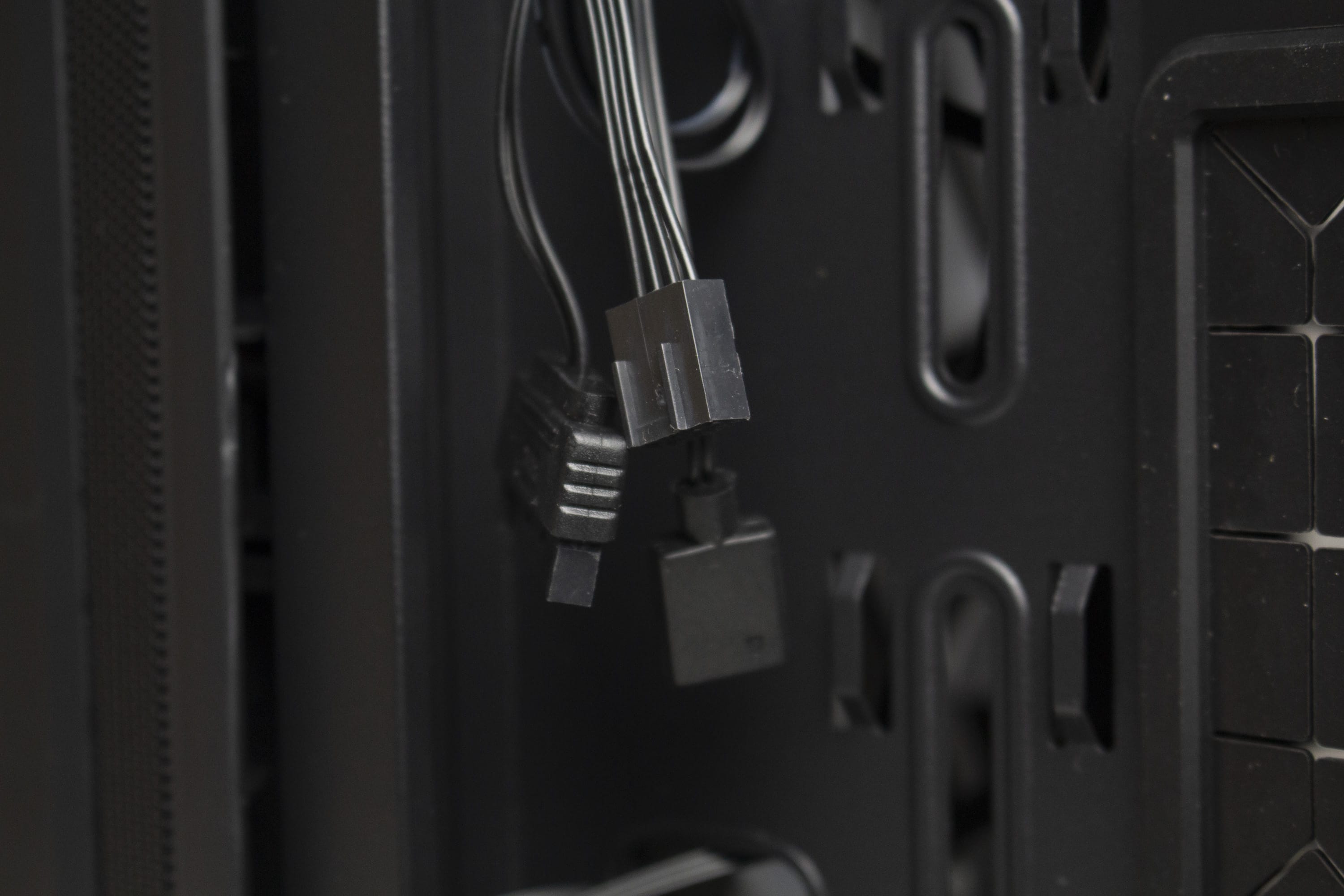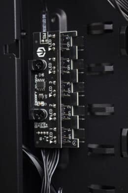 Wie bereits erwähnt, verfügt das Arx 500 ARGB über vier vorinstallierte Gehäuselüfter mit ARGB-Beleuchtung. Alle Lüfter sind ab Werk mit der PWM- und ARGB-Steuerplatine auf der Rückseite verbunden. Die Platine verfügt insgesamt über jeweils 5 Anschlüsse für die PWM sowie ARGB-Steuerung und wird über einen SATA-Stecker vom Netzteil mit Strom versorgt. Die Verbindung mit dem Mainboard erfolgt ebenfalls direkt mit einem 3-Pin-5V-ARGB- oder 4-Pin-PWM-Stecker.