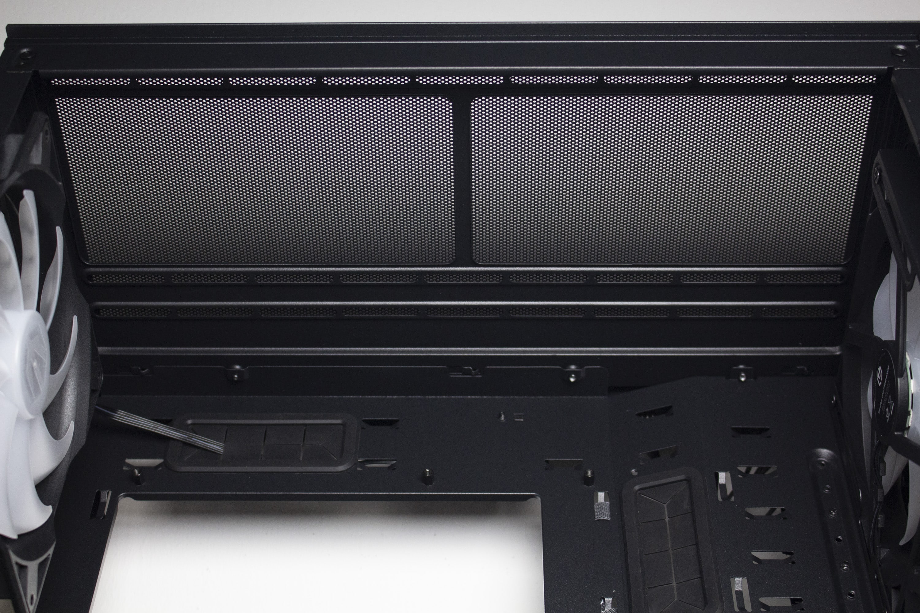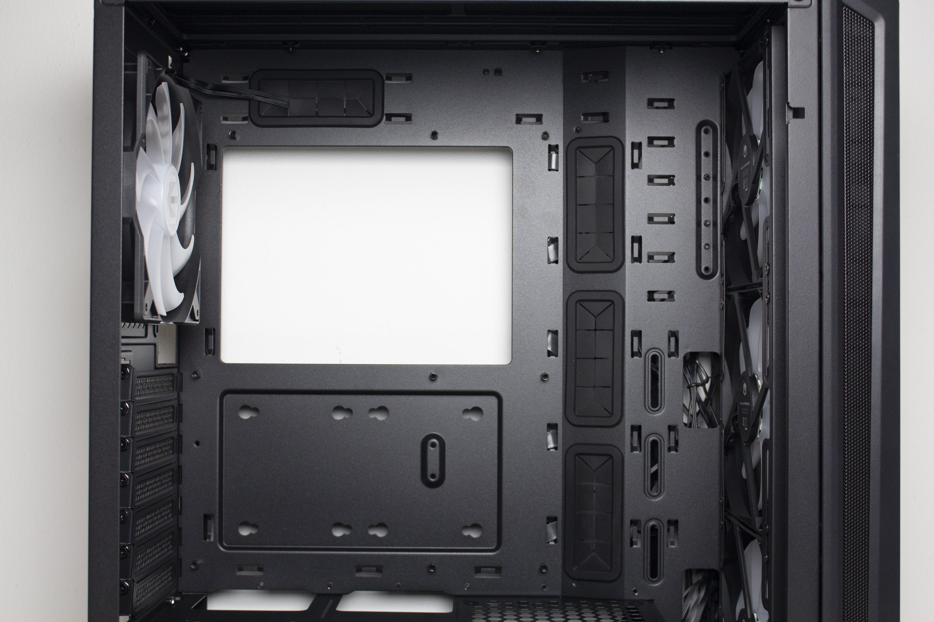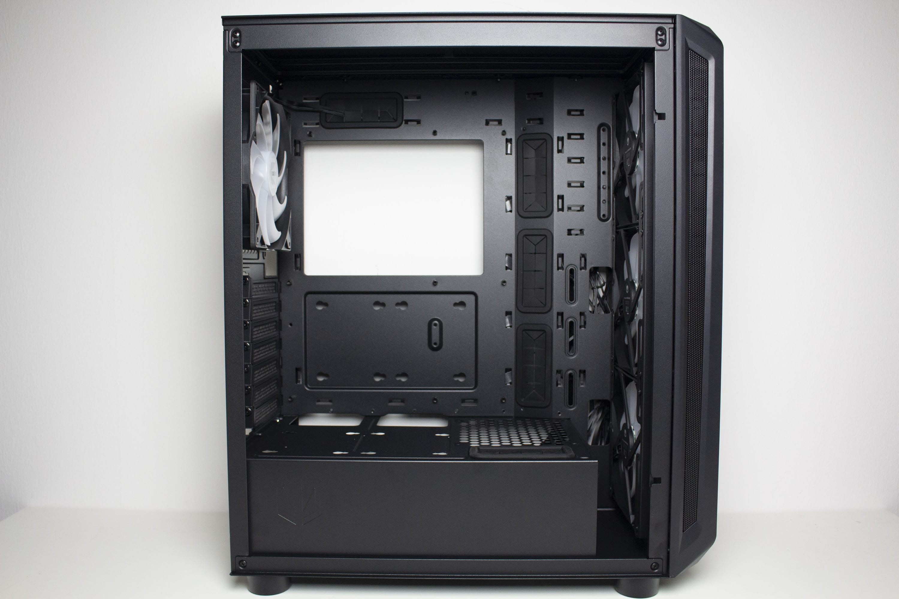 Der Innenraum des Arx 500 wurde analog zum Arx 700 aufgebaut, nur dass die freie Fläche zwischen den Frontlüfter und der Netzteilabdeckung verkleinert wurde. Grundsätzlich ist der Innenraum also auch in eine große sowie eine kleine Kammer unterteilt. Die große Kammer bietet Platz für ein ATX-Mainboard, verfügt über vorinstallierte Abstandshalter und vier große Kabelmanagement-Öffnungen, die zur Verbesserung der Optik mit Gummimanschetten ausgestattet wurden. Das plane Mainboard-Tray ist an der rechten Seite angewinkelt verläuft in den breiten Kabelkanal hinter dem Tray.