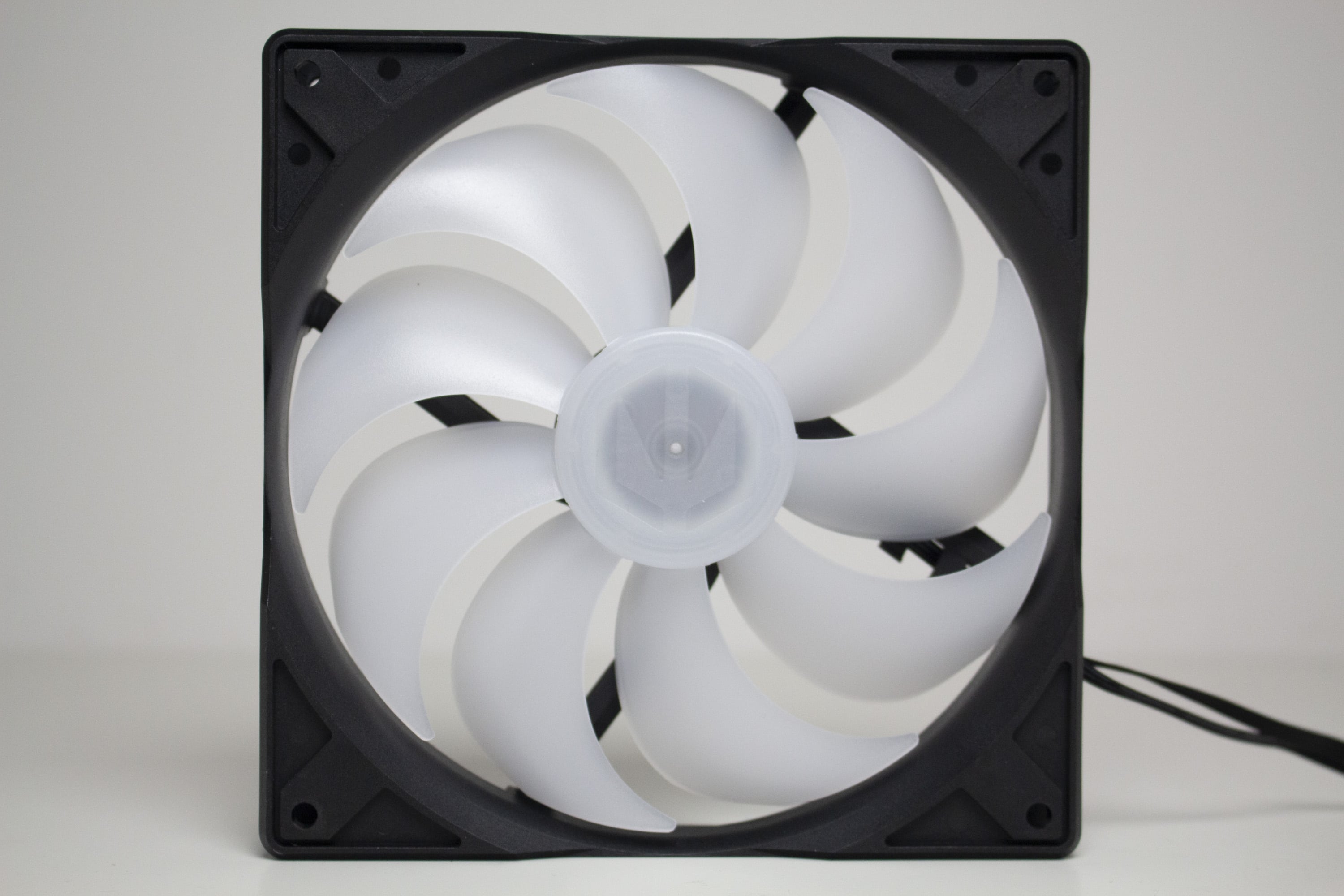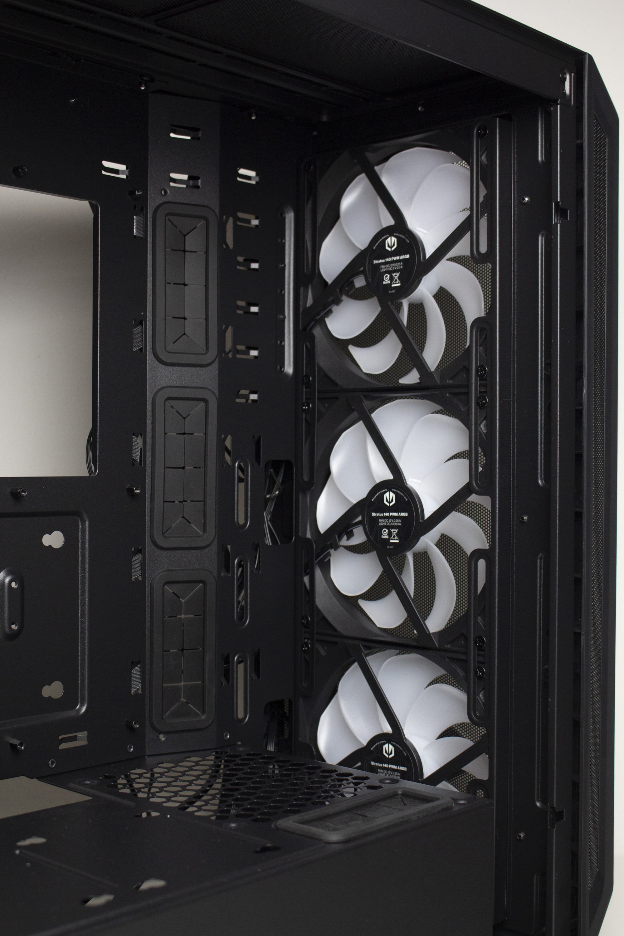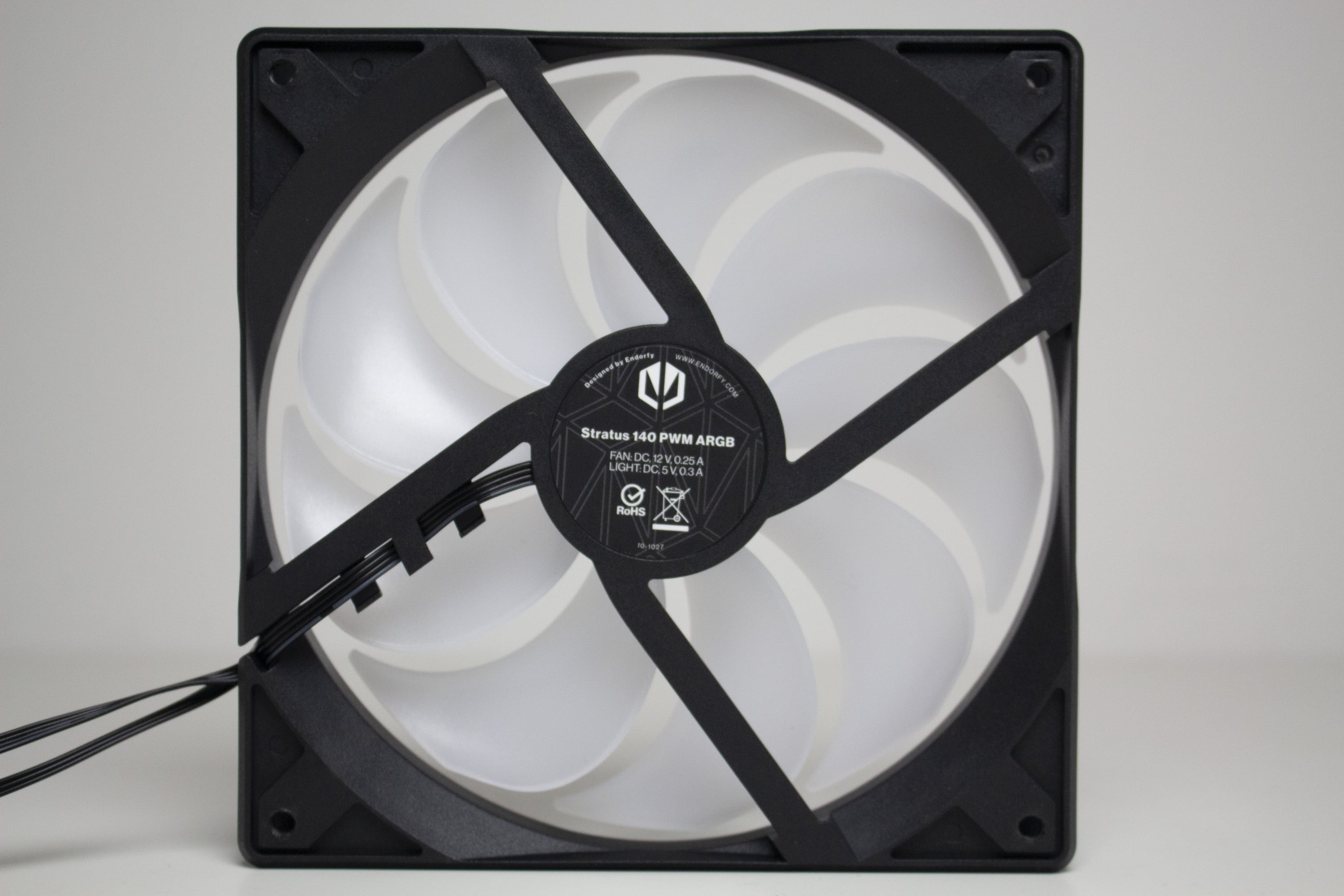 Ab Werk kommt das Arx 500 ARGB in unserem Test mit vier vorinstallierten 140-mm-ARGB-Lüftern vom Typ Stratus 140 PWM ARGB, die ebenfalls zu ENDORFYs Portfolio gehören. Die Lüfter verfügen jeweils über einen 4-Pin-PWM-Anschluss für Strom sowie über einen 3-Pin-5V-ARGB-Header für die ARGB-Beleuchtung. Optisch hat der Hersteller die Lüfter mit einem schwarzen Rahmen sowie einem milchigen Rotor gestaltet, in dessen Lüfternabe die ARGB-LEDs platziert wurden. Der angegebene Drehzahlbereich liegt zwischen 200 und 1200 Umdrehungen pro Minute, wobei ein Lüfter maximal 3 Watt (12V bei max. 0,25A) verbraucht.