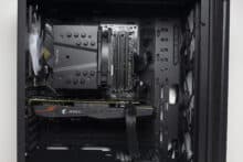 Wer viele Datenträger im Arx 500 verbauen möchte, der muss sich überwiegend auf 2,5″-HDDs bzw. SSDs beschränken. Hierfür bietet der Innenraum hinter dem Mainboard-Tray vier und auf der Netzteilabdeckung zwei weitere Montageplätze. Weiterhin gibt es vor dem Netzteil einen Montagepunkt für entweder eine 3,5″- oder 2,5″-Festplatte. Die Montage erfordert zwar Werkzeug, erfolgt aber entkoppelt über Gummiringe.