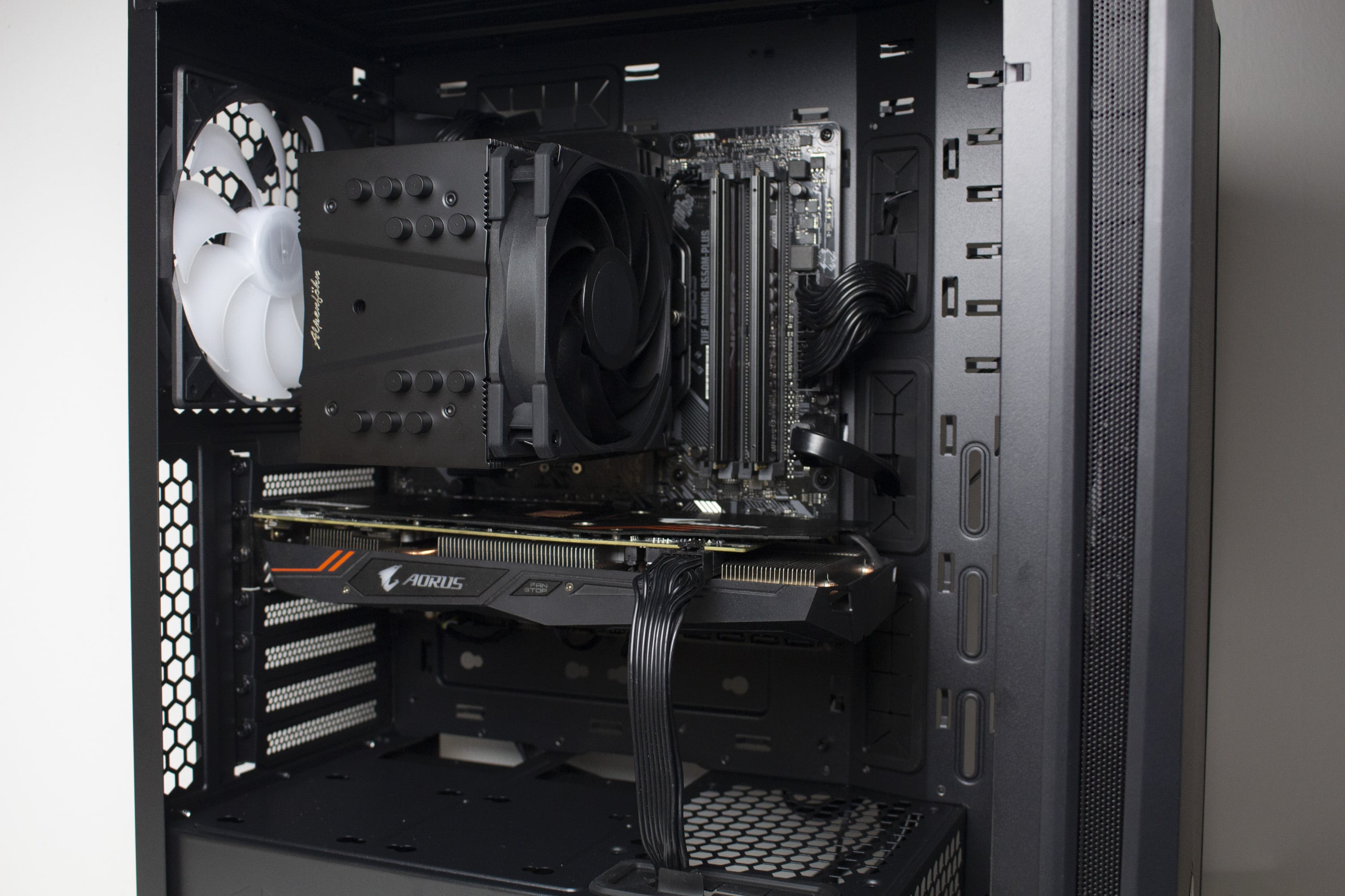 Nun kommen wir zum Systemeinbau beim ENDORFY Arx 500 ARGB Test. Als Hardware verwenden wir einen AMD Ryzen 5 1400* auf einem ASUS TUF Gaming B550M-Plus* mit 16GB Crucial Ballistix Sport LT grau DDR4-2666*. Der Ryzen wird von einem Alpenföhn Brocken 4* gekühlt und ist auf 3,8 GHz (1,175 V) übertaktet. Für die Bildausgabe ist eine Gigabyte AORUS GTX 1060 6GB zuständig. Die Stromversorgung erledigt das vollmodulare LC-Power LC550 V2.31 Platinum*.