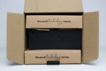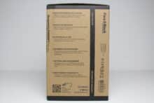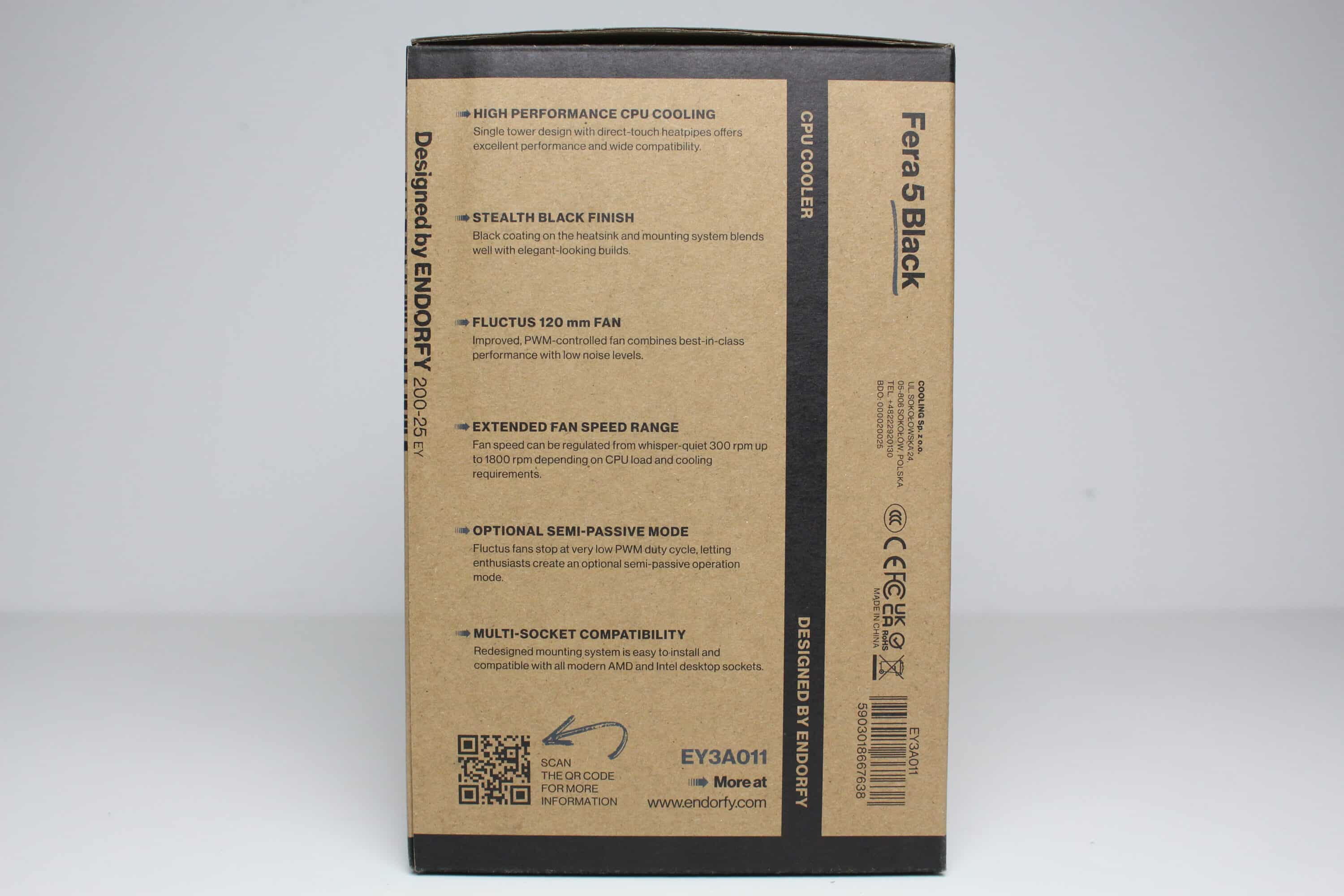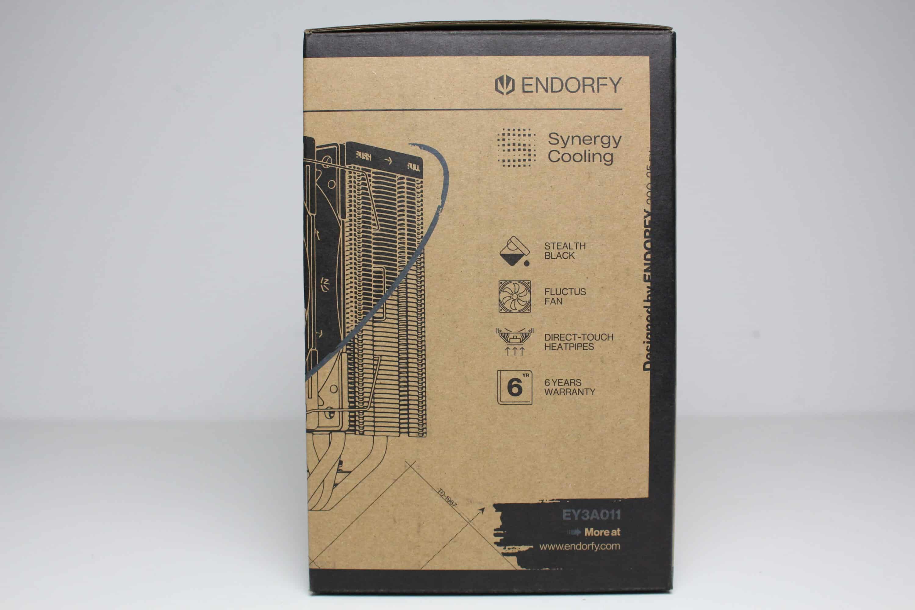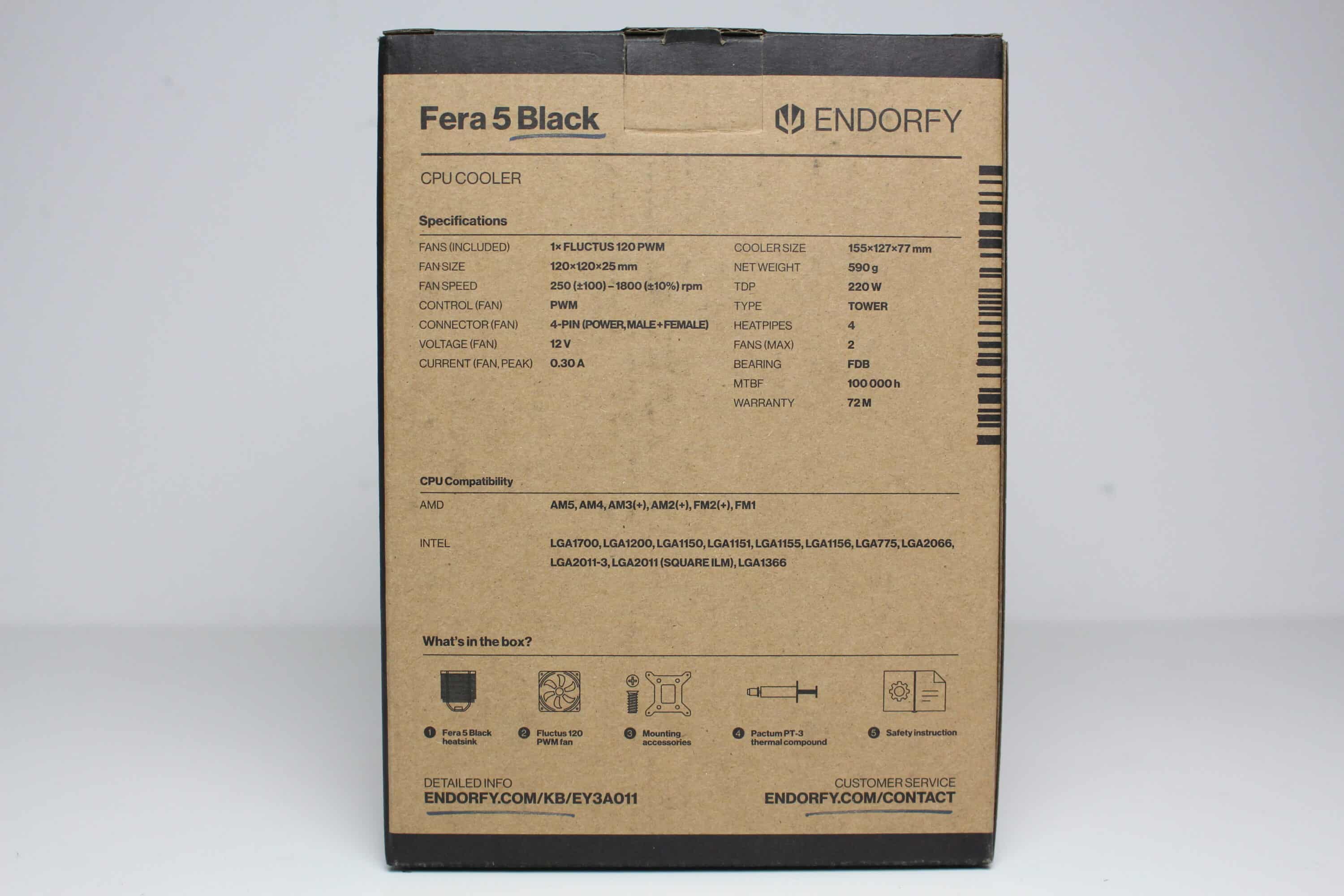 ENDORFY verpackt den Fera 5 Black in einem typisch gestalteten sowie kompakten Karton. Dieser besteht aus brauner Pappe und wurde fast ausschließlich mit schwarzer Tinte bedruckt. Wenige Elemente gestaltet der Hersteller aber in einem dunklen Blau-Grau. Neben einer schematischen Zeichnung des CPU-Kühlers finden wir auf dem Karton auch eine Tabelle mit den technischen Daten sowie eine Auflistung der wichtigsten Features.