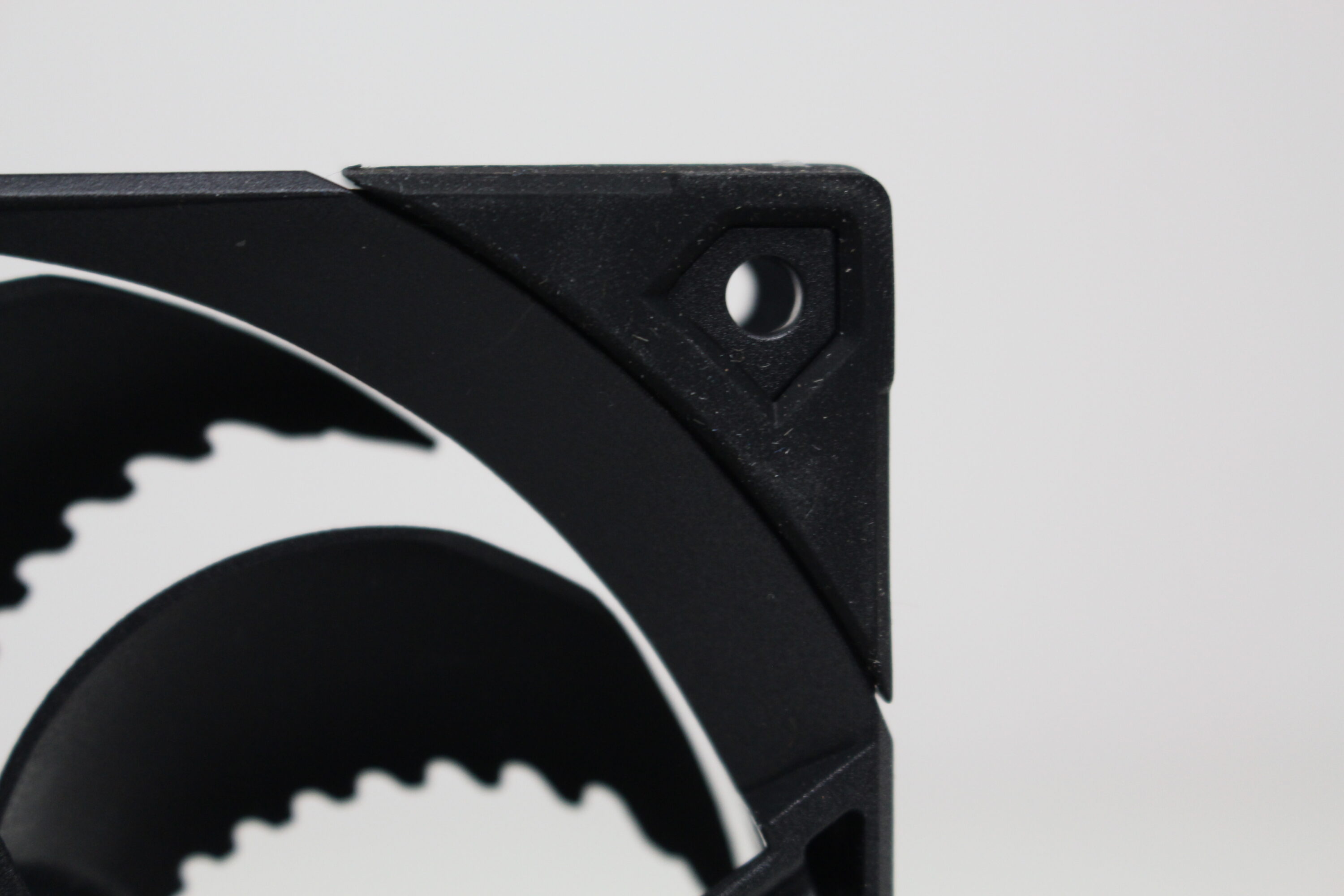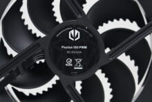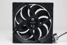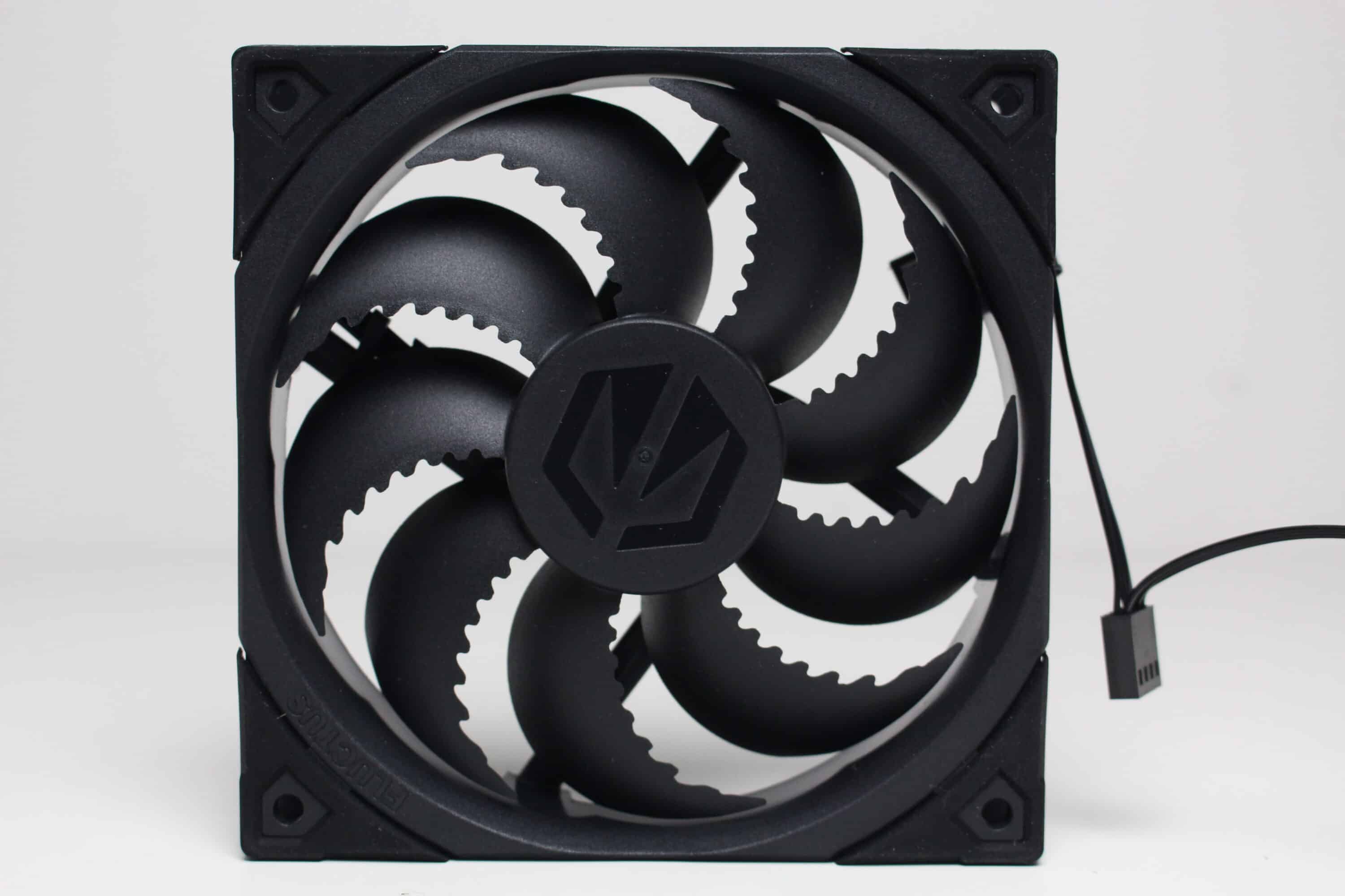 Der verbaute Lüfter ist vom Typ Fluctus 120 PWM, hat somit eine Rahmenbreite von 120 Millimetern und verfügt über neun gezackte Lüfterblätter. Zusammen mit dem FDB-Lager soll dieses Flügeldesign für eine angenehme Laufruhe sorgen. Die Lüfterblätter sowie der Rahmen sind vollständig schwarz gehalten und an allen acht Ecken sind Vibrationsdämpfer zu erkennen. Die Stromversorgung erfolgt über ein 4-Pin-PWM-Stecker, der auch gleichzeitig eine Y-Weiche eingebaut hat.