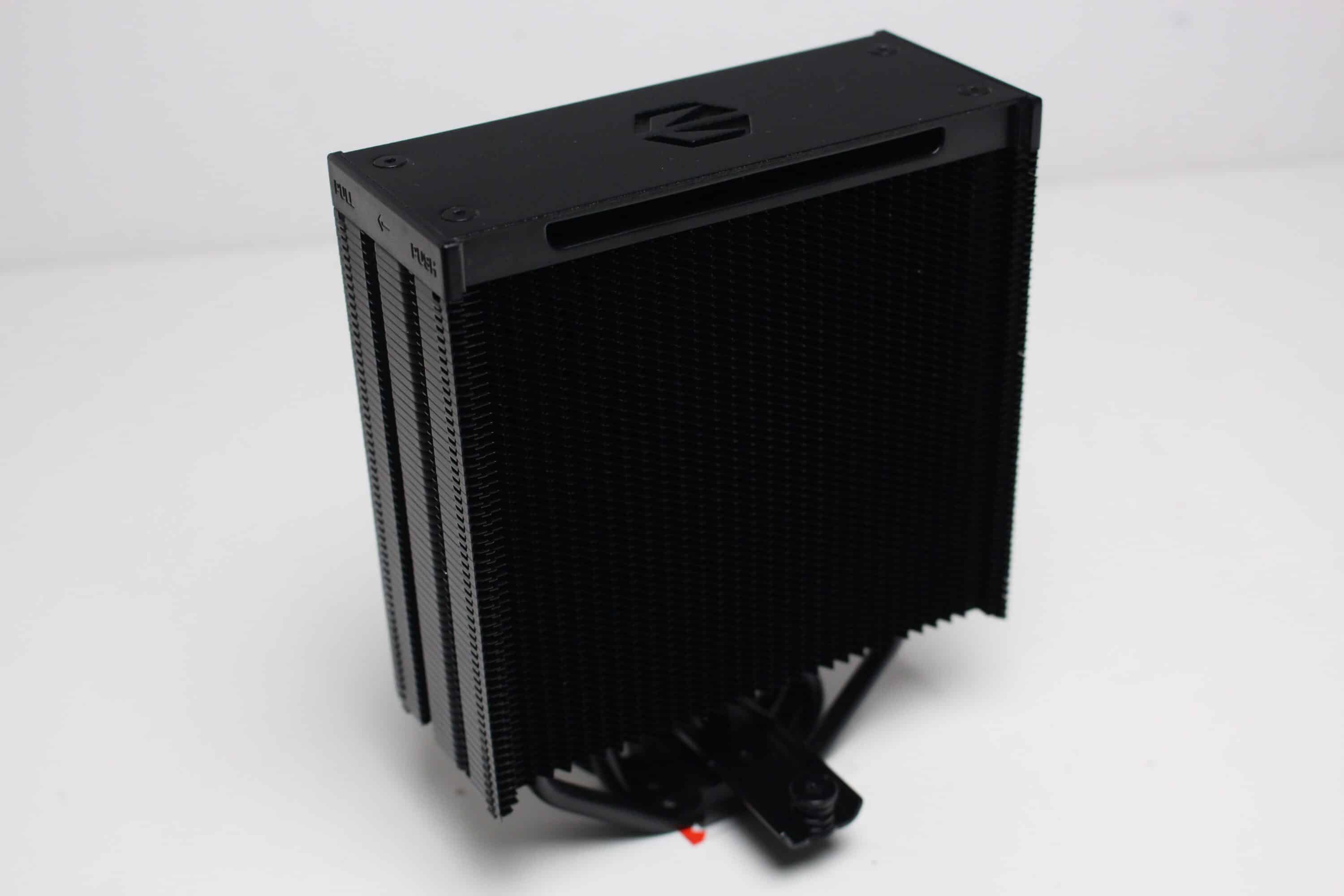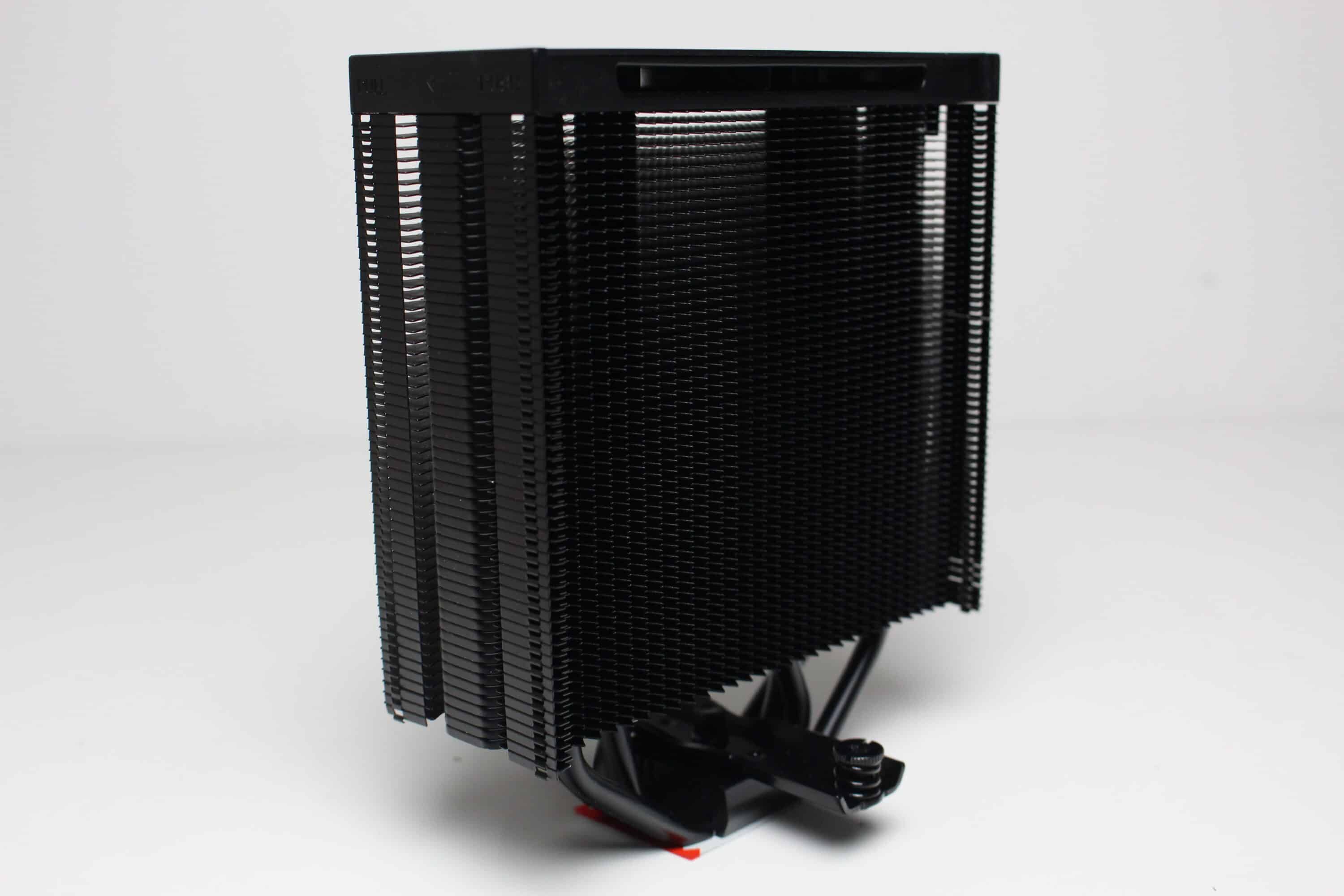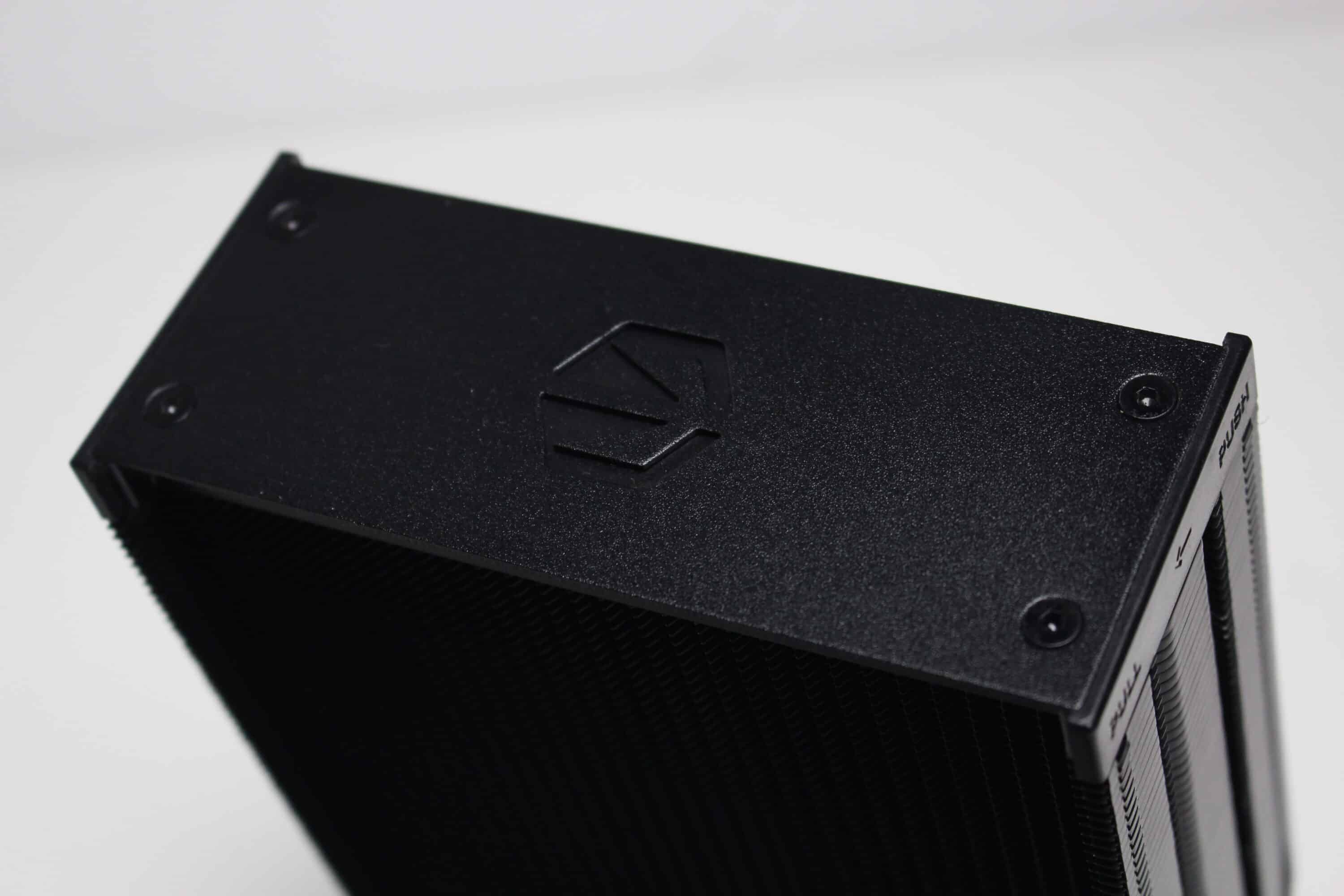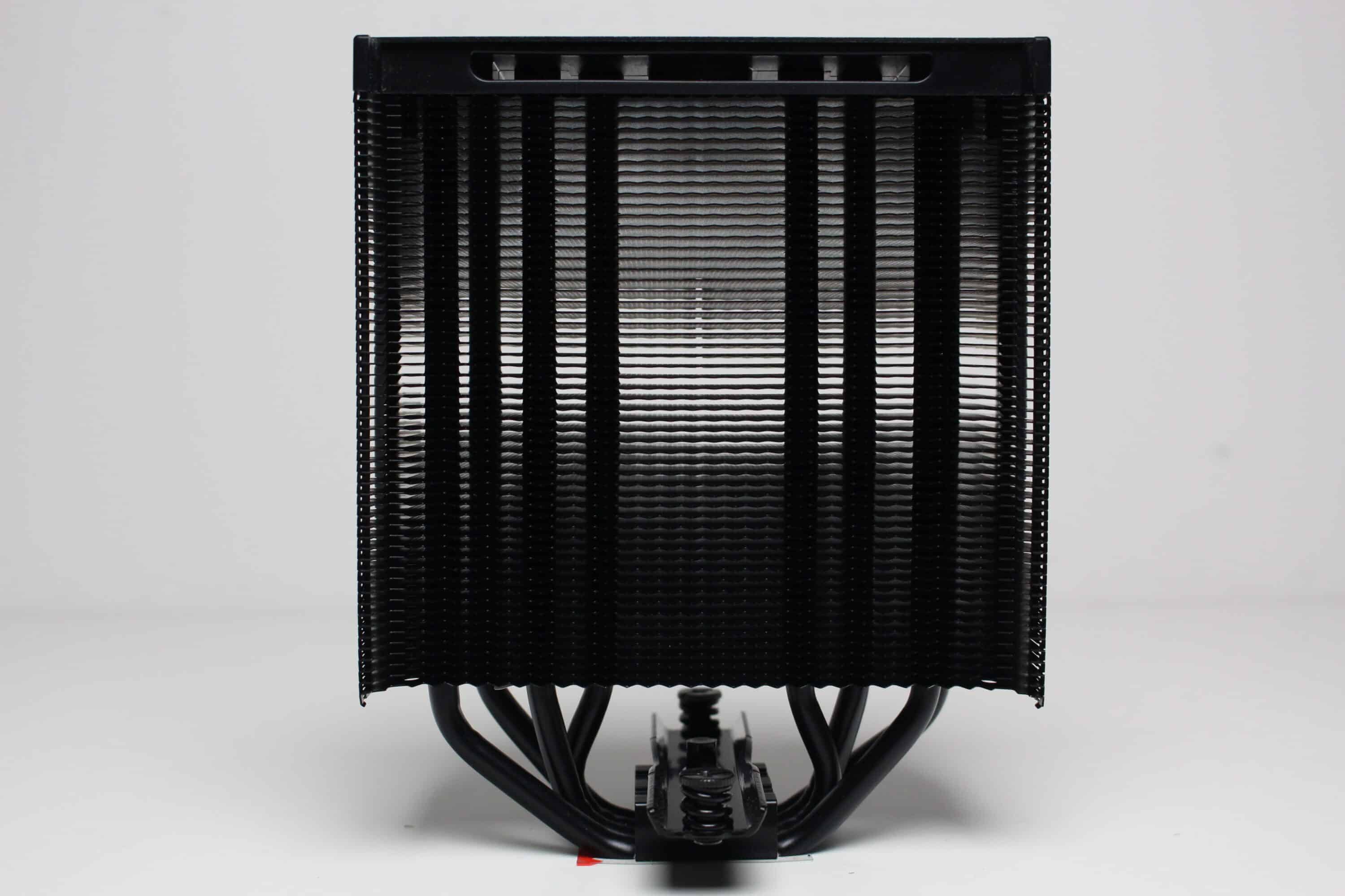 Am technischen Aufbau des Fera 5 Black hat sich im Vergleich zum bisherigen Fera 5 nichts geändert. Der Kühlkörper ist schmal bzw. symmetrisch aufgebaut und besteht aus 56 Aluminiumlamellen, die nun allerdings schwarz eloxiert wurden. Den Abschluss im Deckel macht eine schwarze Kunststoffplatte mit dem Herstellerlogo. Die vier 6-mm-Heatpipes und laufen in der Basis in Form der Heatpipe-Direct-Touch-Technologie (HDT) zusammen und wurden ebenfalls schwarz eloxiert.
