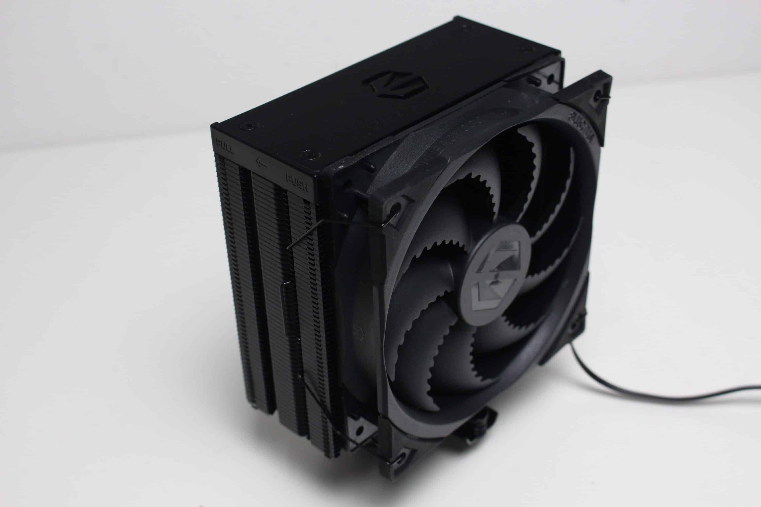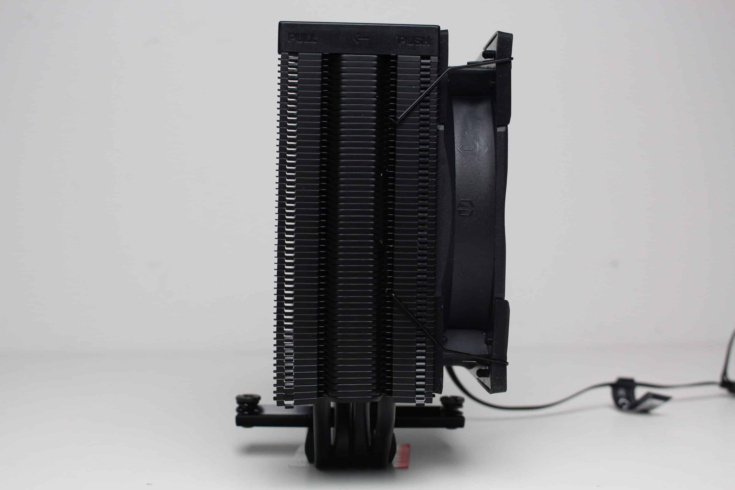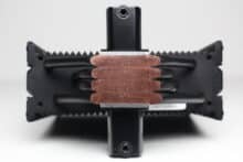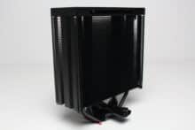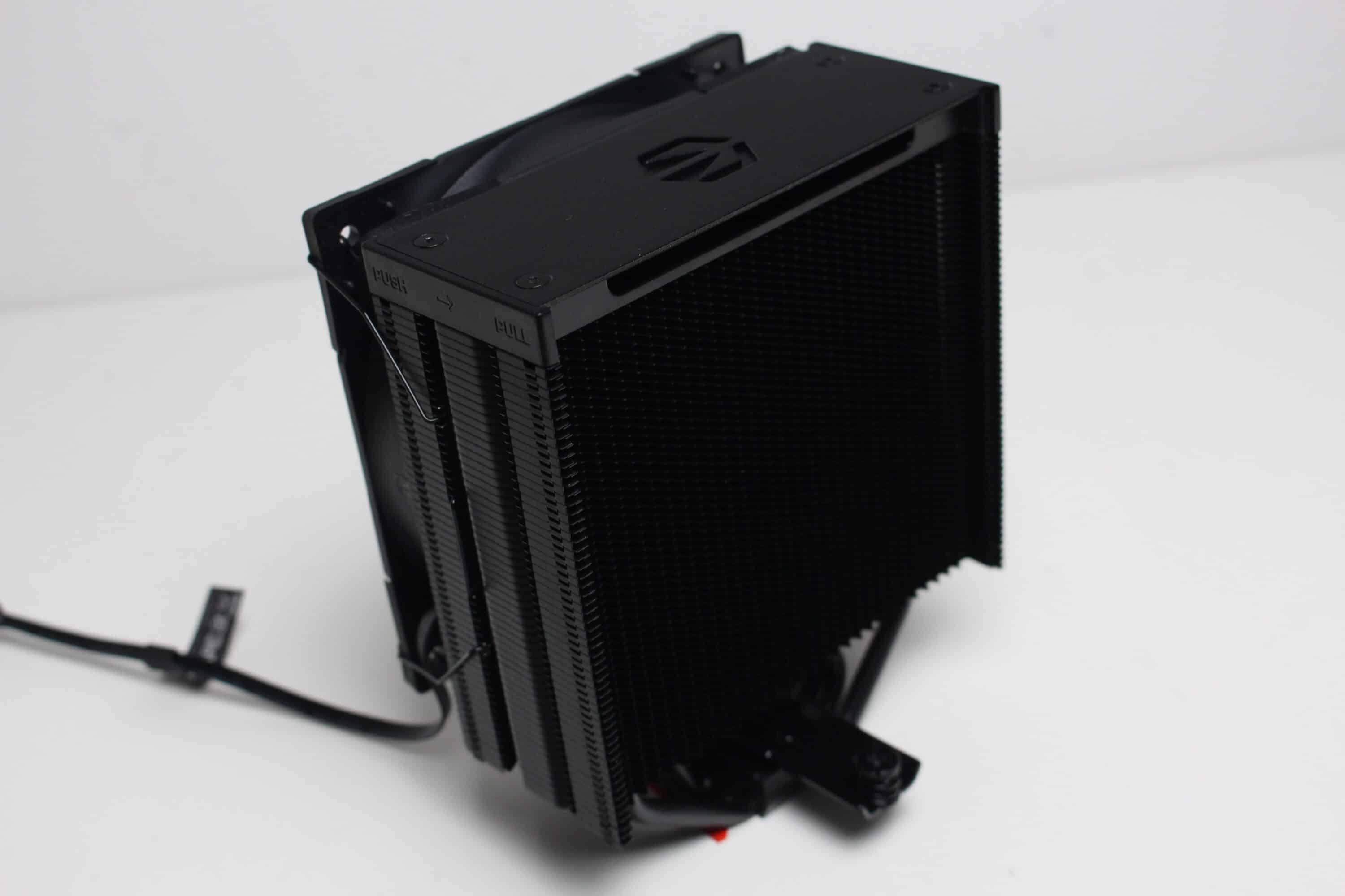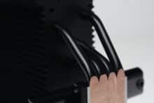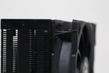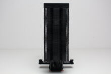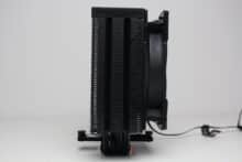 Am technischen Aufbau des Fera 5 Black hat sich im Vergleich zum bisherigen Fera 5 nichts geändert. Der Kühlkörper ist schmal bzw. symmetrisch aufgebaut und besteht aus 56 Aluminiumlamellen, die nun allerdings schwarz eloxiert wurden. Den Abschluss im Deckel macht eine schwarze Kunststoffplatte mit dem Herstellerlogo. Die vier 6-mm-Heatpipes und laufen in der Basis in Form der Heatpipe-Direct-Touch-Technologie (HDT) zusammen und wurden ebenfalls schwarz eloxiert.
