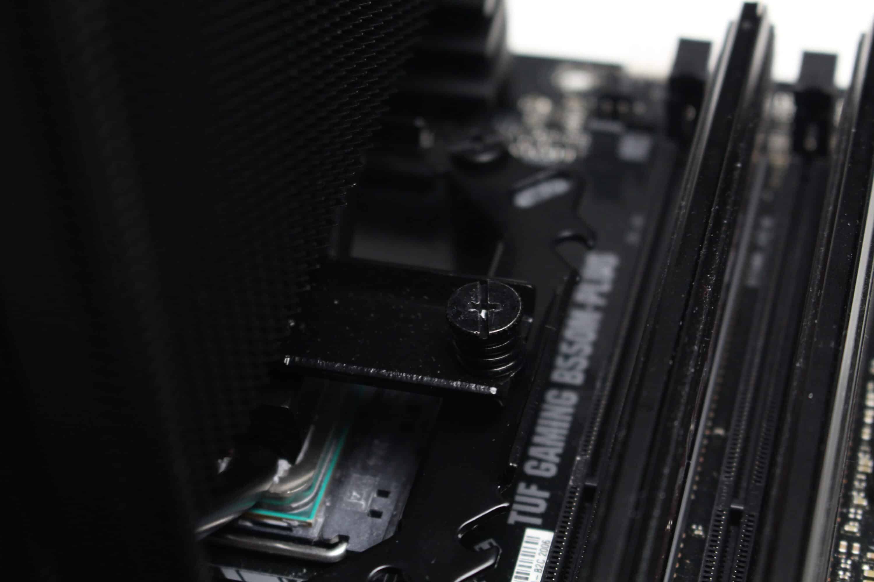Bei AMD-Systemen gestaltet sich die Montage des Fera 5 unkompliziert. Nachdem die Haltebügel auf der Vorderseite entfernt wurden, konnte die Backplate des AMD-Retentionmoduls vorbereitet werden. Dazu mussten auf der Vorderseite insgesamt vier Abstandshalter in die Backplate geschraubt werden. Auf diese Abstandshalter wird dann der schwarze Haltebügel aus Metall gelegt.
