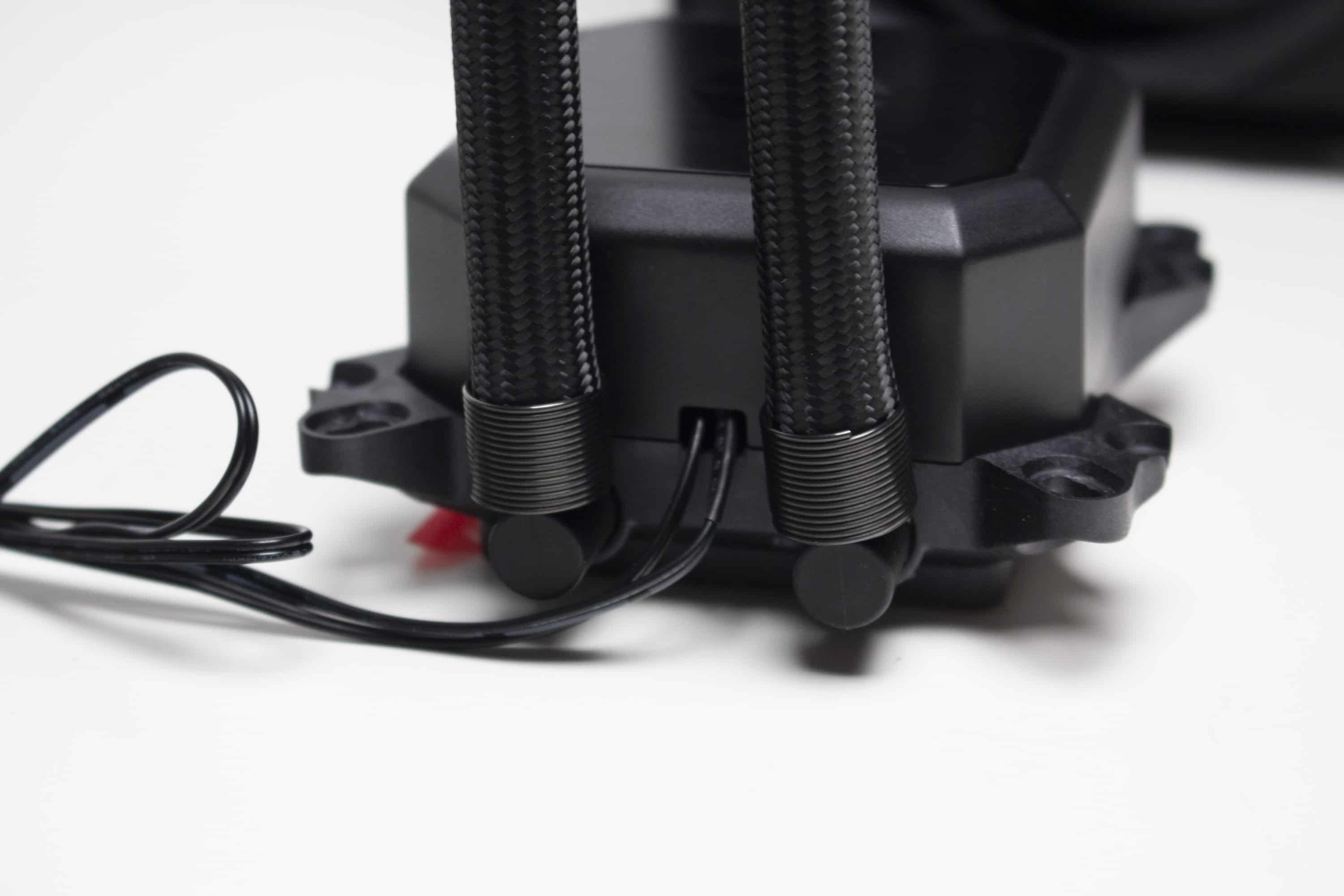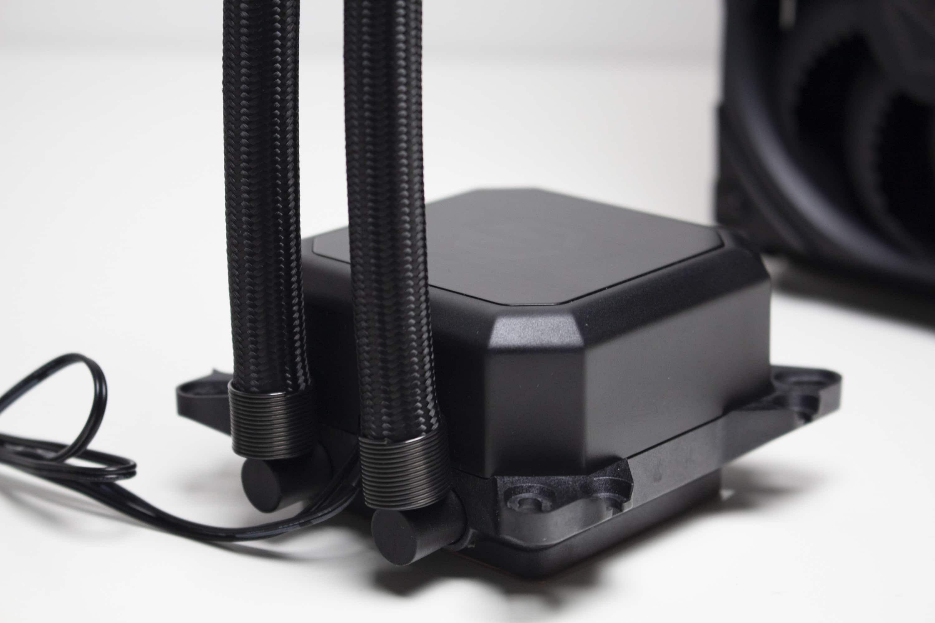 Die Wasserschläuche sind circa 360 Millimeter lang, von einem feinen schwarzen Sleeve umhüllt und enden am Pumpenblock an zwei beweglichen Gelenken. Durch deren Beweglichkeit können sowohl der Pumpenblock als auch der Radiator an verschiedenen Positionen im Gehäuse untergebracht werden. Im Vergleich zu anderen Lösungen ist die Beweglichkeit bei der Navis F360 jedoch stärker eingeschränkt. Die Verbindung zwischen Schlauch und Radiator bzw. Pumpe wird über einfache Schrumpfschläuche bzw. Drahtspulen gesichert. Das Logo auf dem Pumpenblock ist nicht rotierbar und steht gegebenenfalls auf dem Kopf.