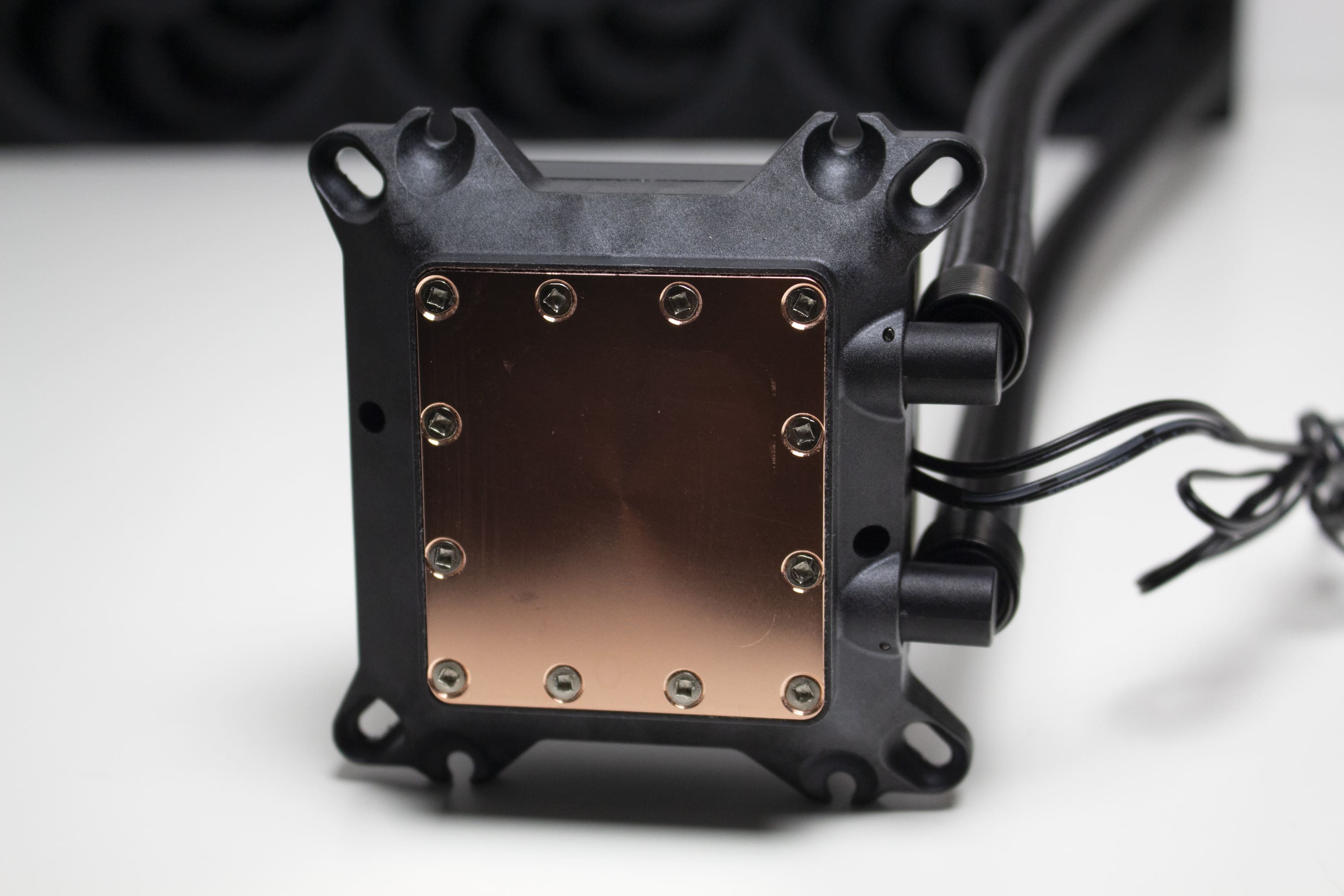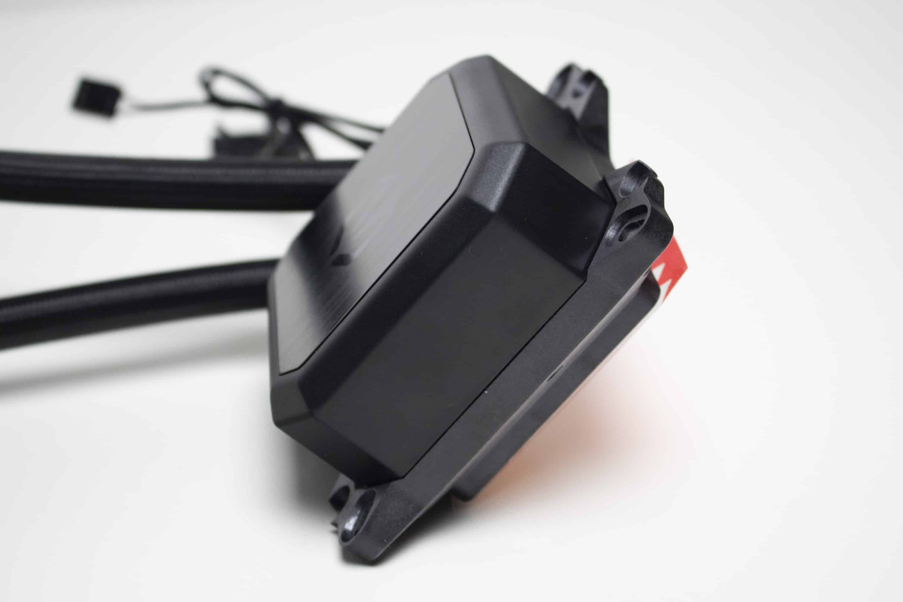 Der Pumpenblock besteht größtenteils aus schwarzem Kunststoff und ist ebenfalls schlicht gestaltet. Der Pumpendeckel mit Herstellerlogo ist aus gebürstetem Aluminium gefertigt und wertet die Optik deutlich auf. Die im Block eingebaute Pumpe mit Keramik-Lager dreht mit maximal 2600 Umdrehungen pro Minute, wird über einen SATA-Stecker mit Strom versorgt und per 4-Pin-PWM-Stecker mit dem Mainboard verbunden. Die Übertragung der Wärme vom Heatspreader der CPU an den Pumpenblock erfolgt über eine große Kupferplatte.