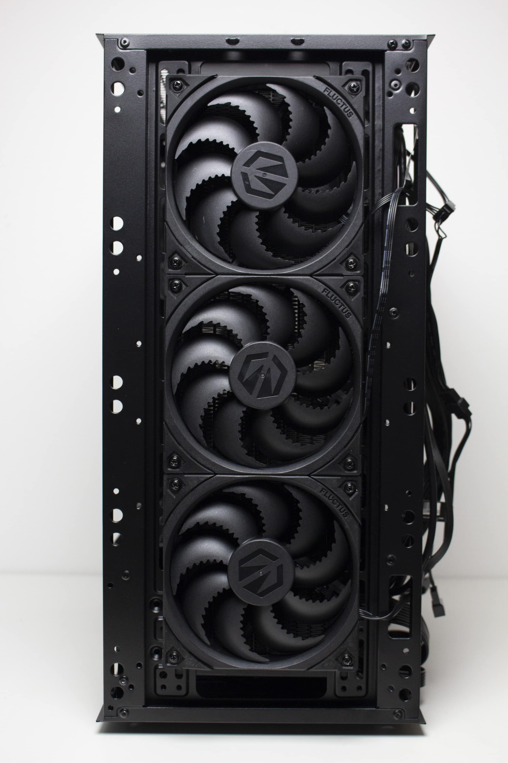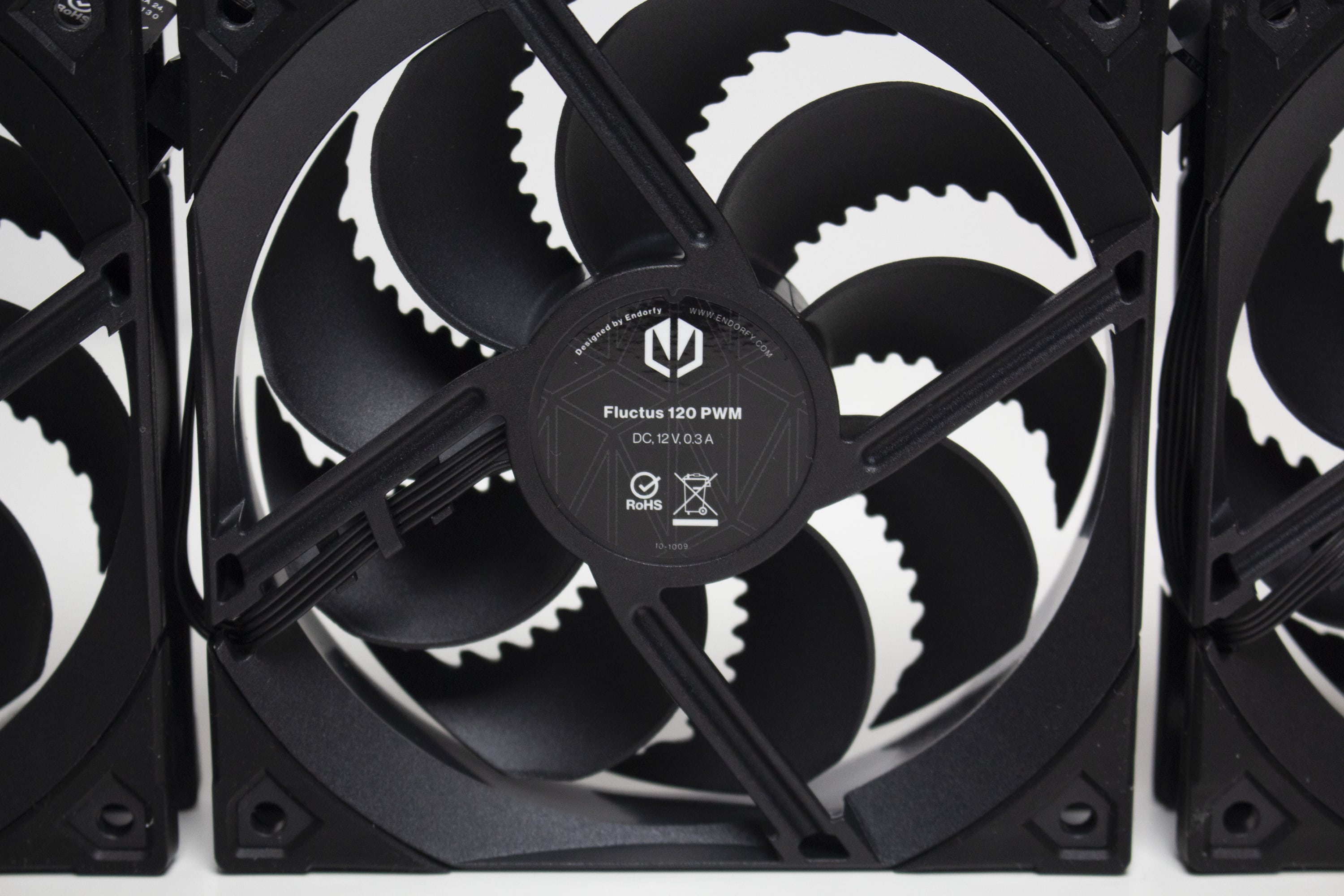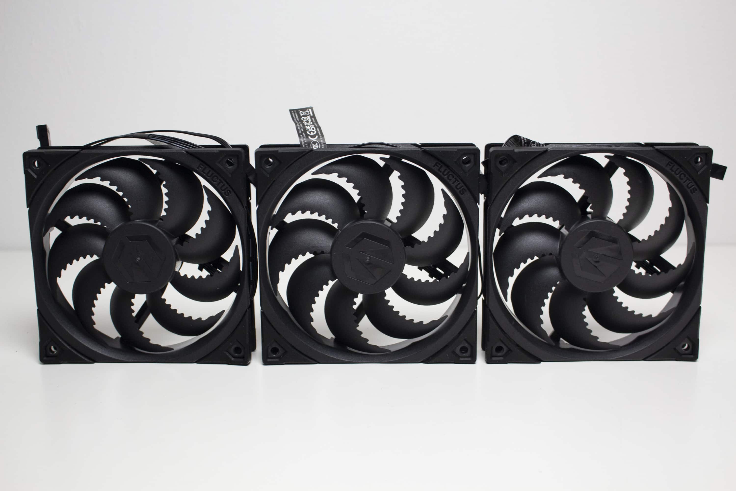 Die mitgelieferten Lüfter vom Typ Fluctus 120 PWM sind aus schwarzem Kunststoff gefertigt und verfügen über einen Drehzahlbereich zwischen 250 und 1800 Umdrehungen pro Minute. Der Anschluss der Lüfter erfolgt mittels 4-Pin-Header am Mainboard. Da alle Lüfter über eine integrierte Y-Weiche verfügen, können diese einfach miteinander verbunden werden. Weiterhin besitzen die Lüfter an den Ecken kleine Gummipuffer, die eine Übertragung von Schwingungen verhindern sollen.