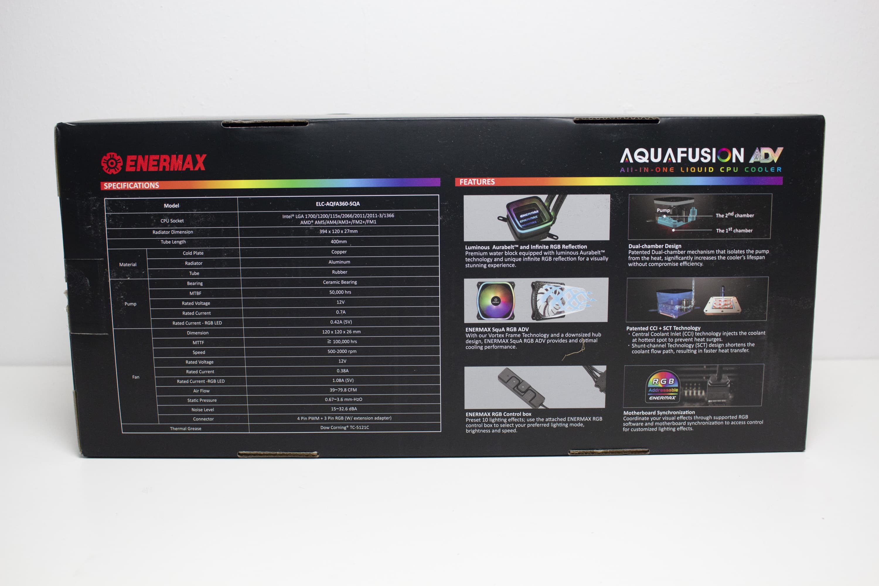 Enermax verpackt die AQUAFUSION ADV 360 in einem großen Karton aus Pappe der bunt bedruckt wurde. So dominiert die Farbe Schwarz und wird von einigen Regenbogenstreifen ergänzt, die den ARGB-Aspekt der Wasserkühlung untermalen sollen. Weiterhin zeigt die Verpackung farbige Produktbilder des Kühlsystems und listet alle relevanten technischen Daten sowie die sechs wichtigsten Features auf. Alle Angaben sind nur in englischer Sprache verfasst.