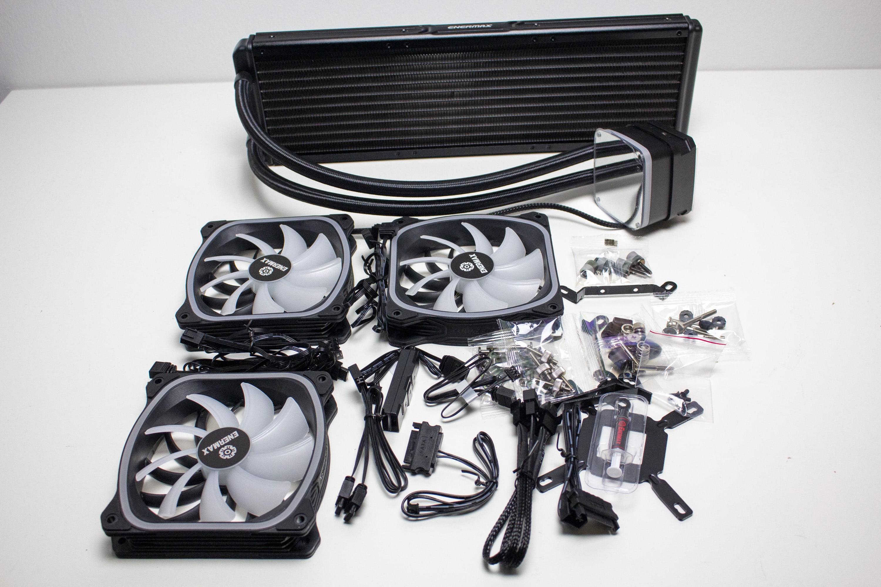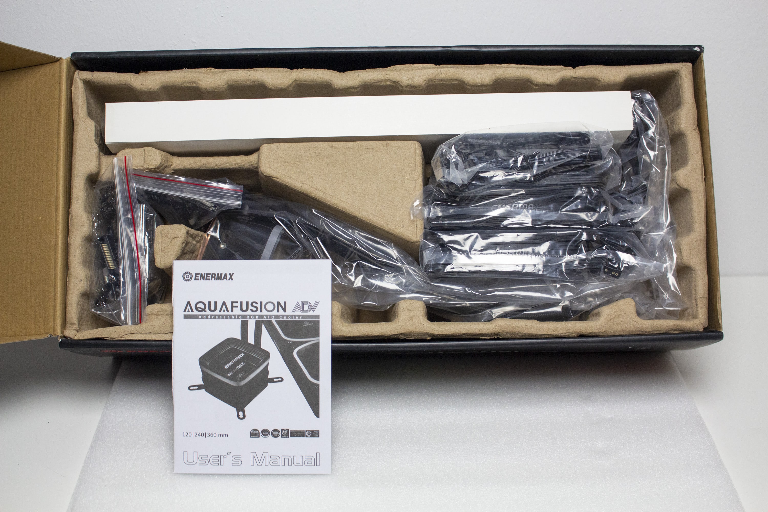 Im Inneren des Kartons wurde die AQUAFUSION ADV in eine Form aus Pappe gehüllt und zusätzlich durch Schutzfolien ummantelt. Des Weiteren spendiert Enermax dem Radiator einen Pappschuber, der die Aluminiumlamellen vor Beschädigungen schützen soll. Die drei mitgelieferten SquA ADV 120-mm-Lüfter mit ARGB-Beleuchtung wurden separat verpackt und sind ebenfalls in einer Schutzfolie eingepackt. Zuletzt findet man im Karton noch einen Beutet mit sämtlichem Montagezubehör wie Schrauben, einer Backplate, Abstandshalter, Haltebügel, Wärmeleitpaste etc. sowie die ausführliche Montageanleitung und jede Menge Anschlusskabel.