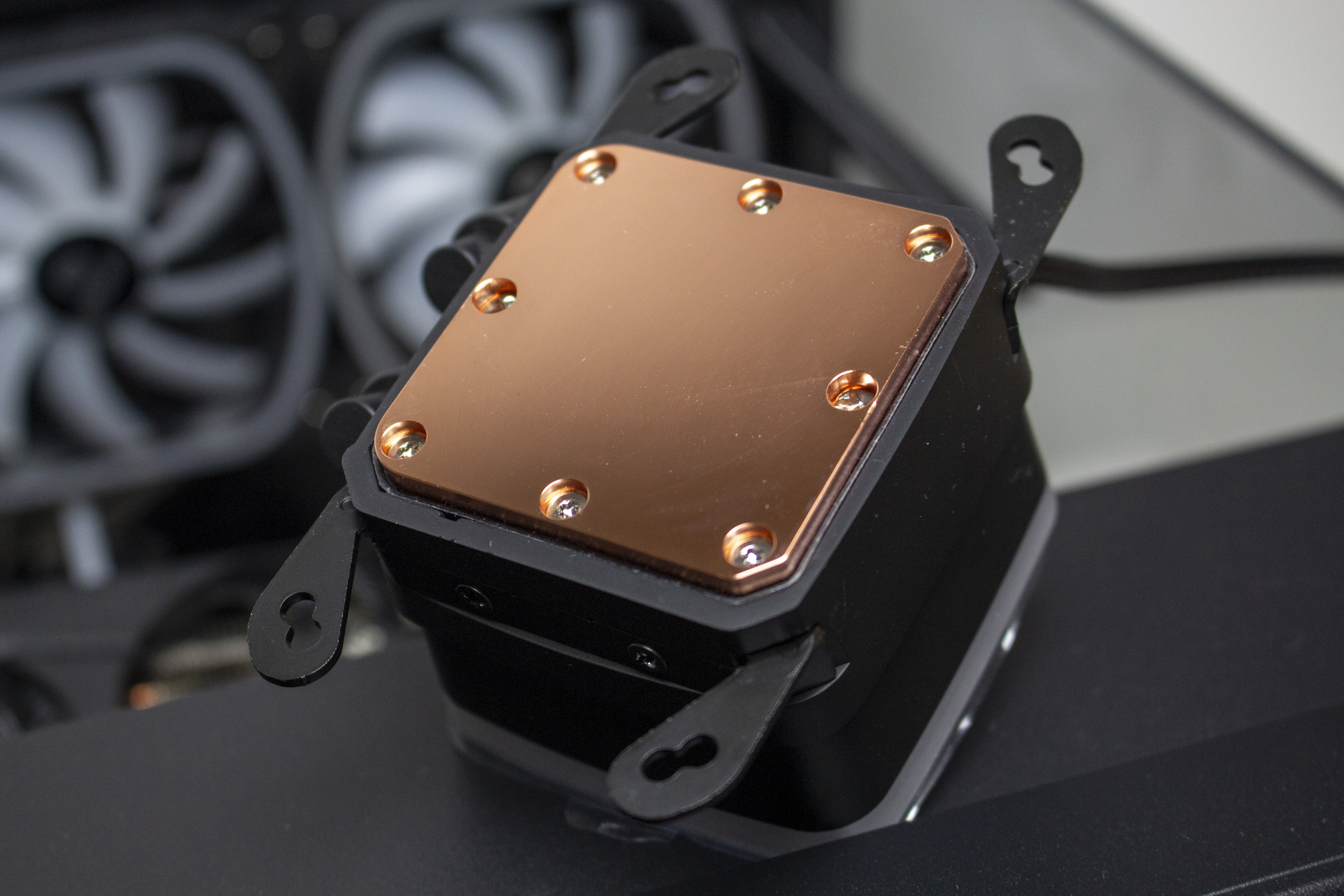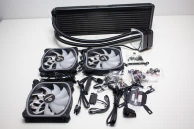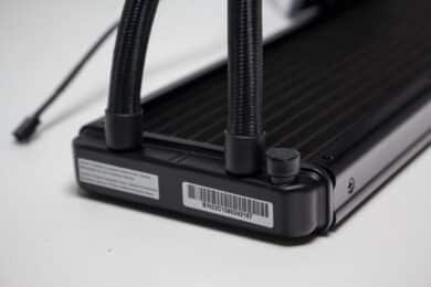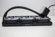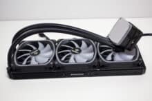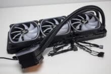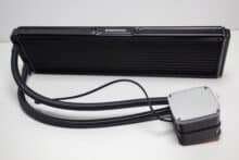 Verschraubt man Radiator und Lüfter zu einer Einheit, dann ist das Gespann 52 Millimeter dick. Damit sollte die Kompaktwasserkühlung auch in Gehäuse passen, die nicht so viel Platz für Wasserkühlungskomponenten bieten. In Bezug auf die Verarbeitungsqualität konnten wir weder an den Lüftern noch am Radiator oder der Pumpeneinheit Verarbeitungs- oder Lackierungsfehler feststellen. Zudem gab es keine verbogenen Lamellen oder unschöne Kratzer.