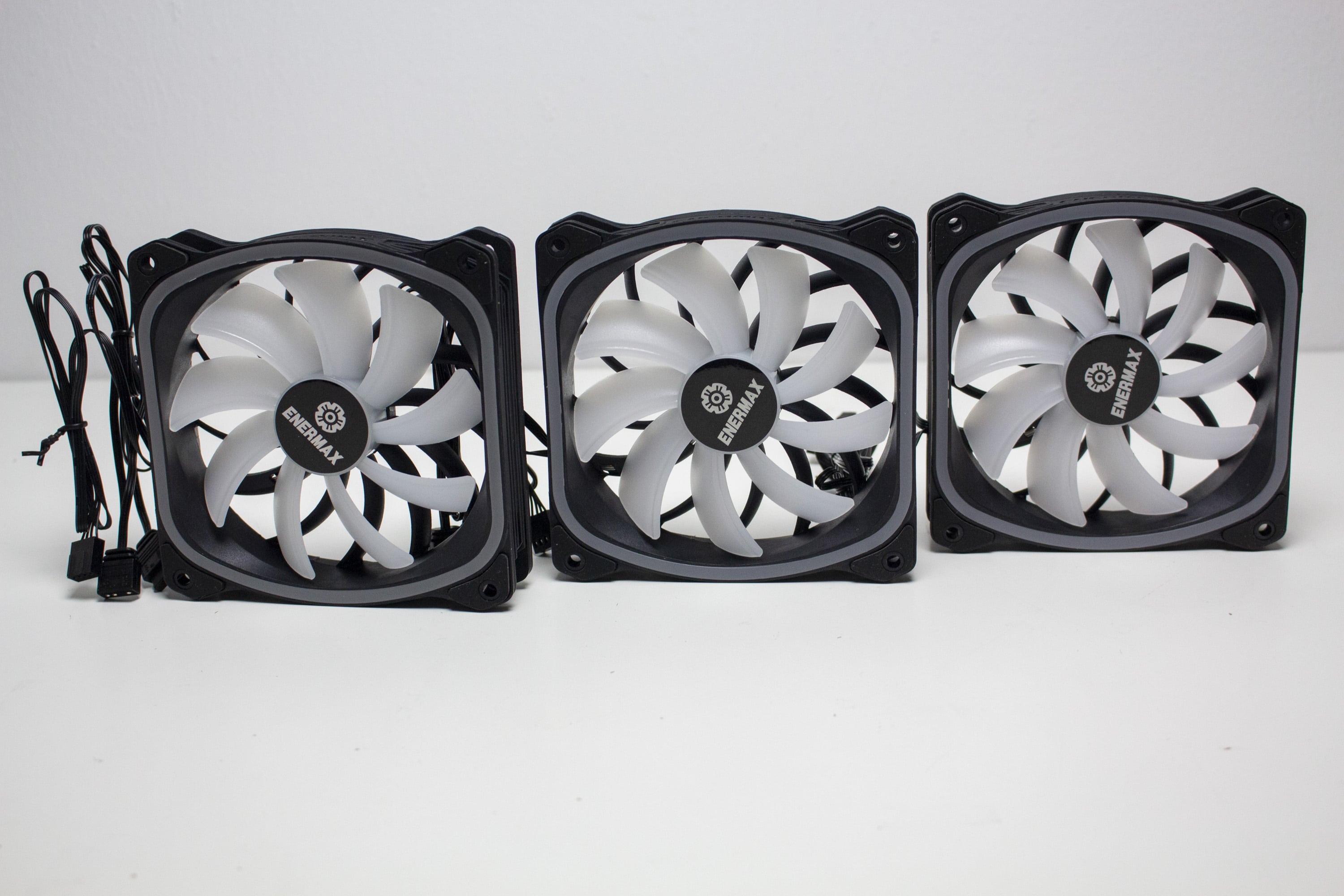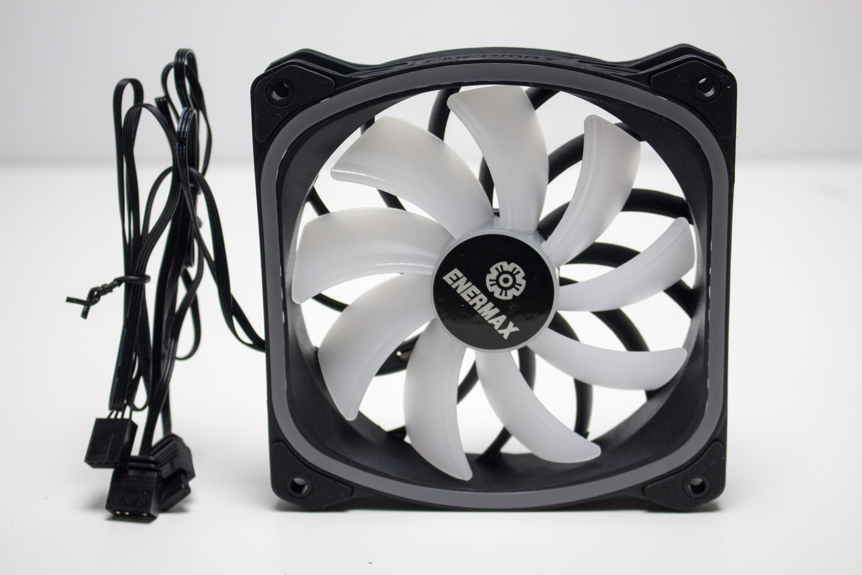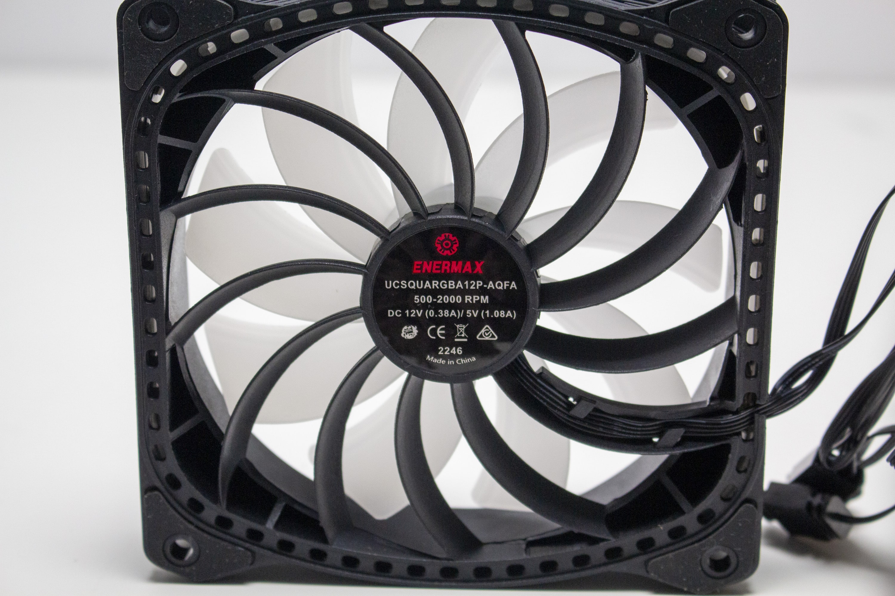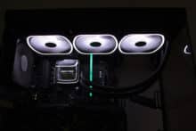 Die mitgelieferten Lüfter vom Typ SquA ADV ARGB bestehen aus einem schwarzem Kunststoff und verfügen über einen Drehzahlbereich zwischen 500 und 2000 Umdrehungen pro Minute. Der Anschluss der milchigen Lüfter erfolgt mittels 4-Pin-PWM-Stecker für Strom und über einen 5V-3-Pin-ARGB-Header für die Ansteuerung der Beleuchtung in Rahmen und Lüfternabe. Weiterhin besitzen die Lüfter an den Ecken kleine Gummipuffer, die eine Übertragung von Schwingungen an den Radiator oder das Gehäuse verhindern sollen.