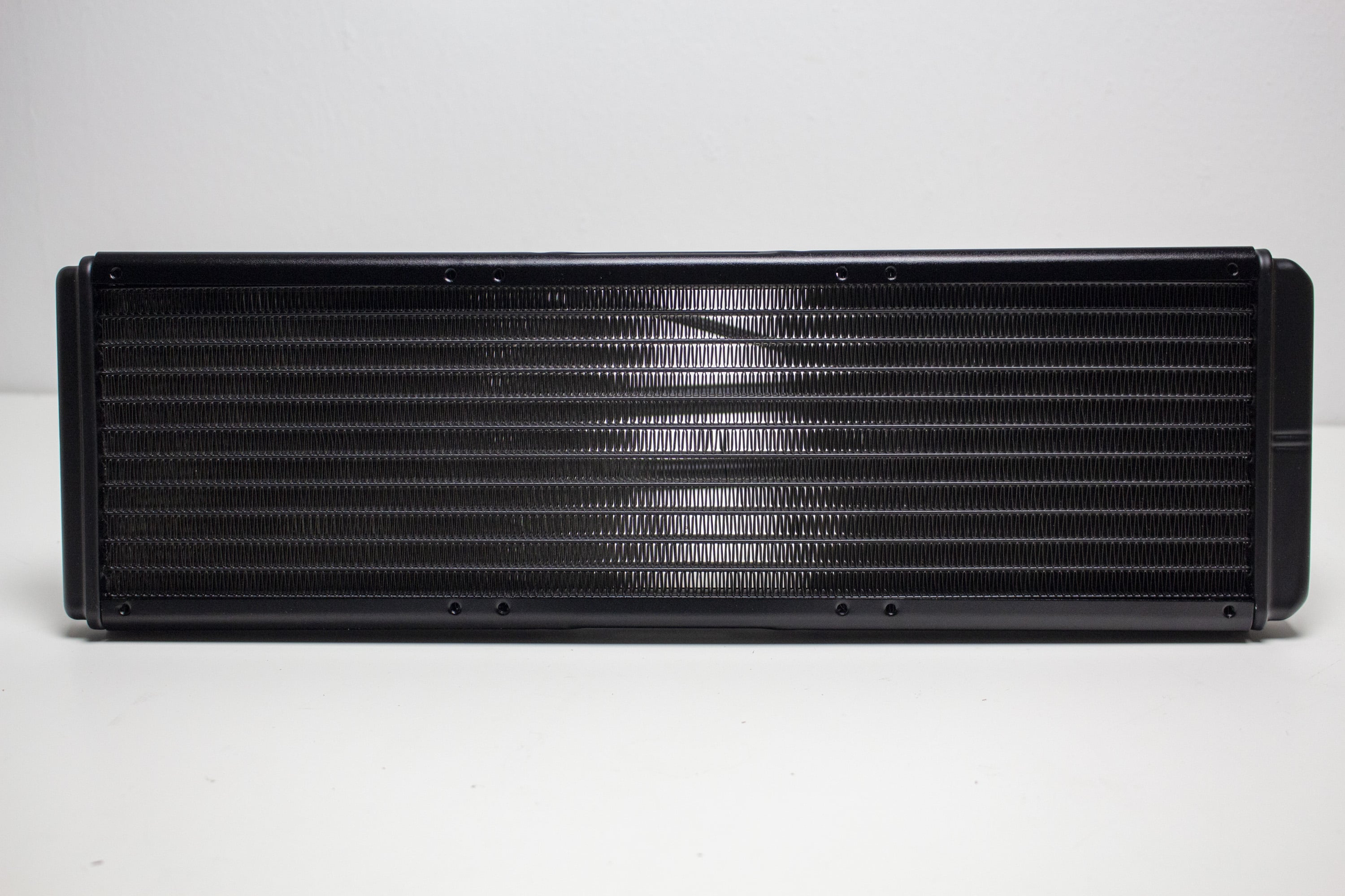 Optisch belässt es Enermax bei der AQUAFUSION ADV beim alten Design von Radiator und Pumpe. So ist der Wärmetauscher zwar schlicht schwarz gehalten, verfügt aber über einen glänzenden Herstellerschriftzug sowie zwei größeren Einkerbungen pro Seite. Er ist aus Aluminium gefertigt und liegt mit einer Dicke von 27 Millimetern im Durchschnitt vieler handelsüblicher Kompaktwasserkühlungen.