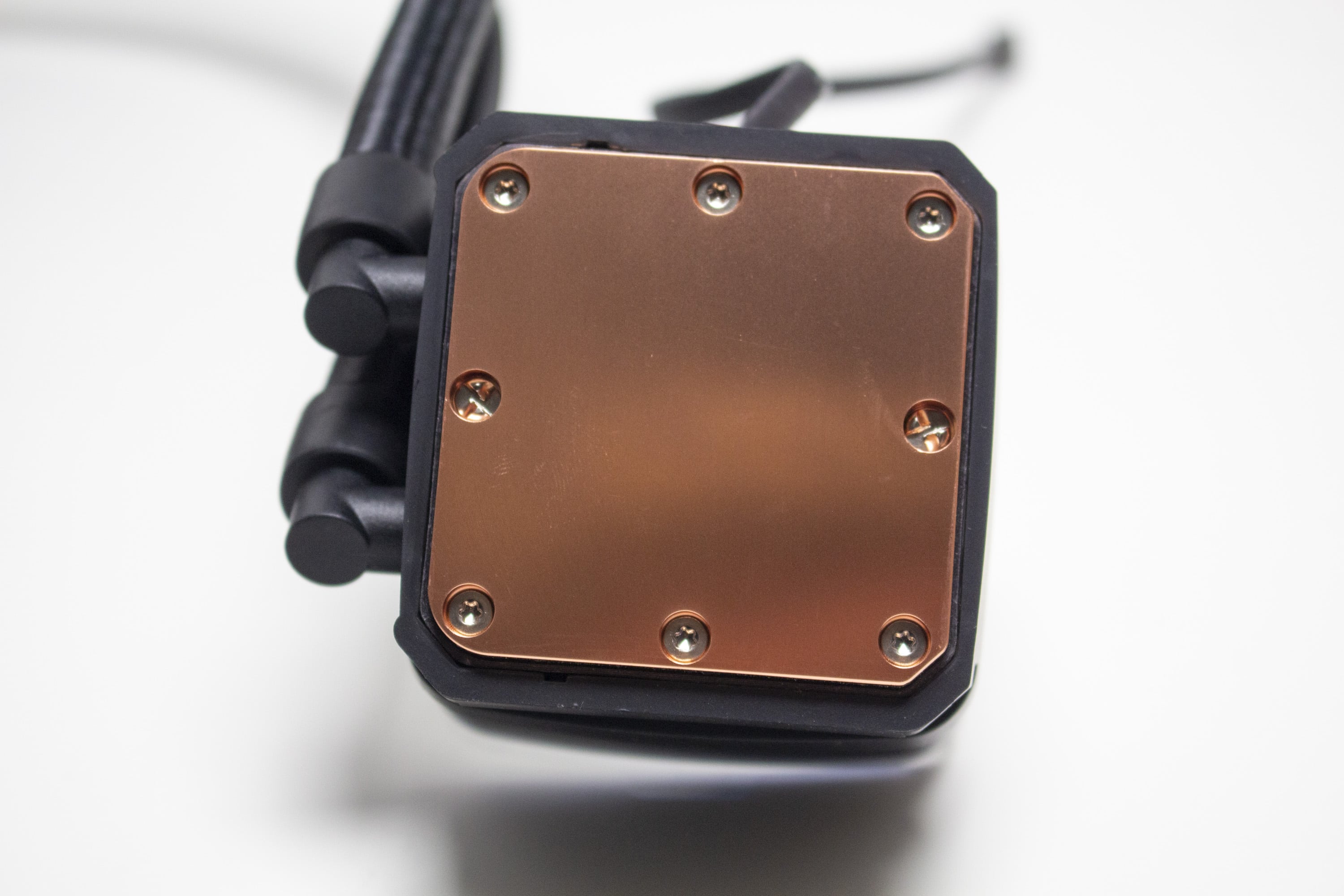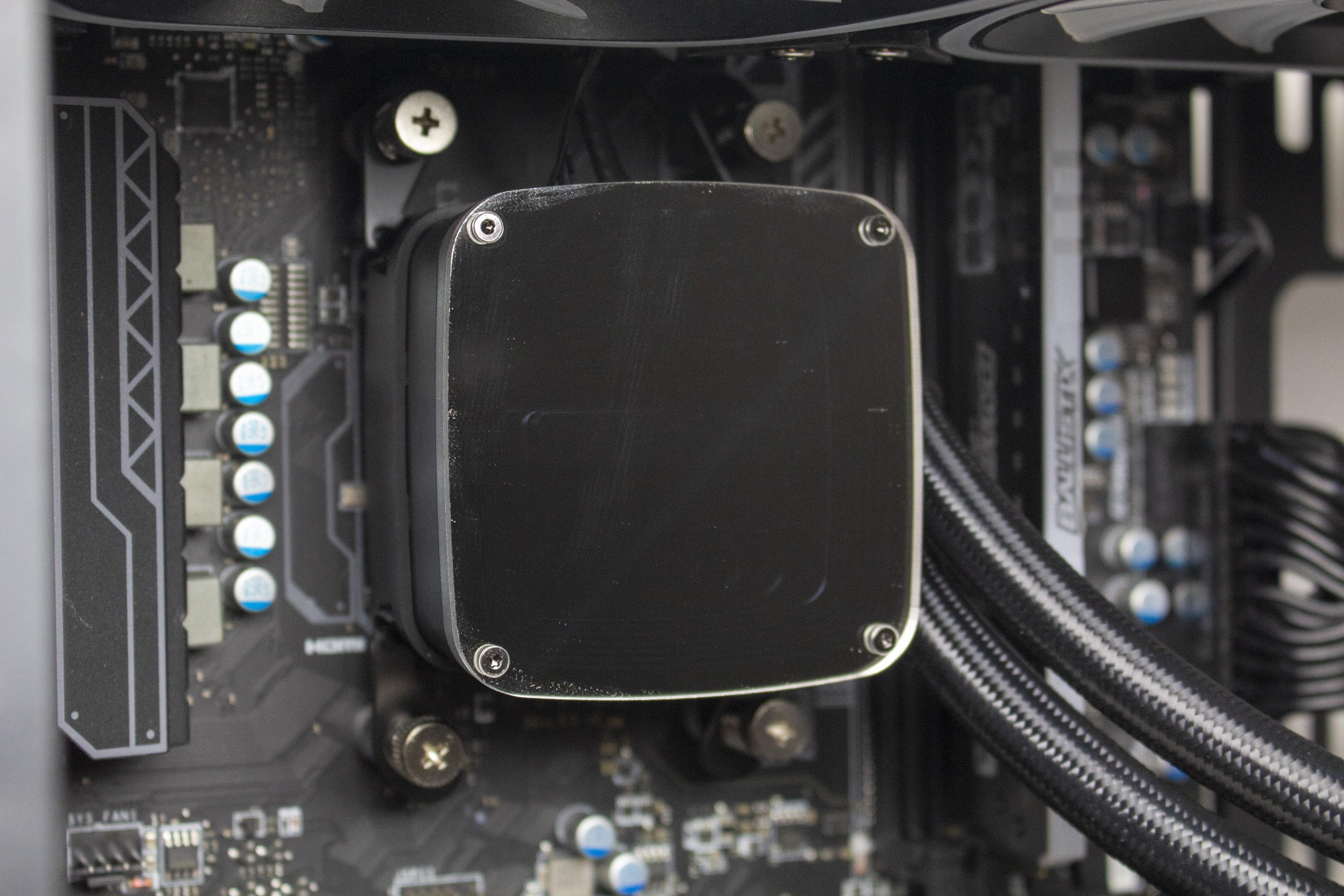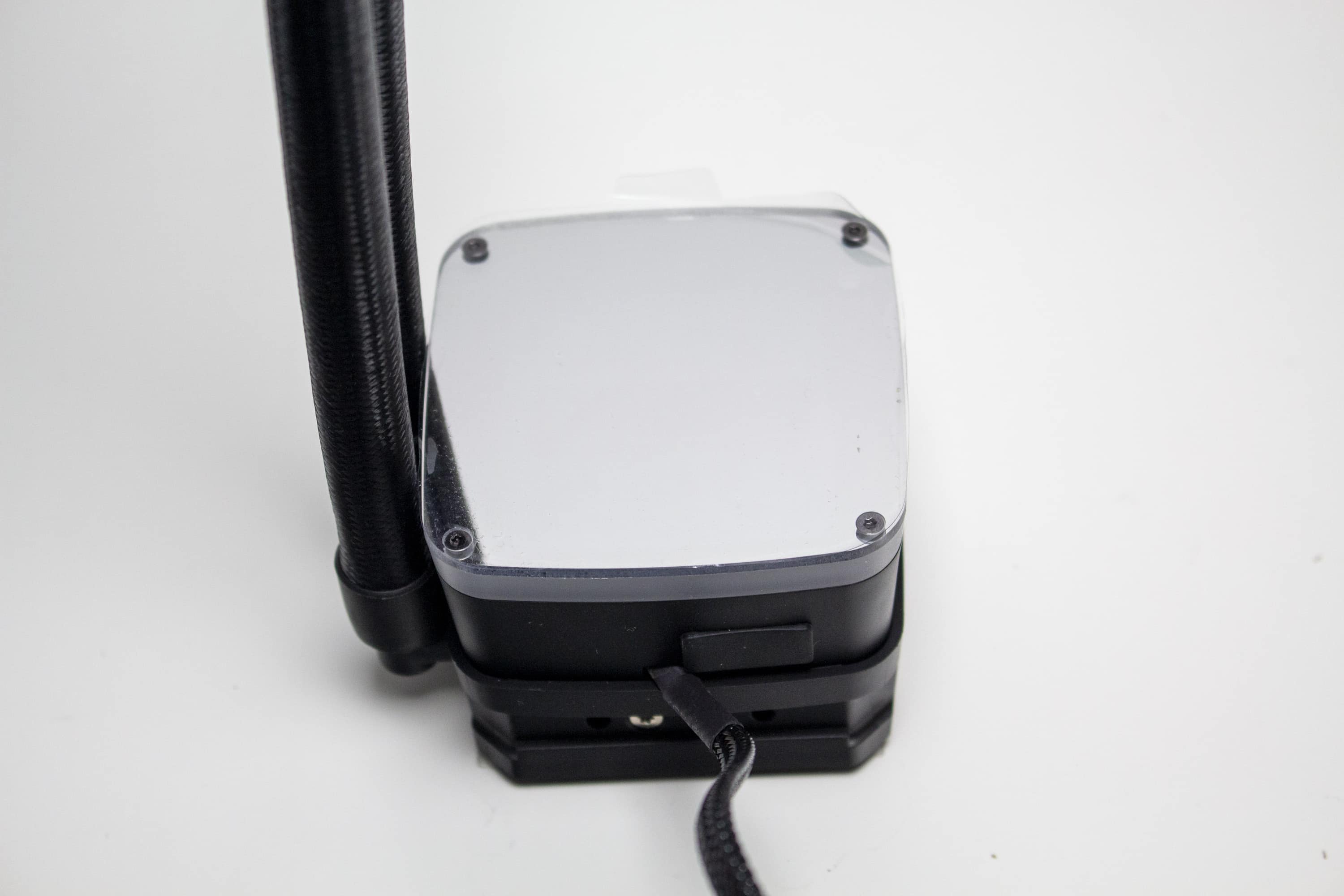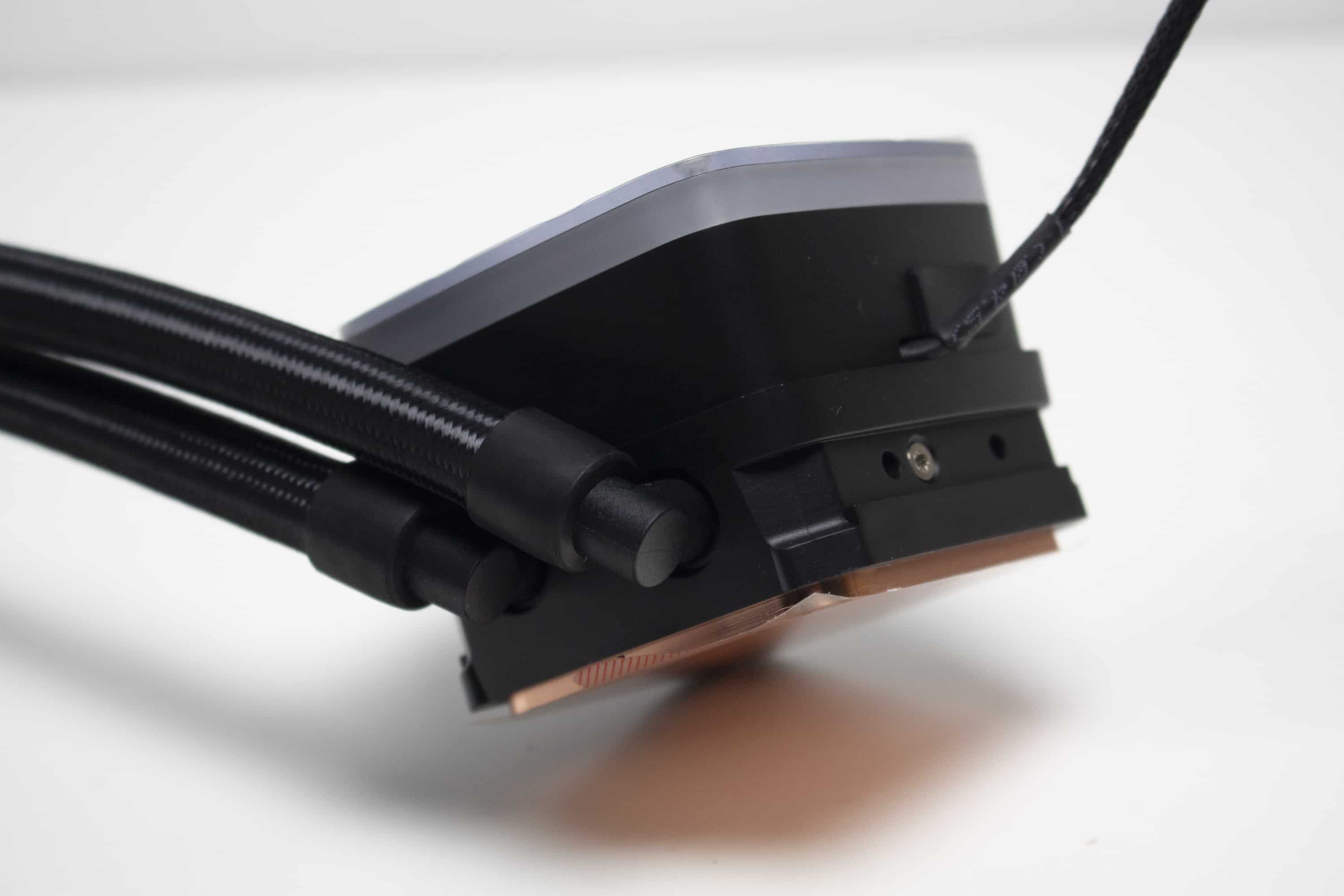 Die Wasserschläuche sind circa 400 Millimeter lang, von einem feinen schwarzen Sleeve umhüllt und enden am Pumpenblock an zwei beweglichen Gelenken. Durch deren Beweglichkeit können sowohl der Pumpenblock als auch der Radiator an verschiedenen Positionen im Gehäuse untergebracht werden. Die Verbindung zwischen Schlauch und Radiator bzw. Pumpe wurde über gepresste Kunststoffmuffen realisiert. Erweiterbar ist diese Kompaktwasserkühlung somit also nicht.