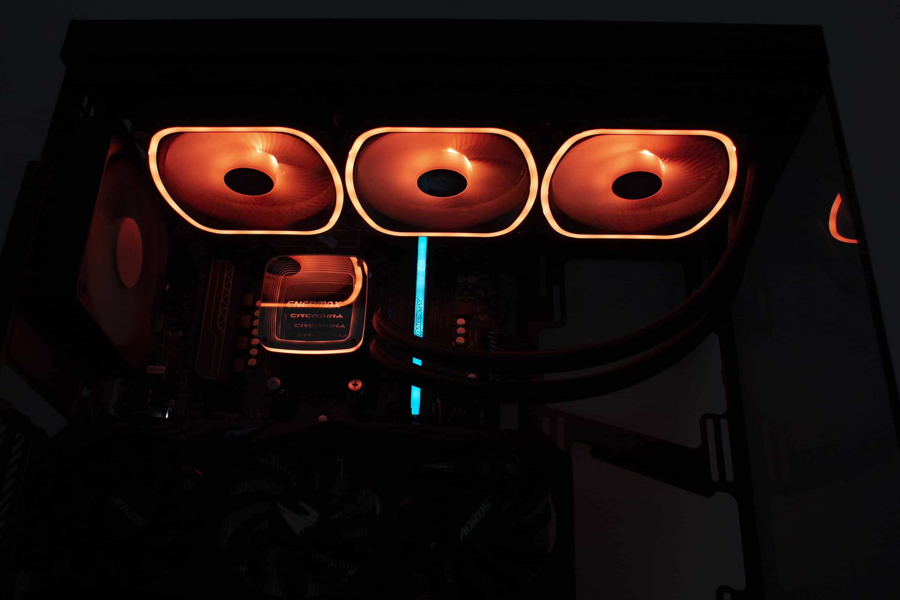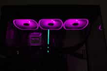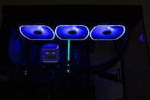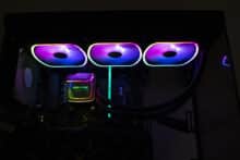 Da die Enermax AQUAFUSION ADV 360 sehr viele Beleuchtungsoptionen bietet, wollen wir dieses Kapitel nur diesem Thema widmen. Alle Lüfter (Rotor, Lüfterrahmen) und die Pumpe (Pumpendeckel) verfügen über adressierbare LEDs, die jeweils über einen 3-Pin-5V-ARGB-Stecker angesteuert werden können. Da die Lüfter jeweils über einen Splitter verfügen, können diese und die Pumpe gemeinsam an einem einzelnen ARGB-Header des Mainboards angeschlossen werden. Sollte das Mainboard nicht über einen entsprechenden Header verfügen, legt Enermax dem Zubehör auch eine Steuereinheit bei. Diese verfügt über zahlreiche Effekte sowie Steuerungsmöglichkeiten und wirs per SATA-Stromstecker mit dem Netzteil verbunden. Abschließend noch ein paar Impressionen der aktivierten Beleuchtung.