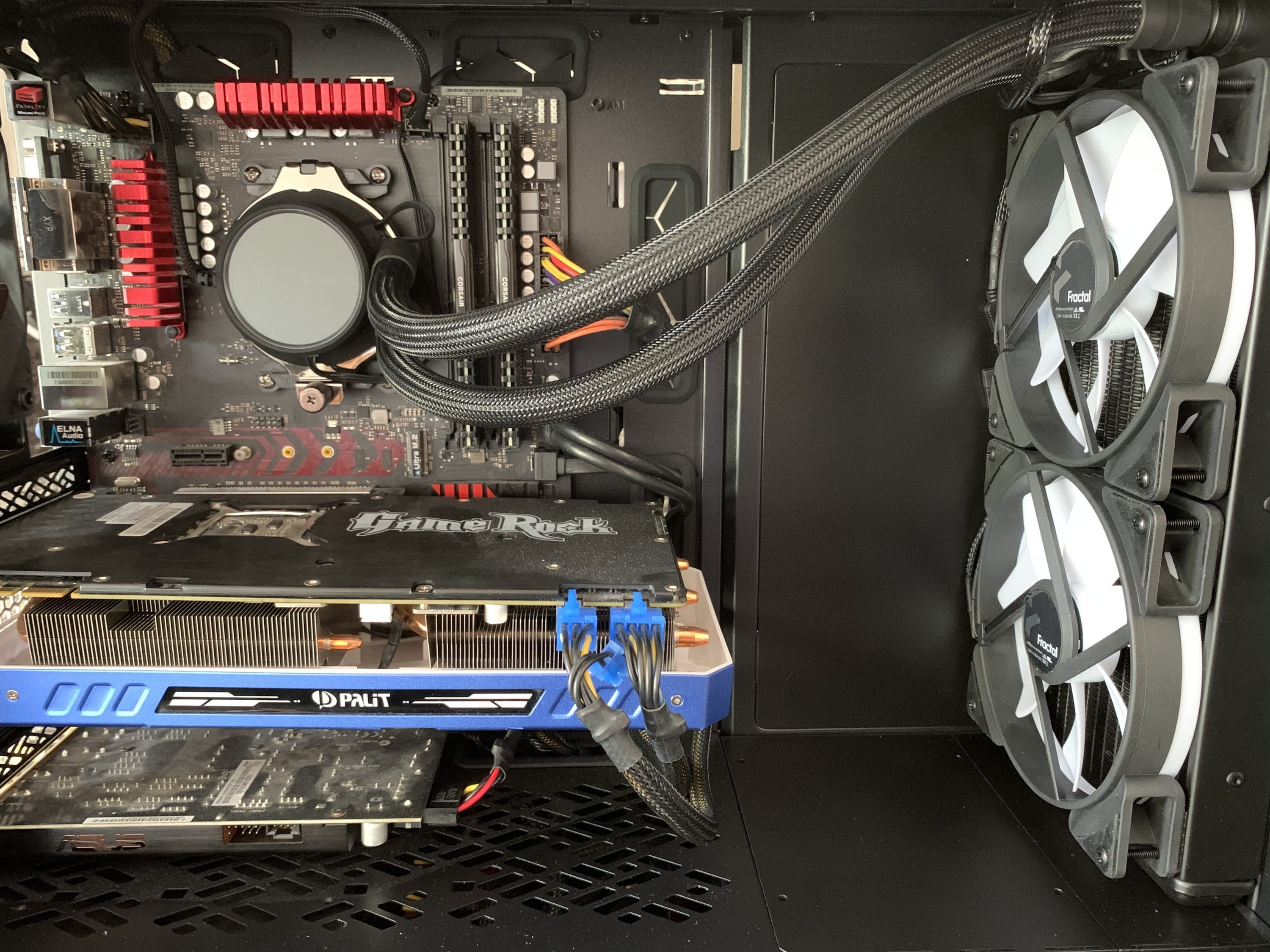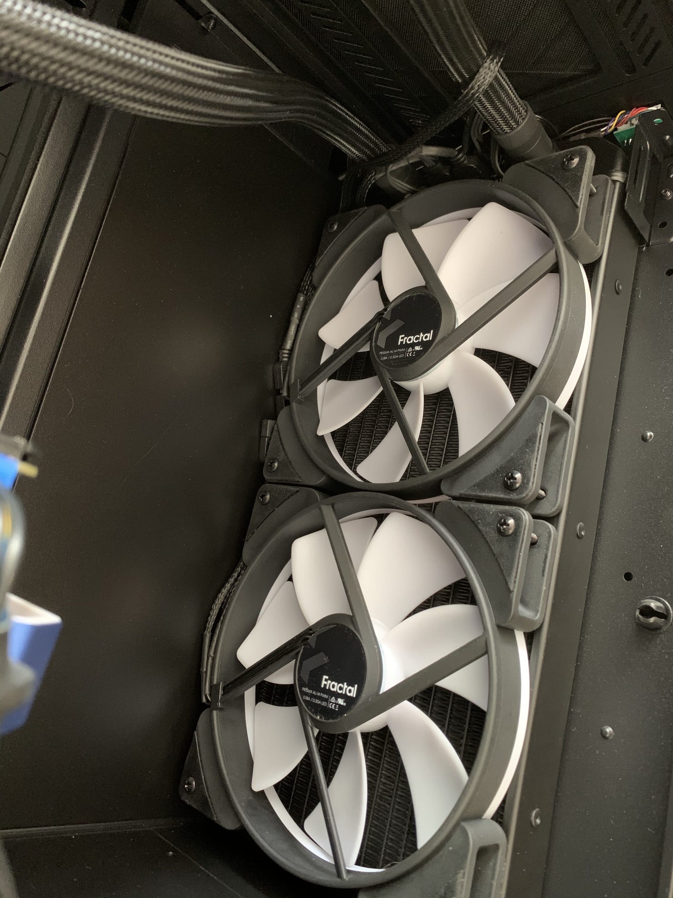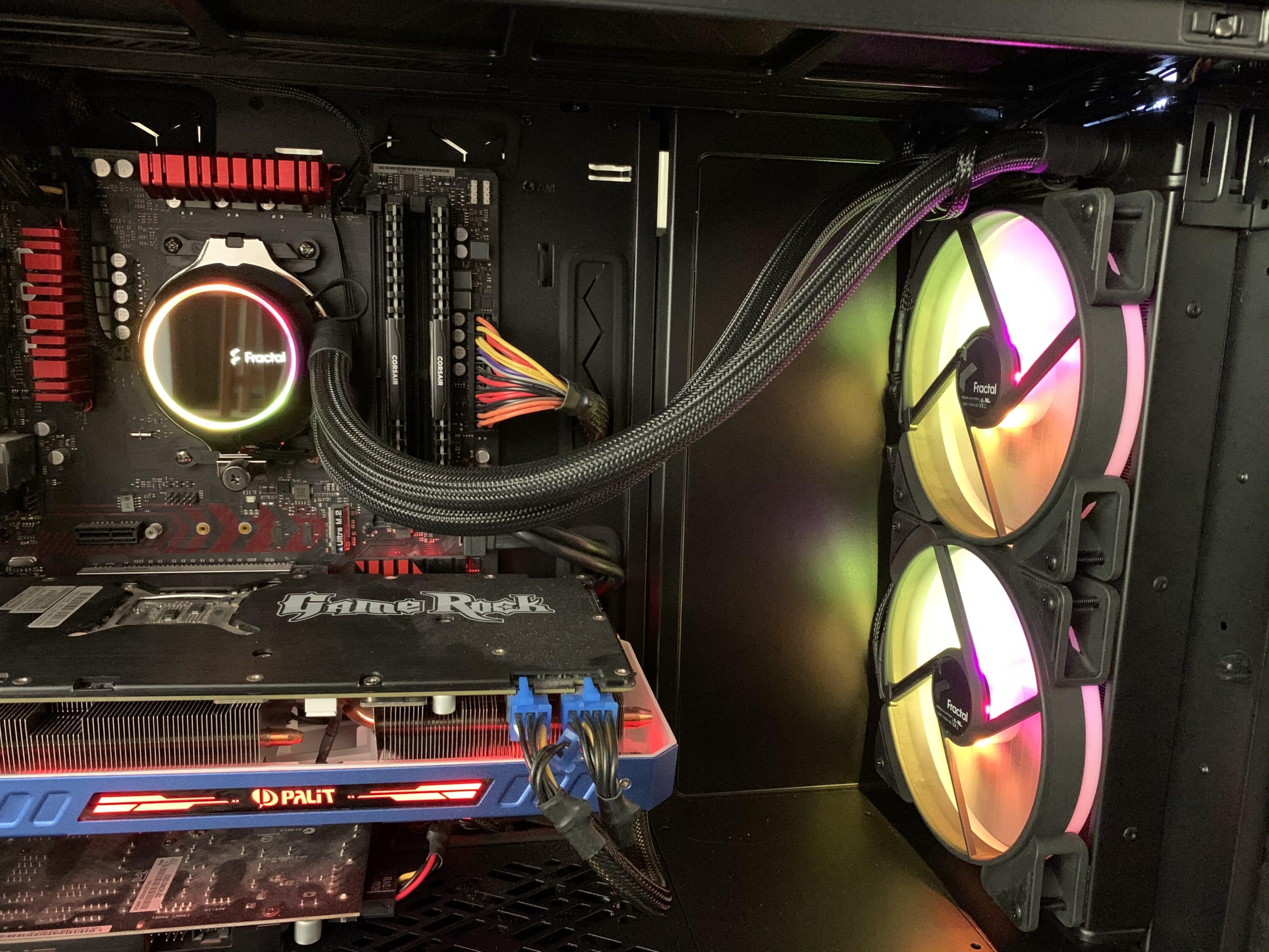 Die mitgelieferten RGB-Lüfter sind problemlos am Radiator zu befestigen. Durch eine leichte beidseitige Gummierung können neben Kratzern auch Vibrationen im Betrieb vermieden werden. Es ist sinnvoll, bereits vor der Montage des Radiators im Gehäuse, das Kabelmanagement der Lüfter vorzunehmen. Platz findet der Radiator problemlos in der Front eines Fractal Define 7 (hier geht es zu unserem Test).