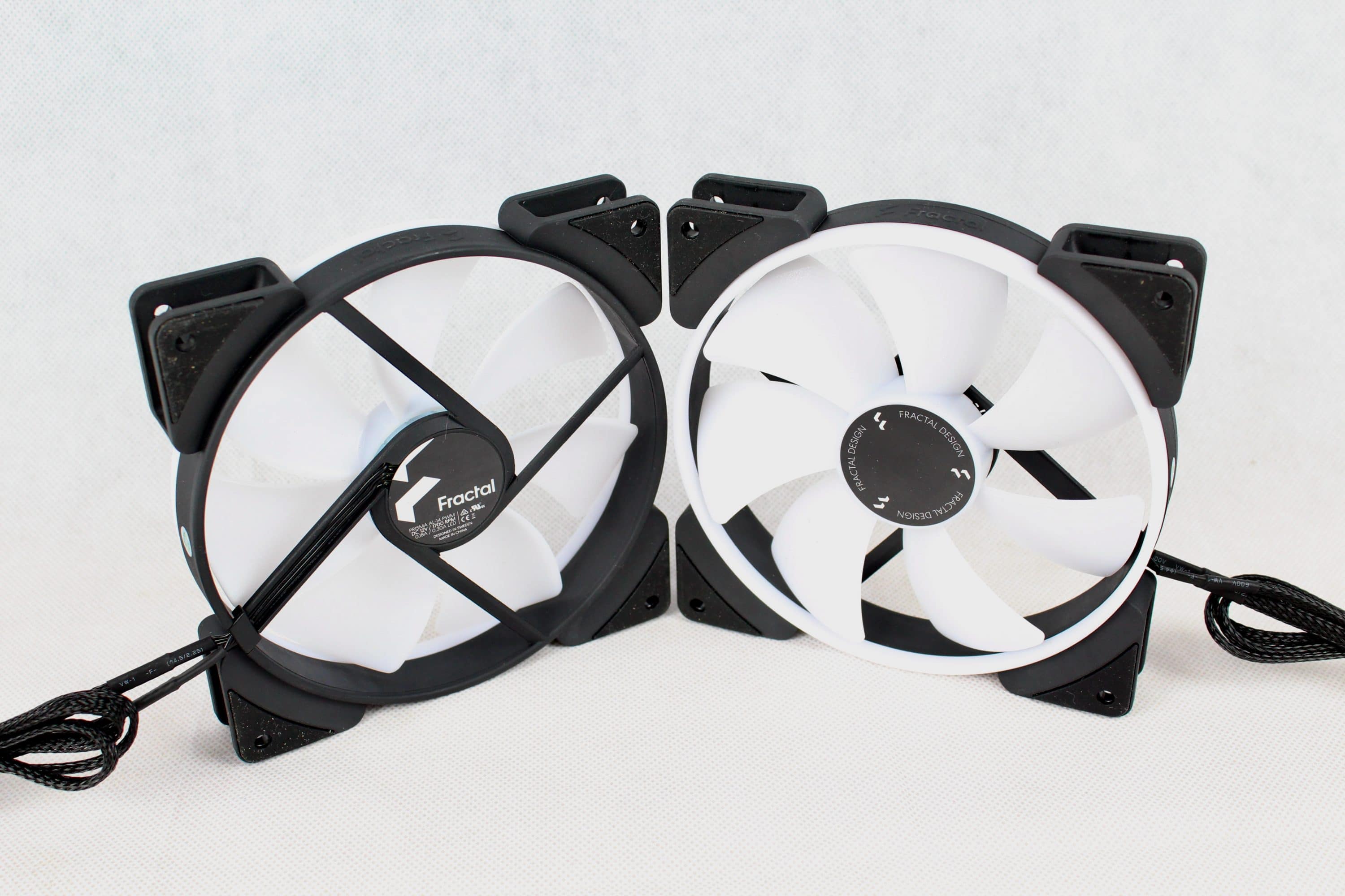 Die zwei im Lieferumfang erhältlichen RGB-Lüfter (Prisma AL-14 PWM ARGB*) besitzen einen schwarz und teilweise gummierten Rahmen mit weißen Lüfterblättern. Angeschlossen werden die Lüfter über einen 4-Pin-PWM-Anschluss. Zudem besitzen sie zwei 3-Pin-RGB-Anschlüsse (einmal weiblich, einmal männlich).