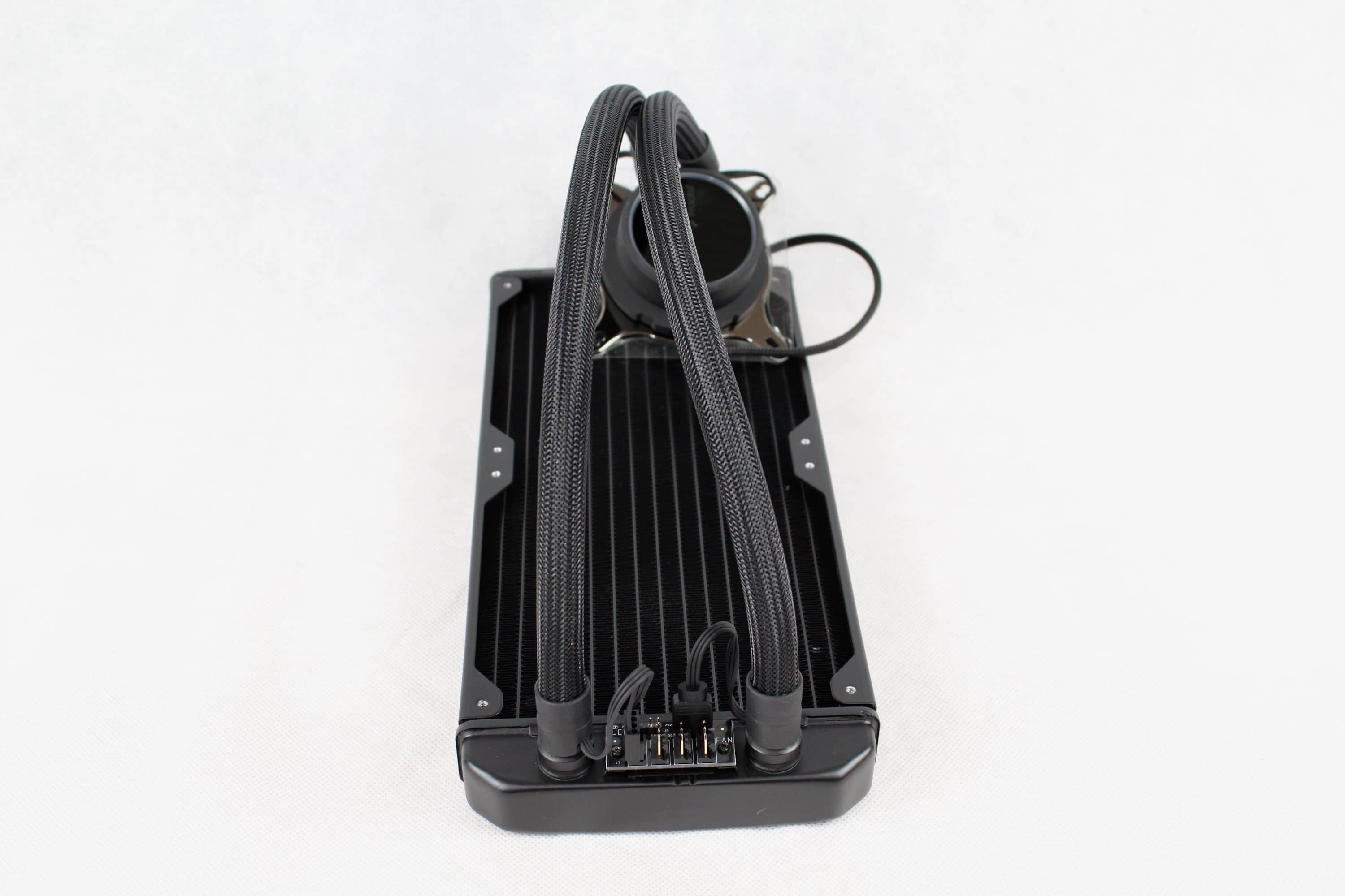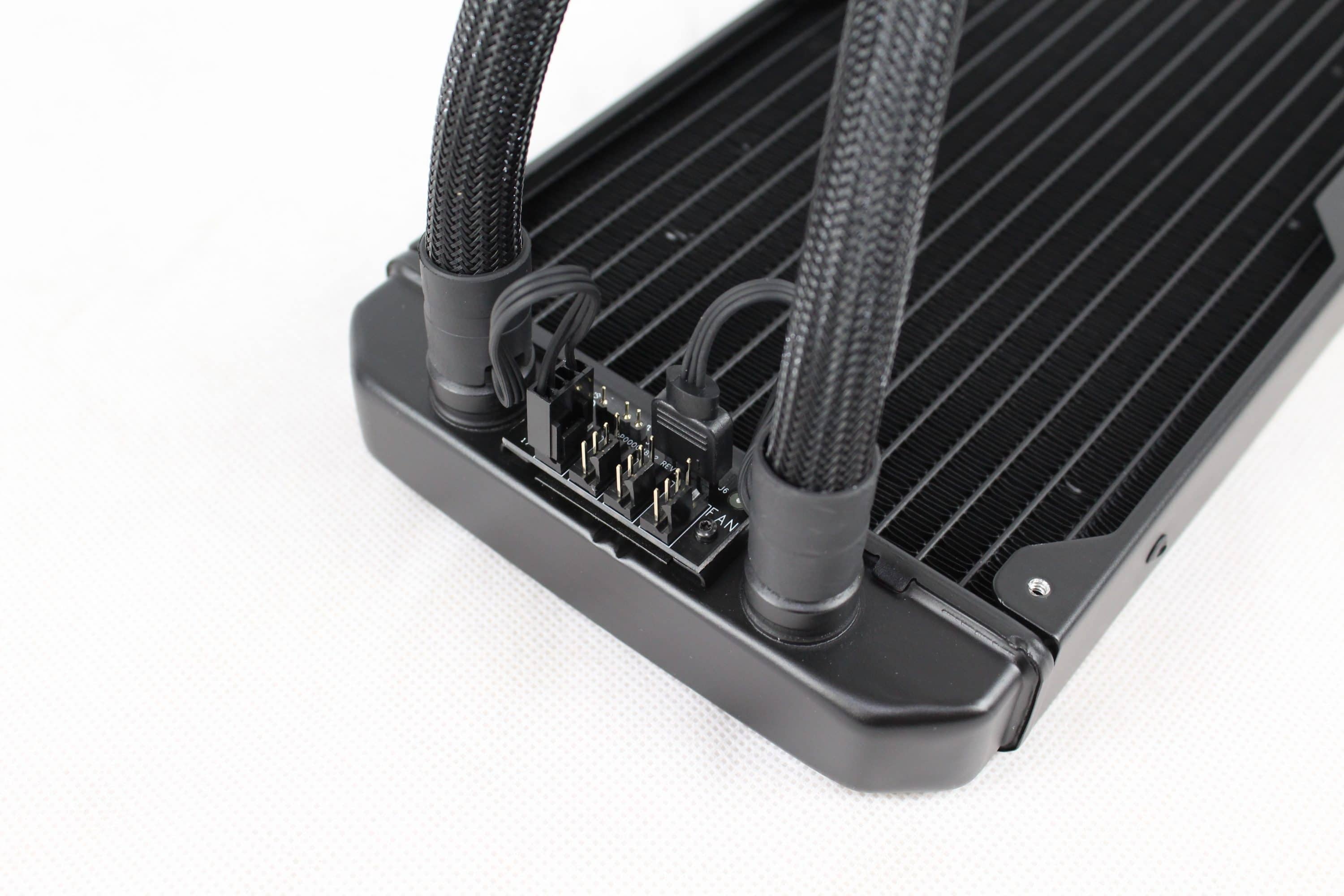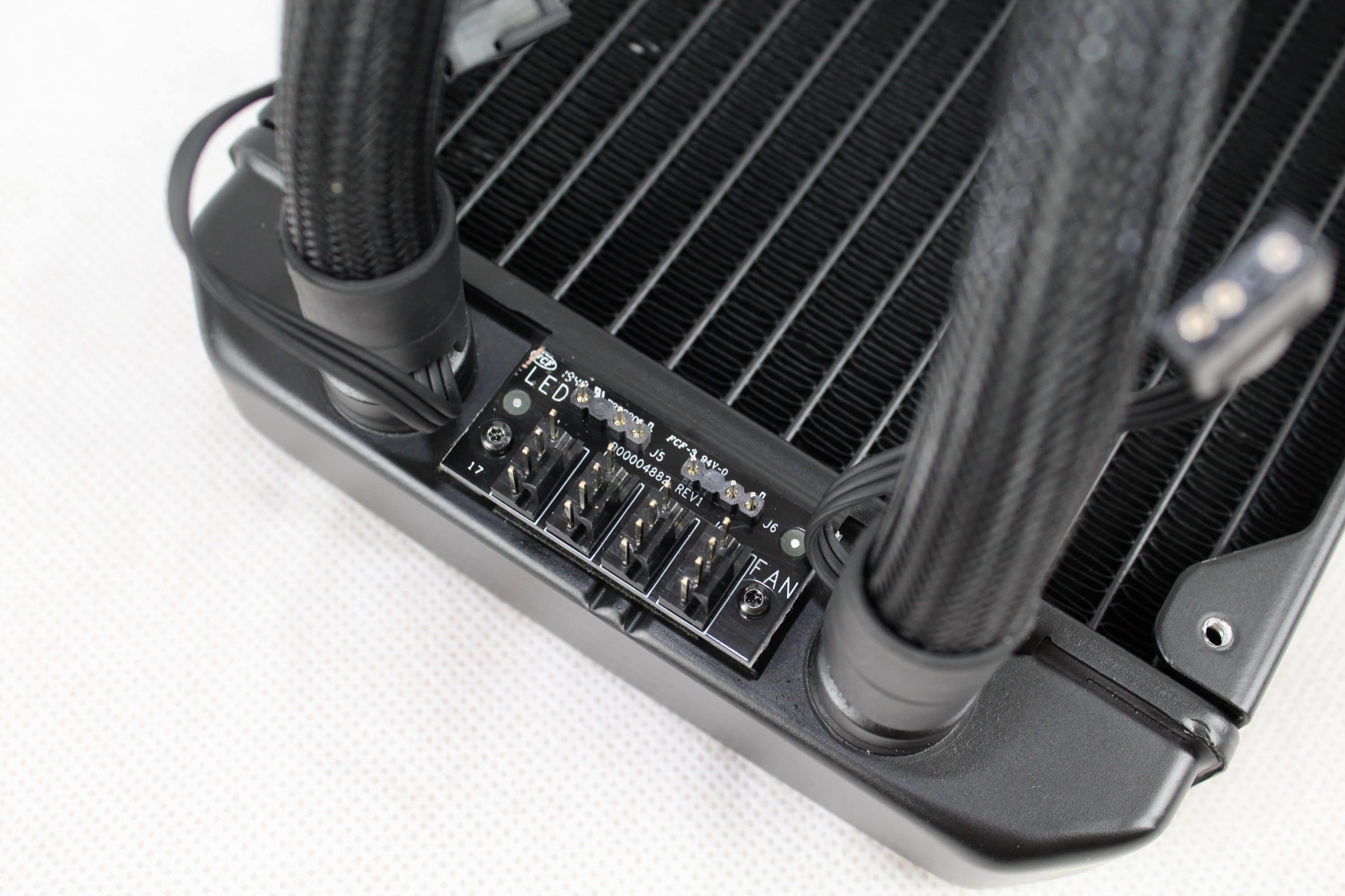 Der Anschluss aller Lüfter kann direkt über den integrierten Lüfter- und RGB-Hub zwischen den Schlauchanschlüssen am Radiator erfolgen. Von dort führt sowohl ein RGB- als auch PWM–Anschluss über die Schläuche zur Pumpe. Von dort erfolgt dann der Anschluss am Mainboard oder einem Steuercontroller. Da nur maximal zwei Kabel verlegt werden müssen, ist gutes Kabelmanagement einfach möglich.