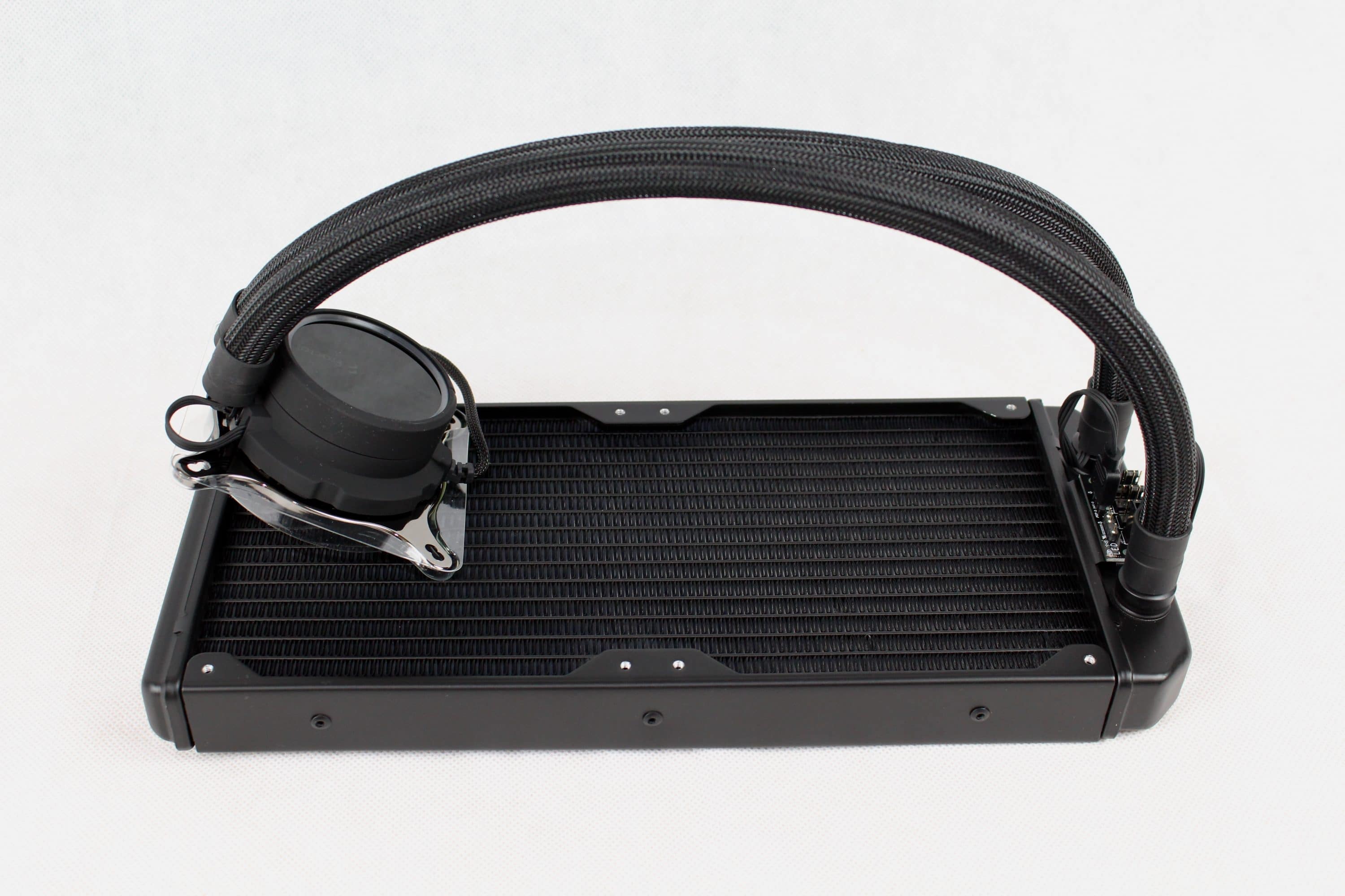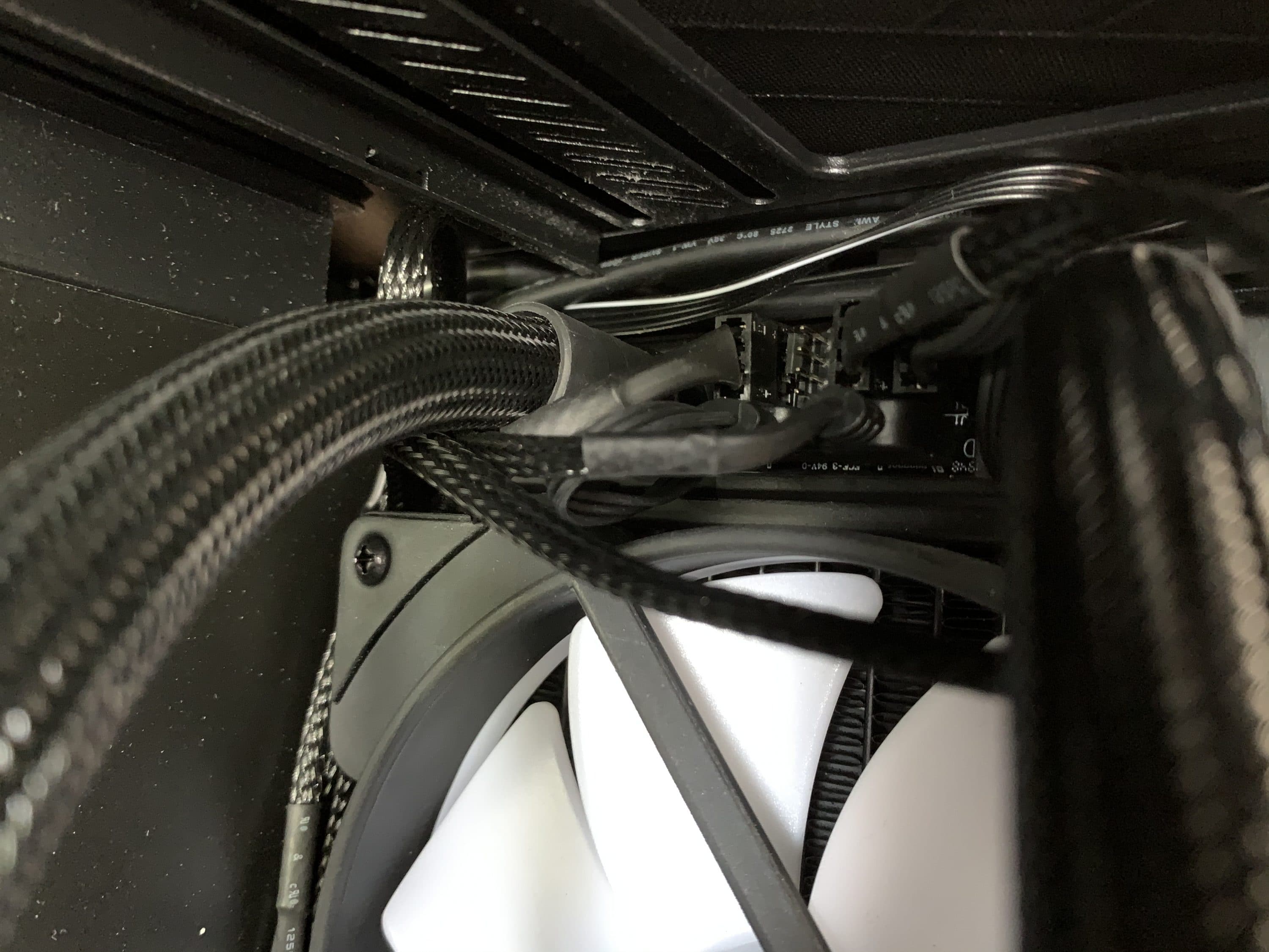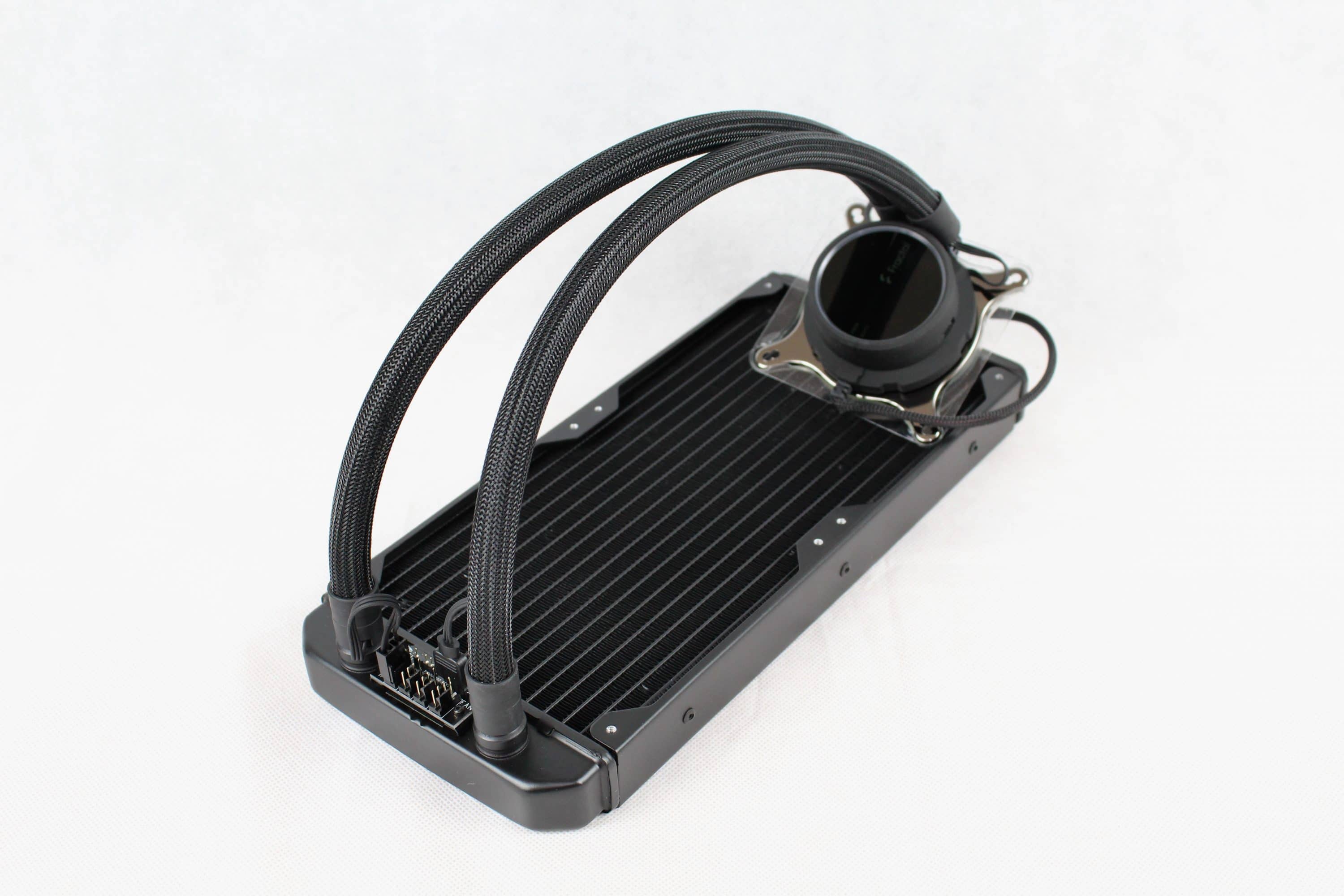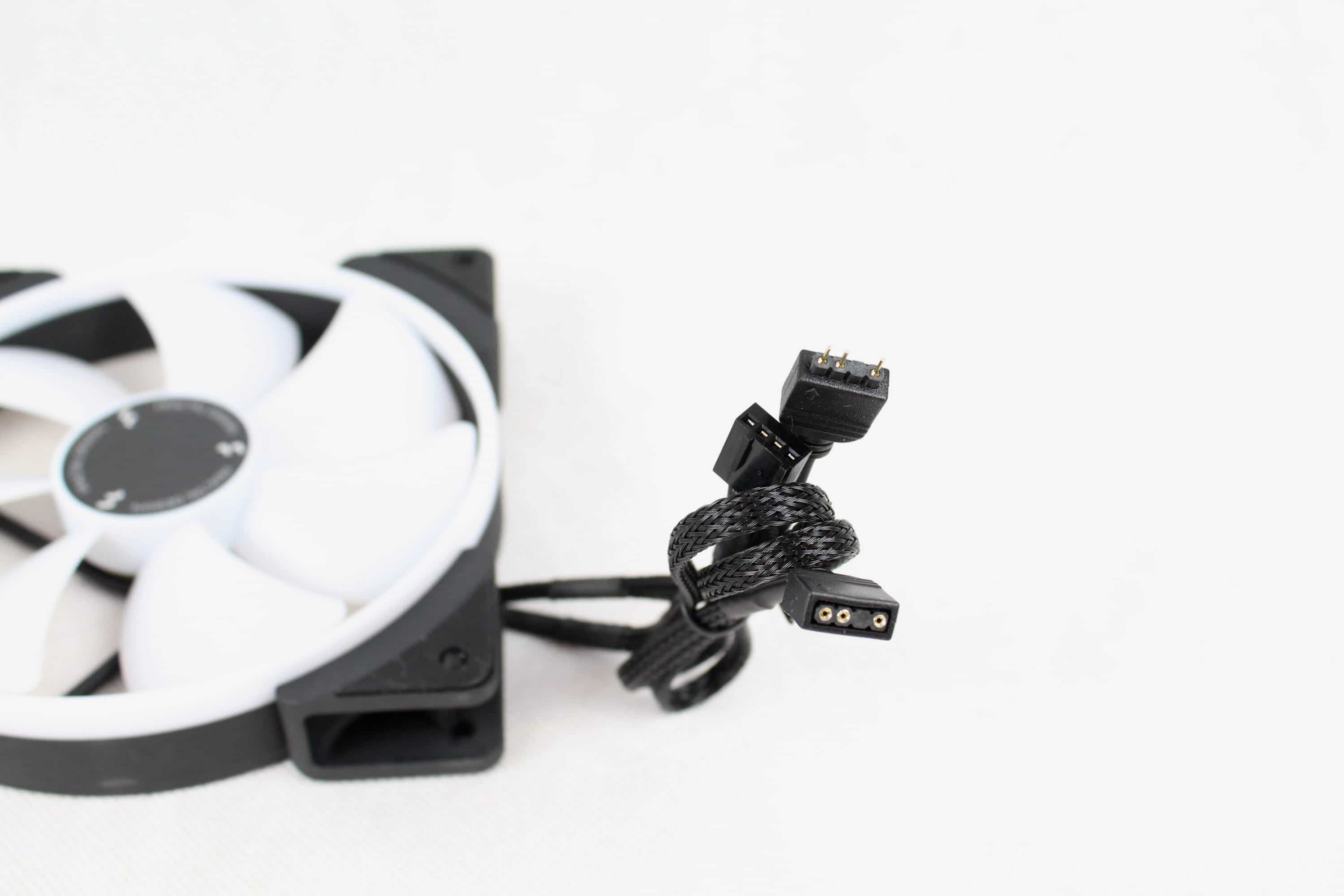 Der Anschluss aller Lüfter kann direkt über den integrierten Lüfter- und RGB-Hub zwischen den Schlauchanschlüssen am Radiator erfolgen. Von dort führt sowohl ein RGB- als auch PWM–Anschluss über die Schläuche zur Pumpe. Von dort erfolgt dann der Anschluss am Mainboard oder einem Steuercontroller. Da nur maximal zwei Kabel verlegt werden müssen, ist gutes Kabelmanagement einfach möglich.