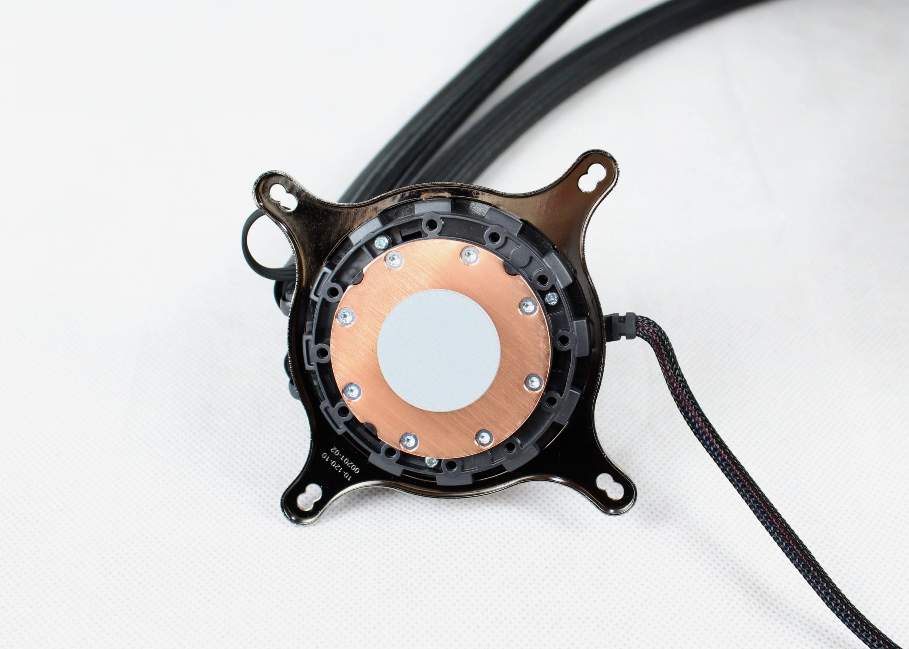 Das Pumpengehäuse ist sehr stabil. Der vormontierte Intel-Mainboard-Adapter kann problemlos durch eine kleine Drehung entfernt werden. Eine Ebene darüber kann das Gehäuse der Pumpe gedreht werden, um zwischen dem PWM und Auto Modus zu wechseln. Die Unterseite der Pumpe zeigt die Kupferoberfläche der Bodenplatte mit der ab Werk aufgetragenen Wärmeleitpaste.