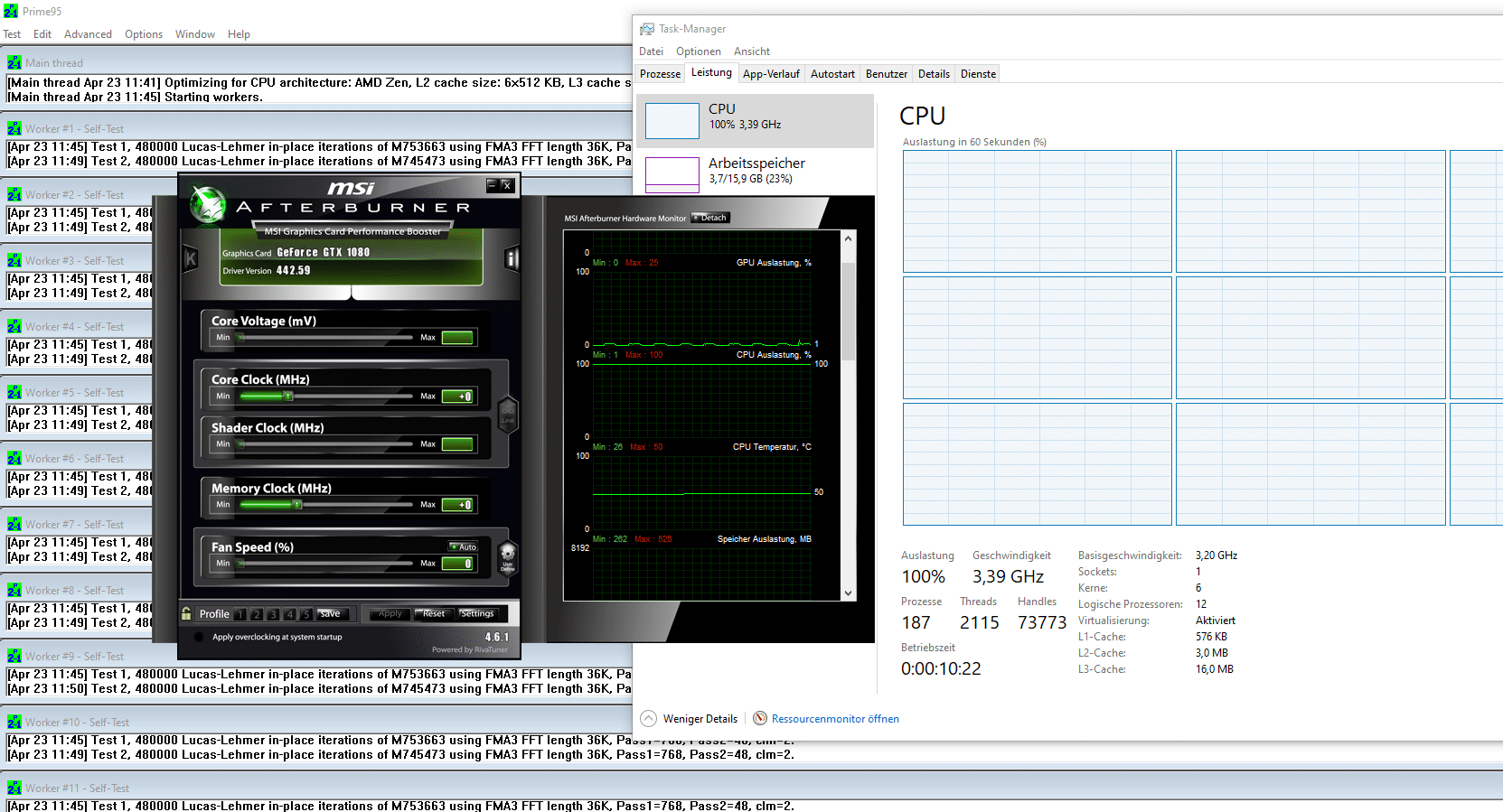 Bei maximaler Drehzahl ist die Kühlleistung beeindruckend, die Lautstärke – insbesondere der Lüfter – steigt aber auch entsprechend. Interessant im automatischen Modus: die Lautstärke nimmt mit unserem Prime95 Test nicht zu. Durchgehend sie die Lüfter leise hörbar – die Pumpe ist daher kaum wahrnehmbar.