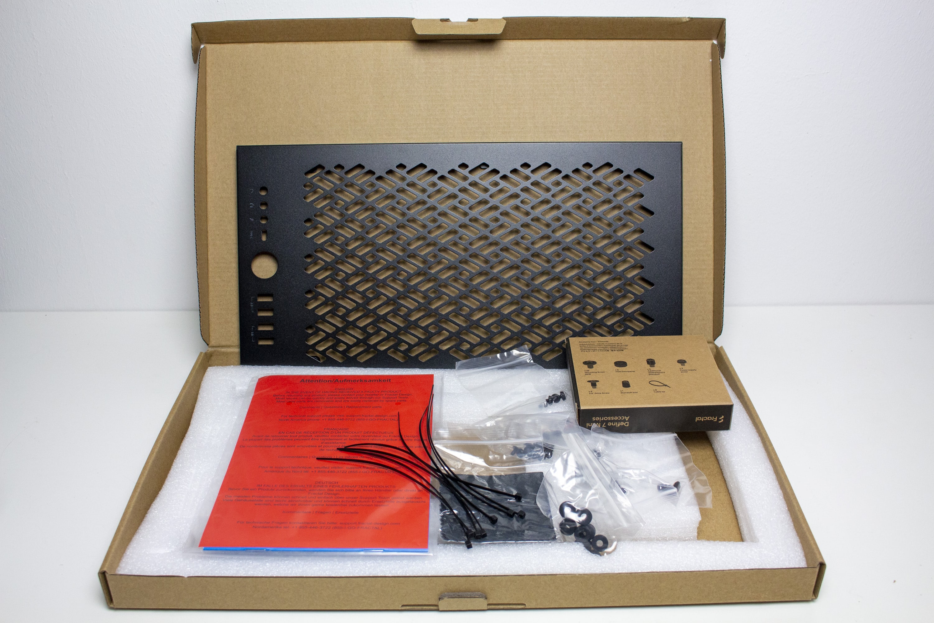 Das Montagezubehör verstaut Fractal Design in einer großen Schachtel, die im Karton seitlich neben dem Gehäuse platziert wurde. Diese beinhaltet eine weitere Schachtel mit allen notwendigen Schrauben sowie einigen Kabelbindern, einer ausführlichen Montageanleitung sowie Garantieinformationen und ein Wechselcover aus Stahl für den Deckel des Mini-Towers. Außerdem gehören zum mitgelieferten Zubehör vier vorinstallierte Staubfilter, ein Putztuch aus Mikrofaser sowie zwei vorinstallierte Gehäuselüfter.