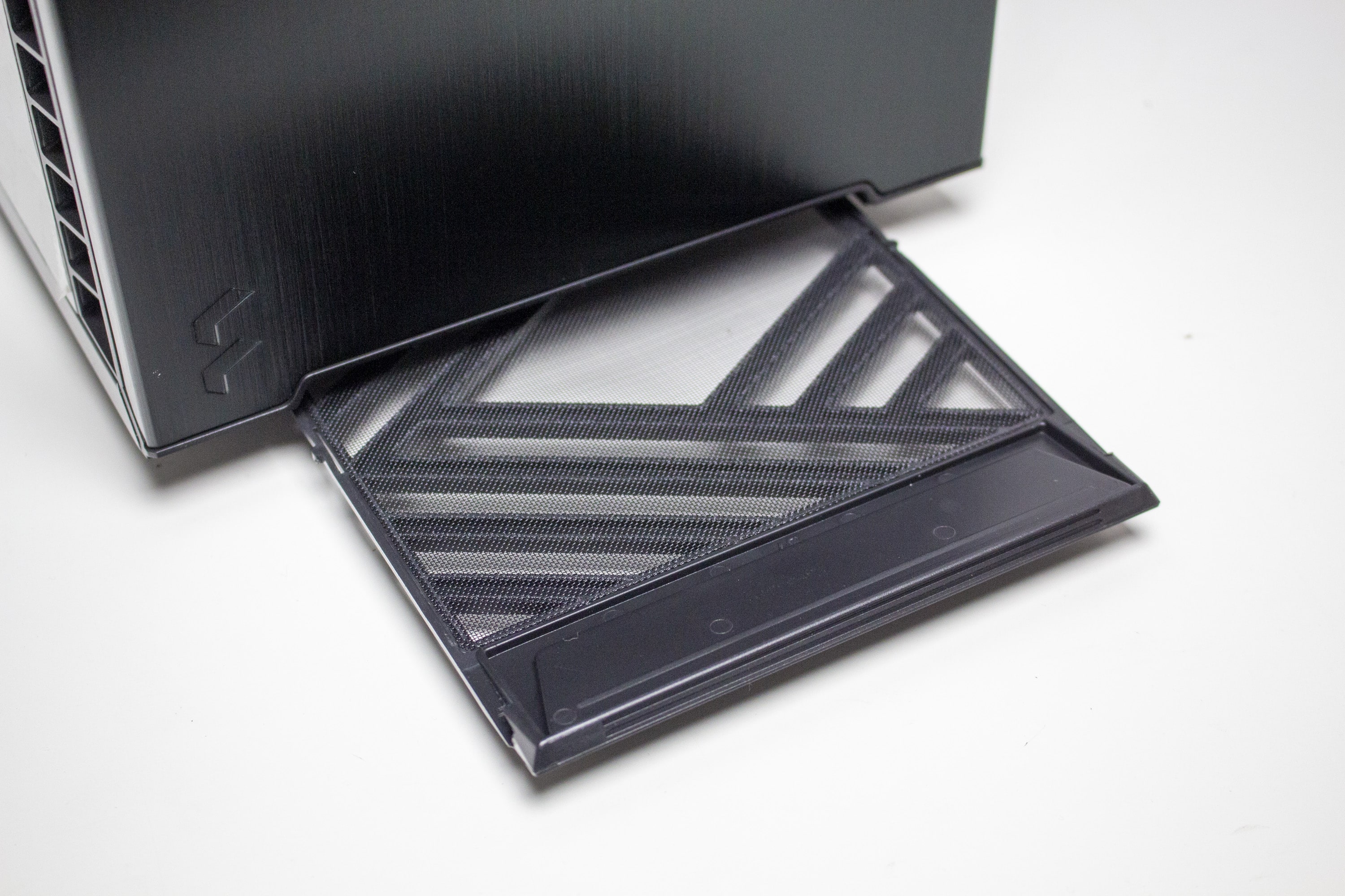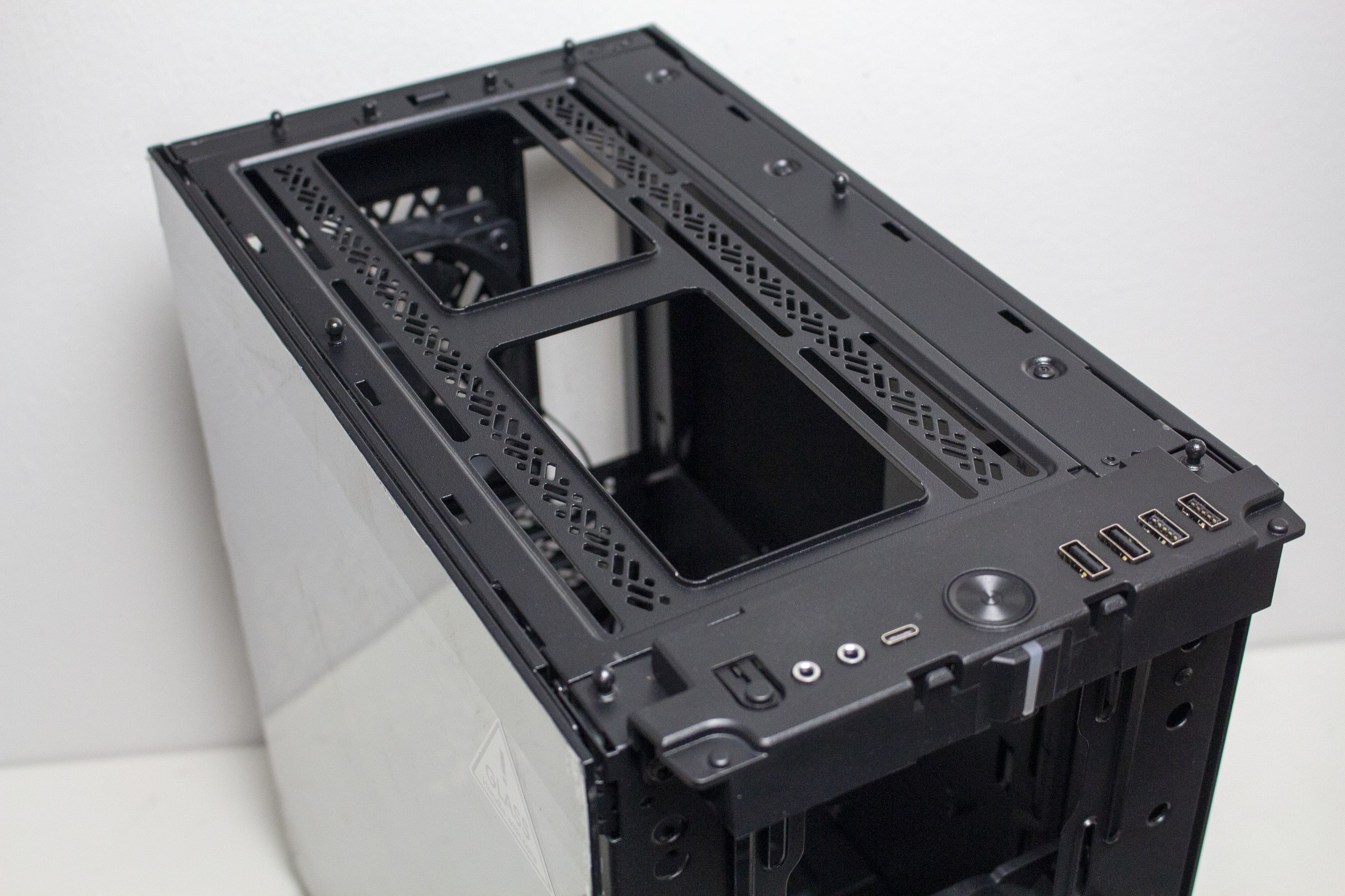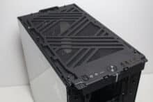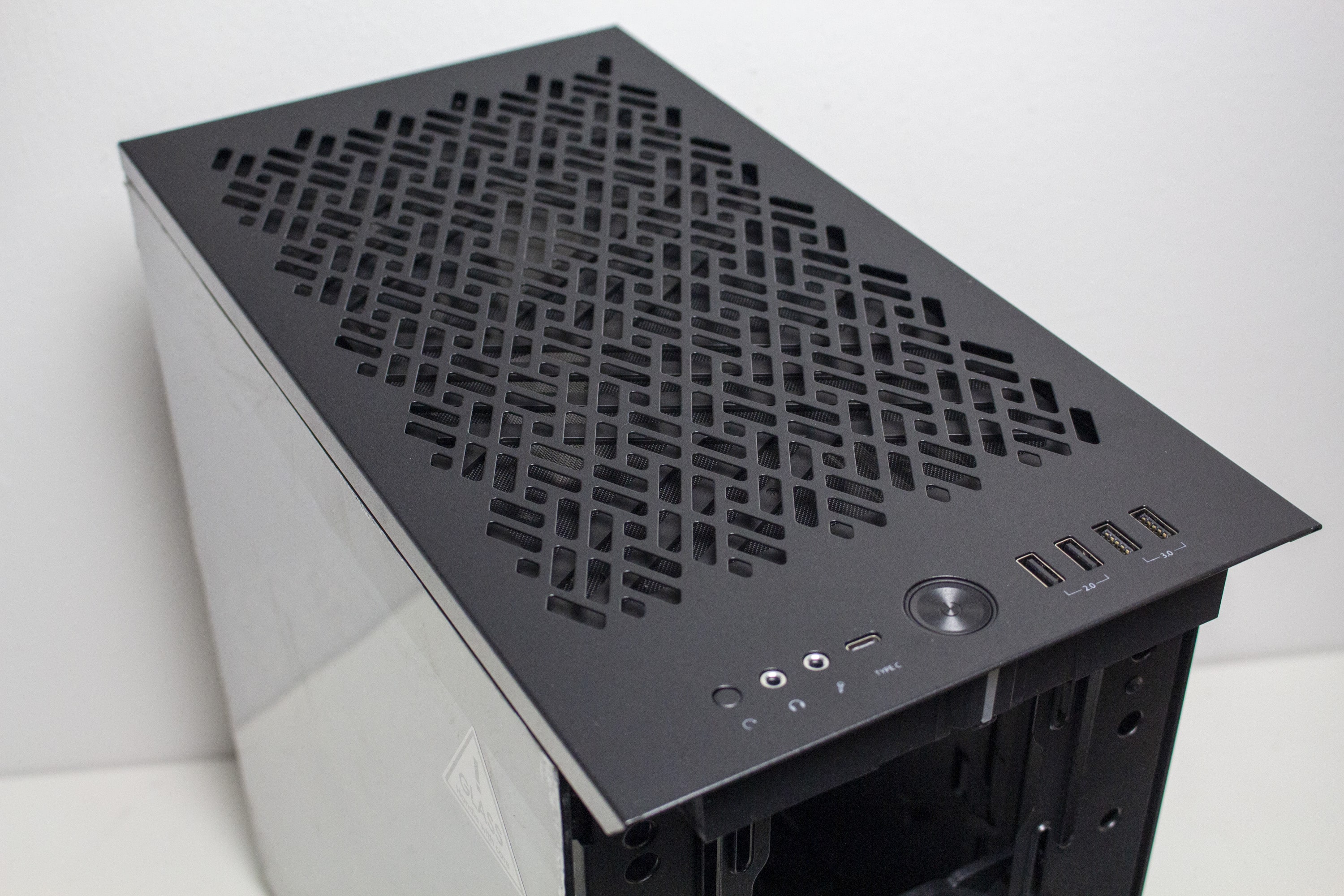 Der Deckel des Mini-Towers ist ab Werk komplett geschlossen und besteht aus einer gedämmten Stahlplatte unter der ein abnehmbarer Staubfilter platziert wurde. Das ergibt auf den ersten Blick zwar keinen Sinn, erklärt sich aber, wenn man die Stahlplatte entfernt und stattdessen den Deckel mit geschlitzten Belüftungsöffnungen montiert. Die Montage erfolgt werkzeuglos über Push-Pins aus Stahl und funktioniert sehr gut. Unterhalb des Staubfilters finden wir zudem einen Luftauslass für zwei 120- oder 140-mm-Lüfter, dessen Rahmen bei Bedarf auch ausgebaut werden kann.