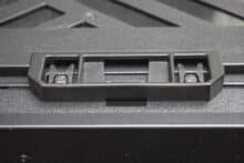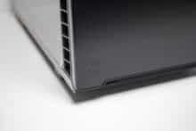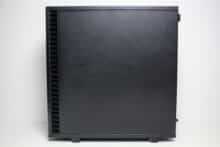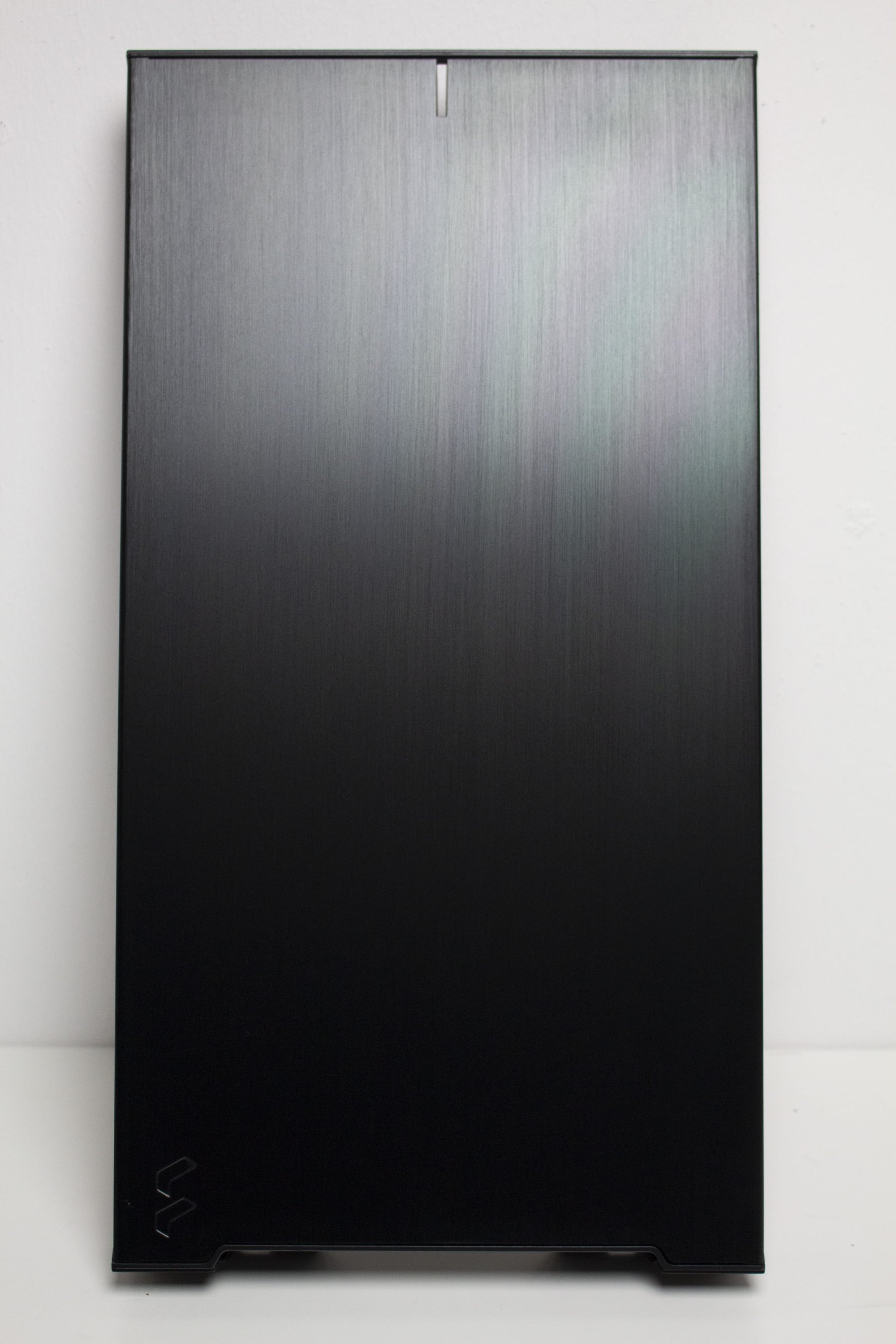 Grundsätzlich ist die Define-Serie für ein sehr schlichtes Design bekannt. Das ist auch beim Define 7 Mini nicht anders. Das Frontpanel ist im vorderen Bereich vollständig geschlossen und besteht aus einer gebürsteten Aluminiumplatte, welche auf einen Rahmen aus Kunststoff geklebt wurde und auf dessen Innenseite sich zudem einen Dämmmatte befindet. Auf eine Tür verzichtet Fractal Design beim Define 7 Mini vollständig. Stattdessen gibt es beidseitig eingearbeitete Belüftungsöffnungen inklusive modularer Staubfilter. Neben dem Fractal Design Logo gibt es im unteren Bereich zudem eine Griffmulde, mit welcher das Frontpanel abgezogen werden kann. Dahinter finden sich Montageschienen für drei 120- oder zwei 140-mm-Gehäuselüfter. Einen 140-mm-Lüfter hat Fractal Design hier bereits vorinstalliert.