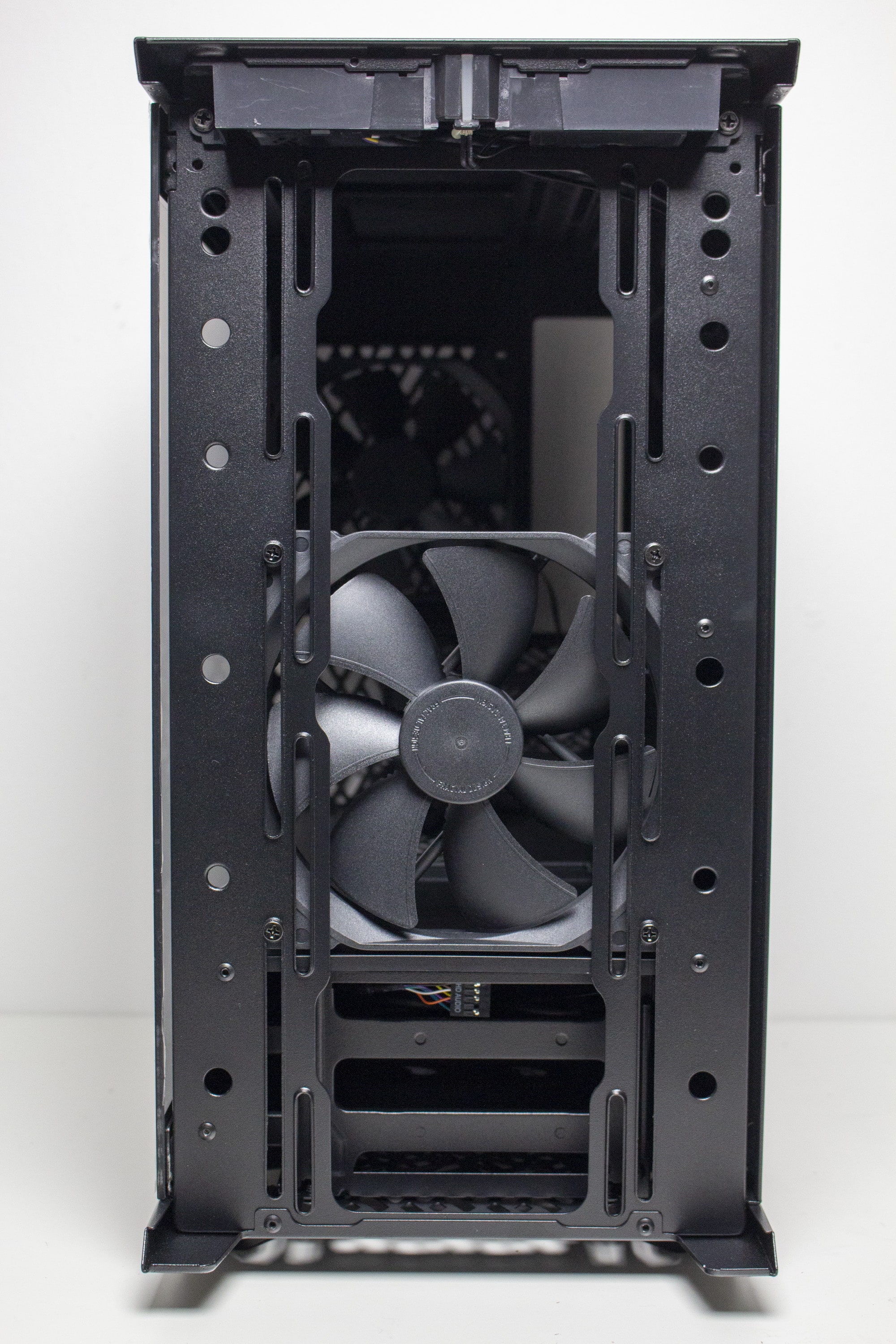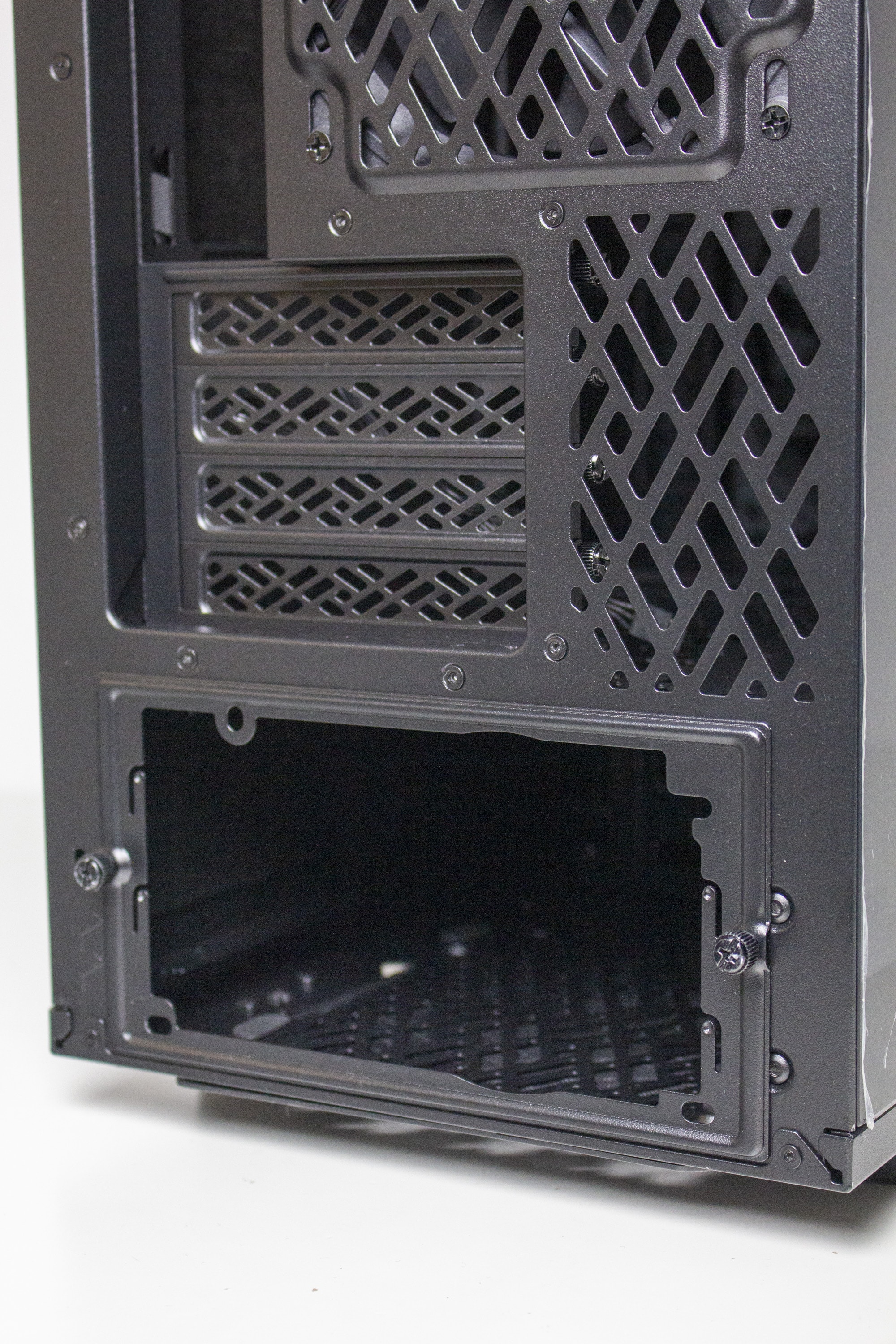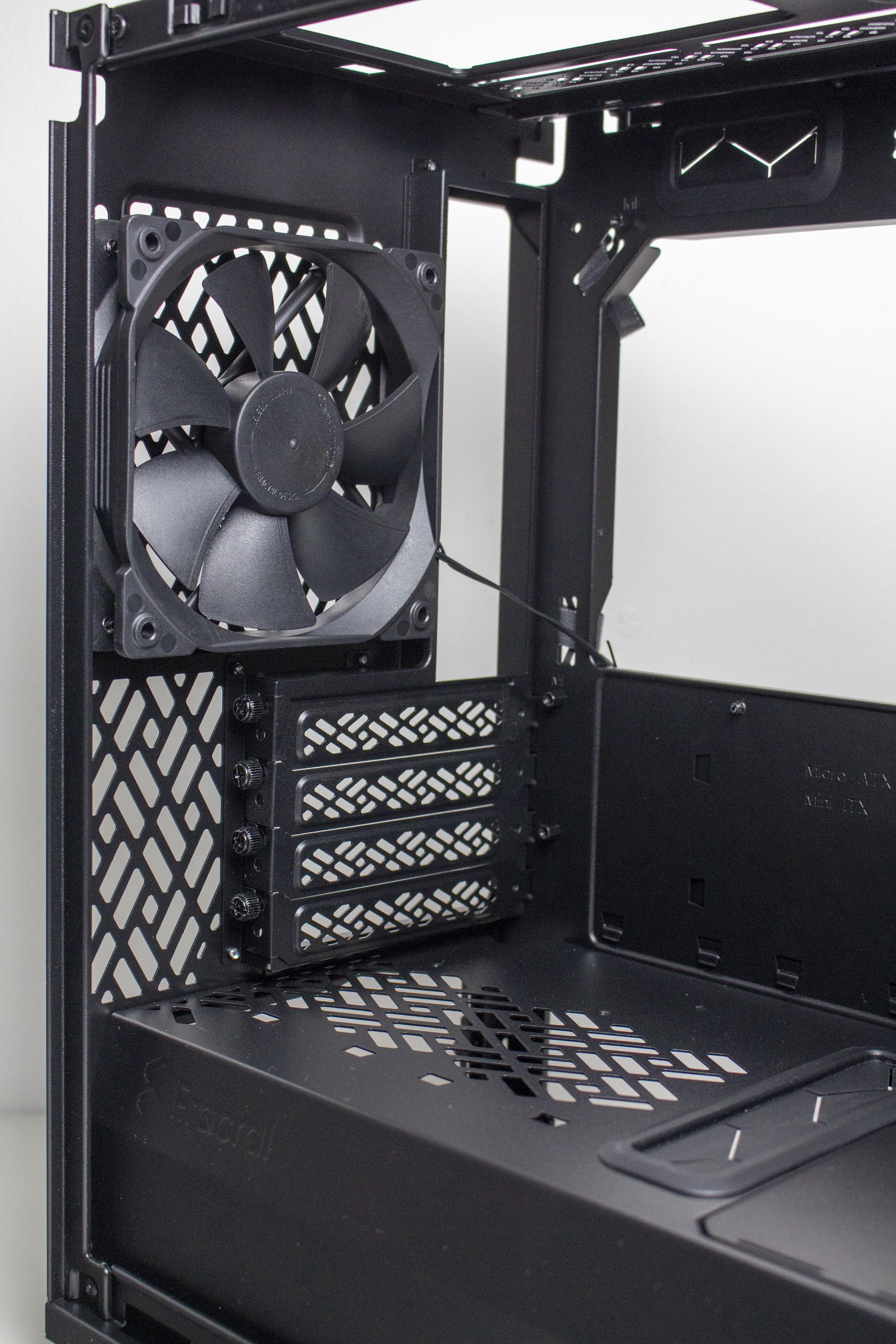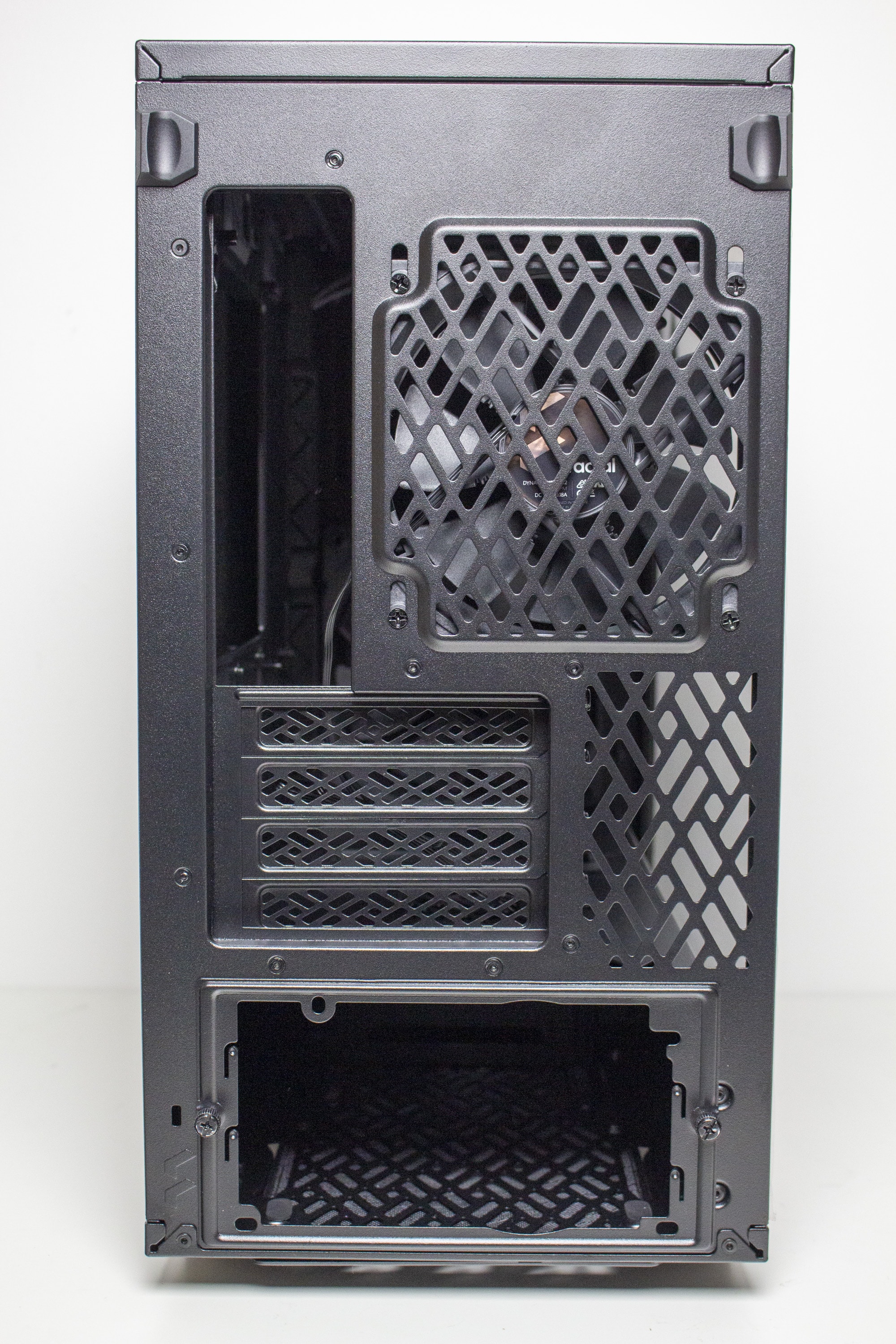 An der Rückseite zeigt sich ein typisches Erscheinungsbild für einen aktuellen Mini-Tower. Das Netzteil wird unten platziert und über einem modularen Stahlrahmen von hinten in den Korpus geschoben. Darüber finden wir vier belüftete PCI-Slotblenden und rechts neben den Blenden eine weitere Belüftungsöffnung. Im oberen Bereich der Rückseite lässt sich zudem der zweite Gehäuselüfter mit einer Rahmenbreite von 120 Millimetern entdecken.