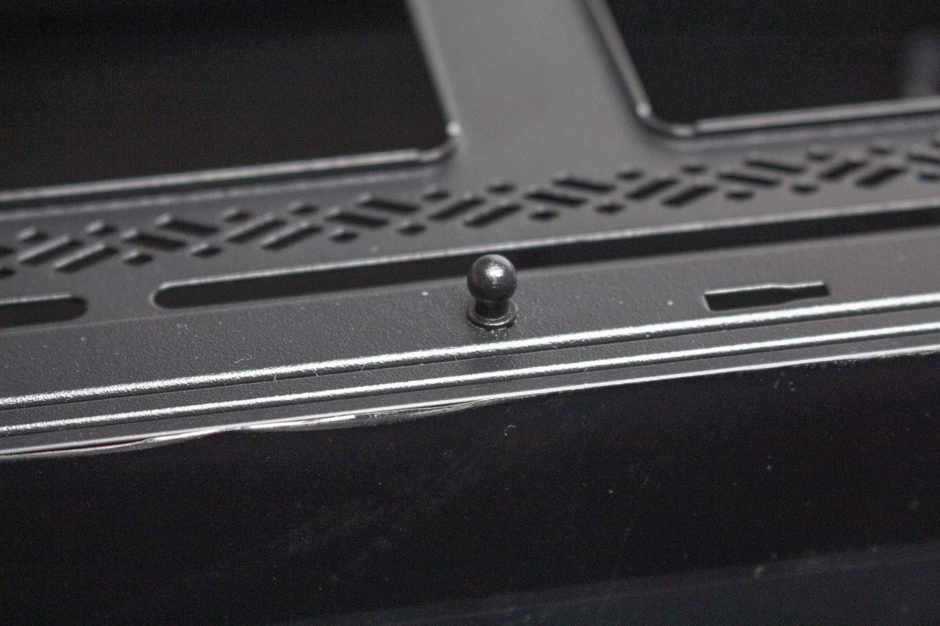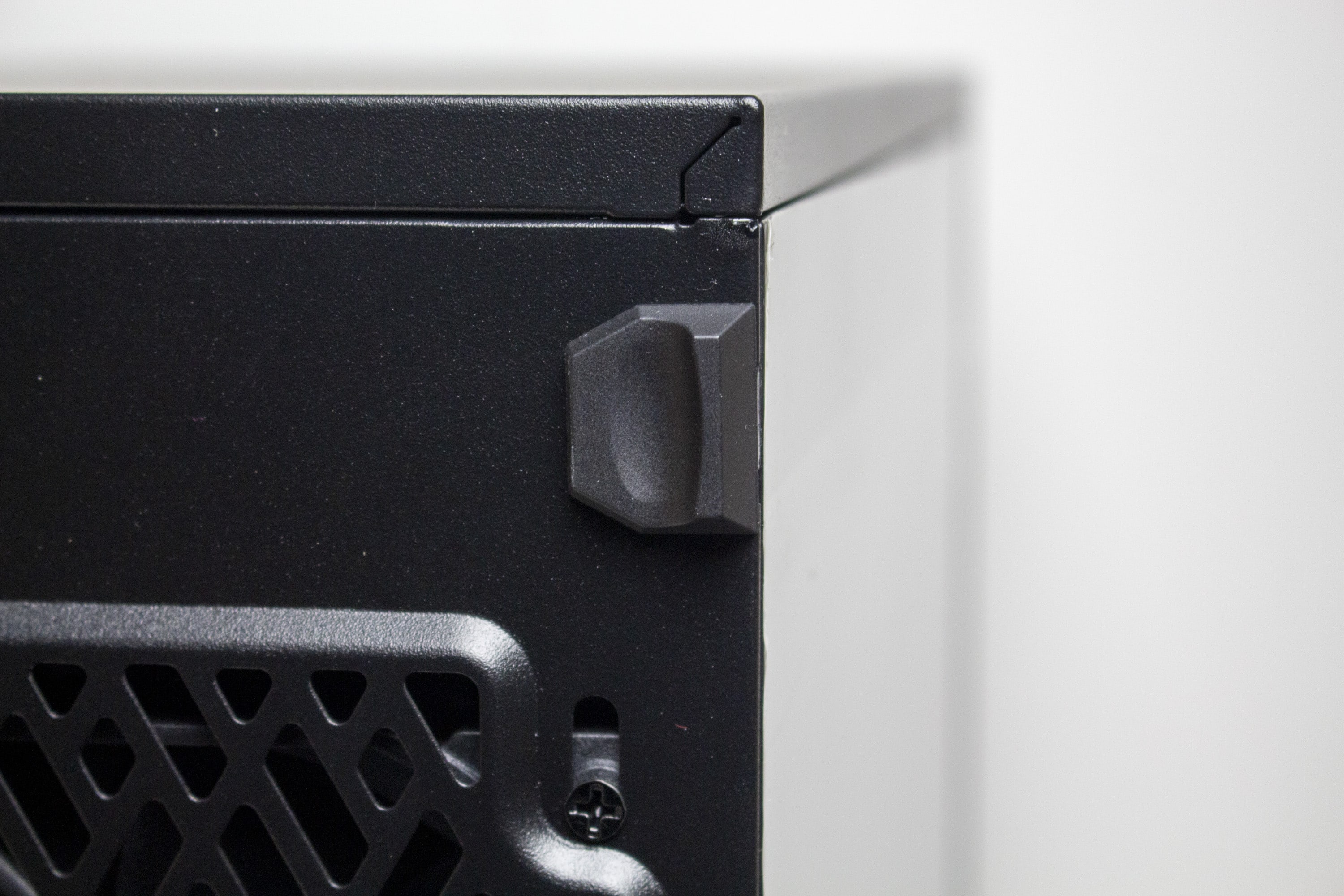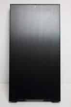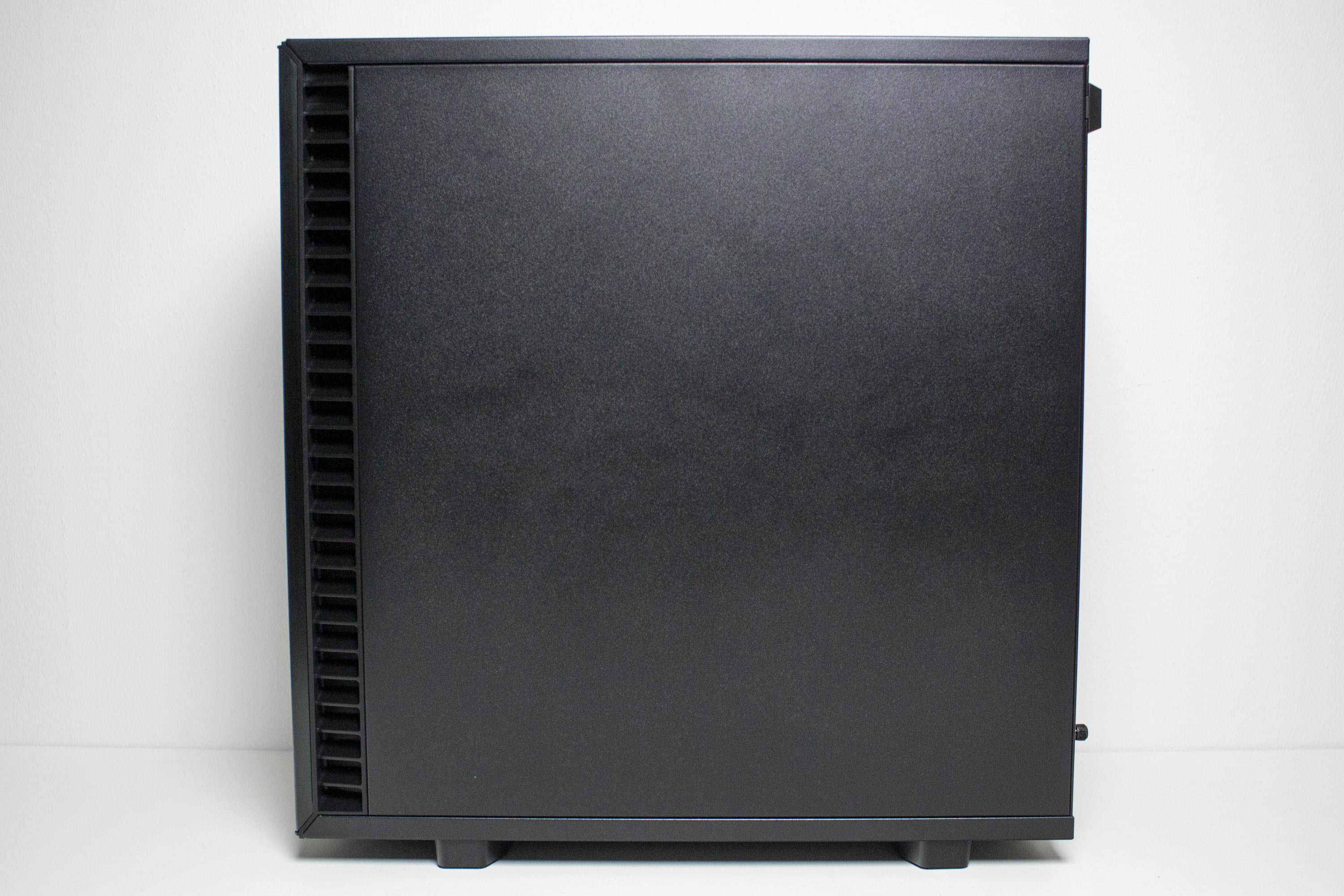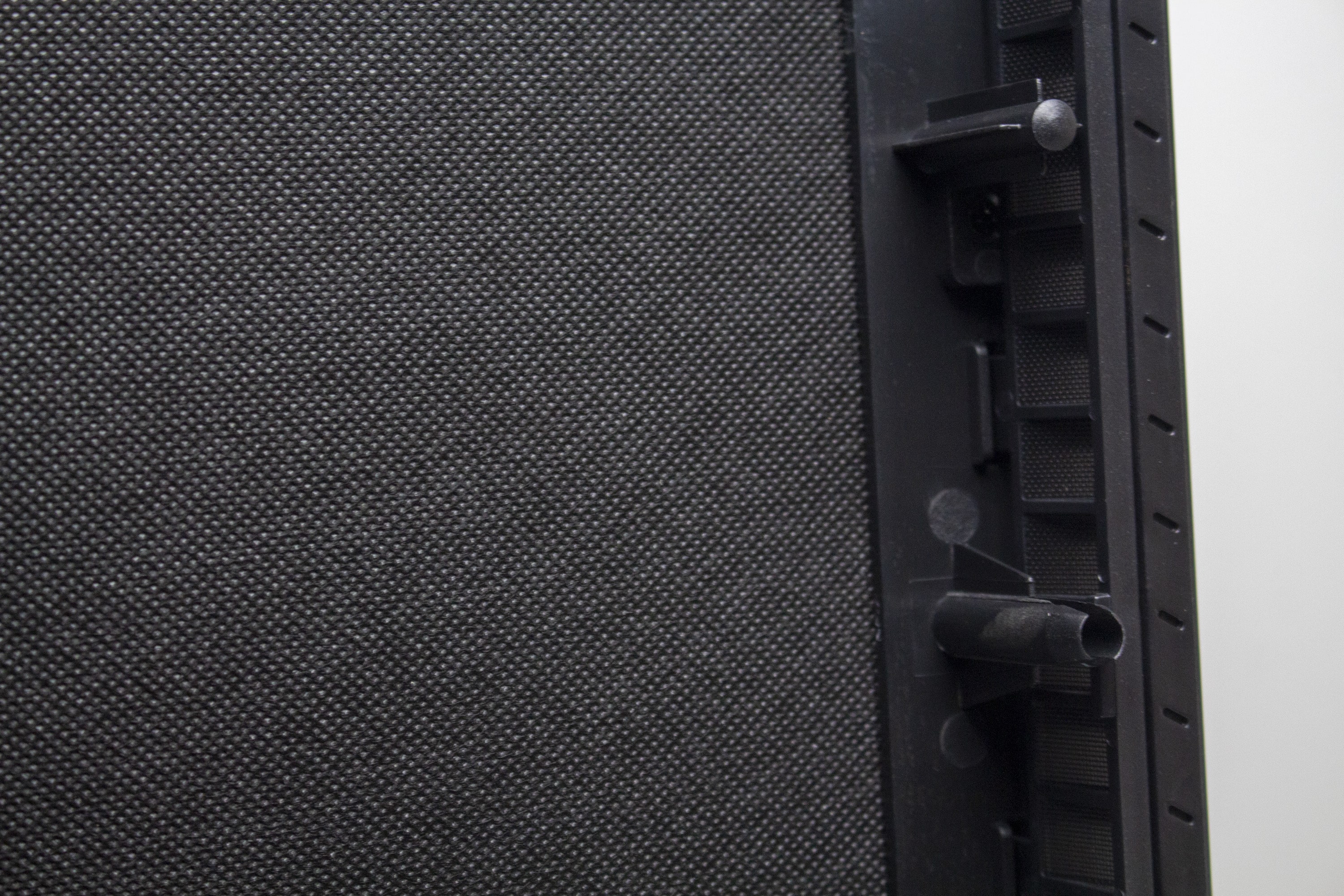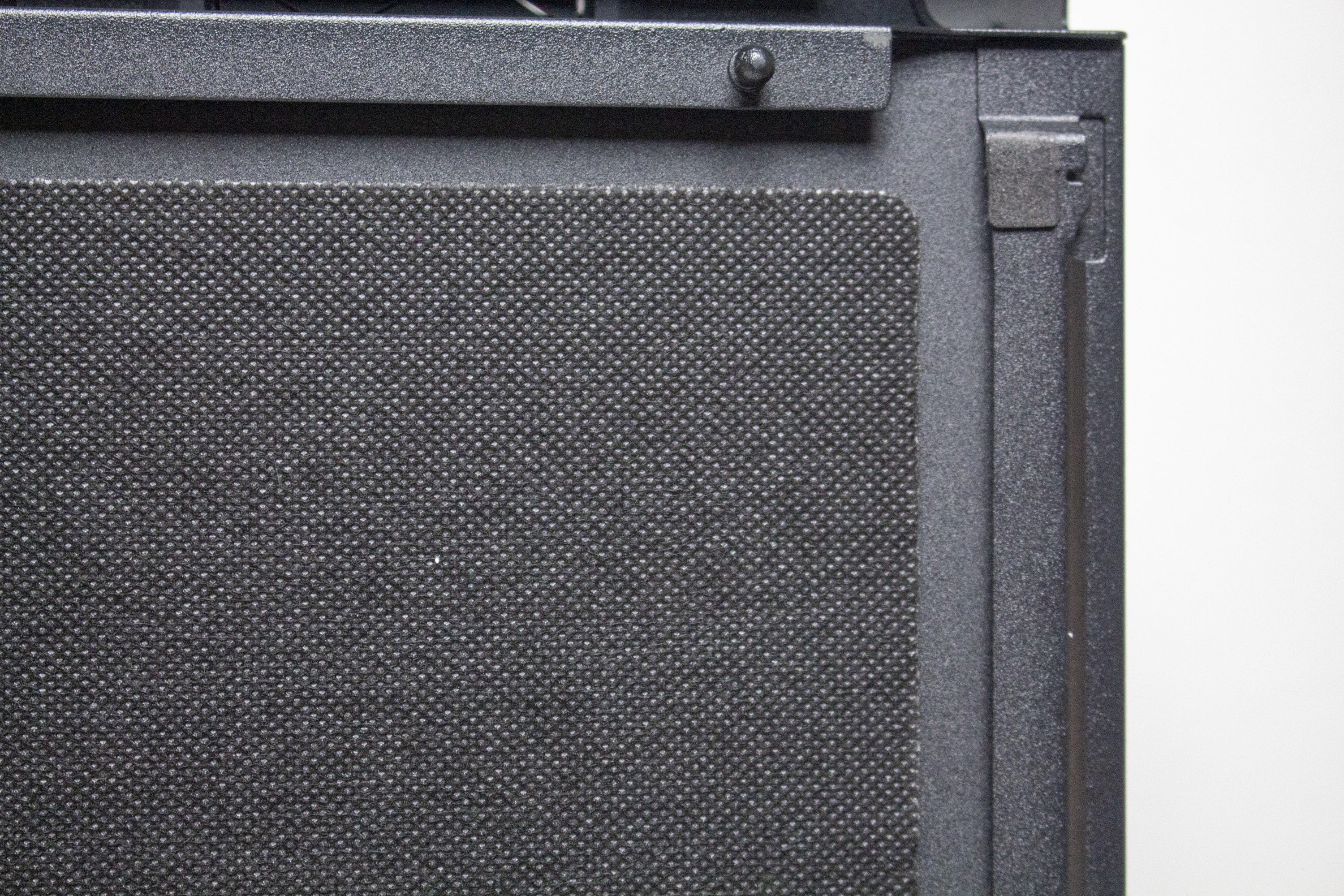 Bei unserer Variante besteht das linke Seitenteil aus Hartglas, welches ab Werk nur leicht getönt und auf einem dünnen Stahlrahmen geklebt wurde. Das rechte Sidepanel wurde aus Stahl gefertigt und im Inneren mit einer Dämmmatte beklebt, welche dem Stahl eine zusätzliche Stabilität verleiht. Die Befestigung am Korpus erfolgt bei beiden Seitenteilen über Push-Pins aus Stahl, die am Korpus in entsprechende Aufnahmen einrasten. Über einen Griff an der Rückseite könnte die Sidepanels einfach abgezogen werden. Hinter dem Frontpanel gibt es zudem noch Löcher für die optionale Befestigung von Schrauben.