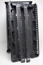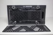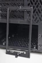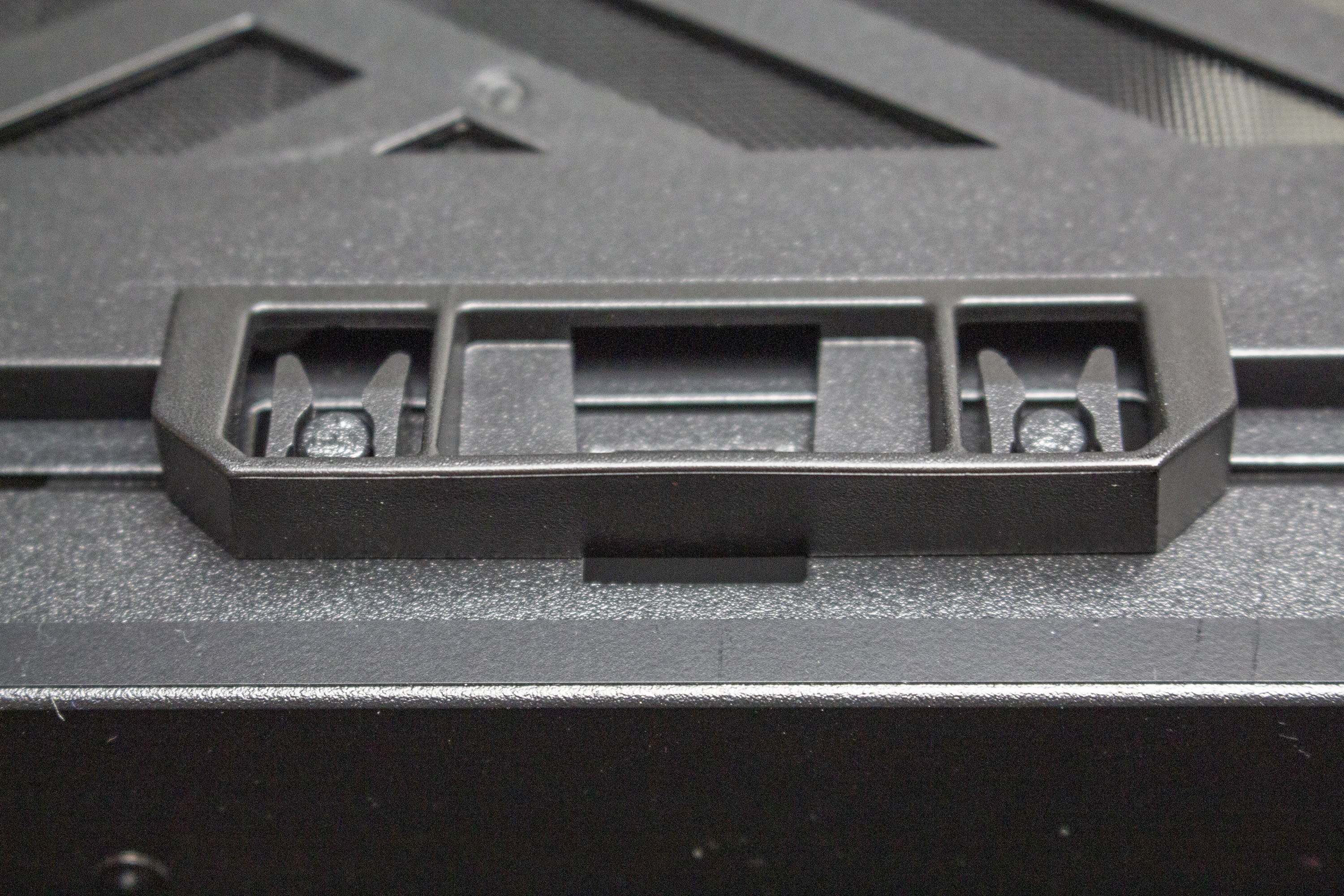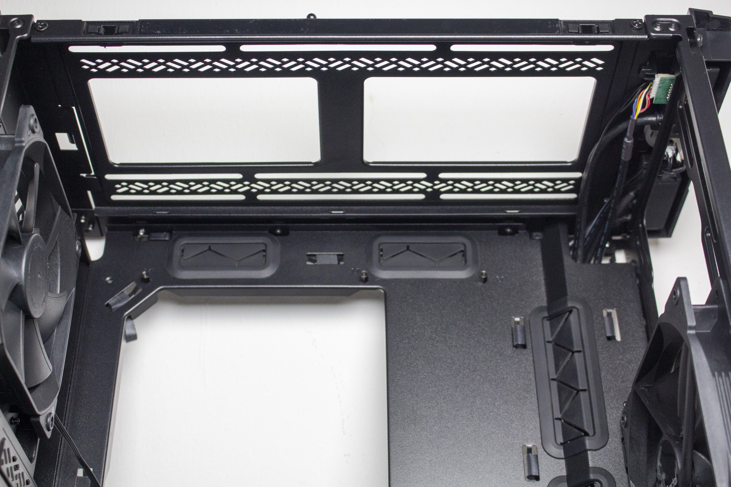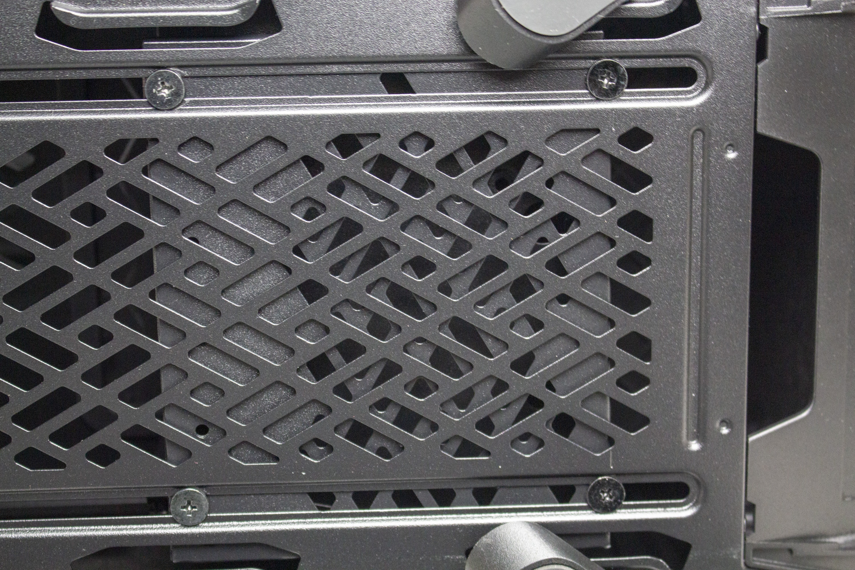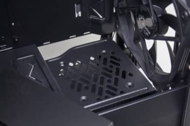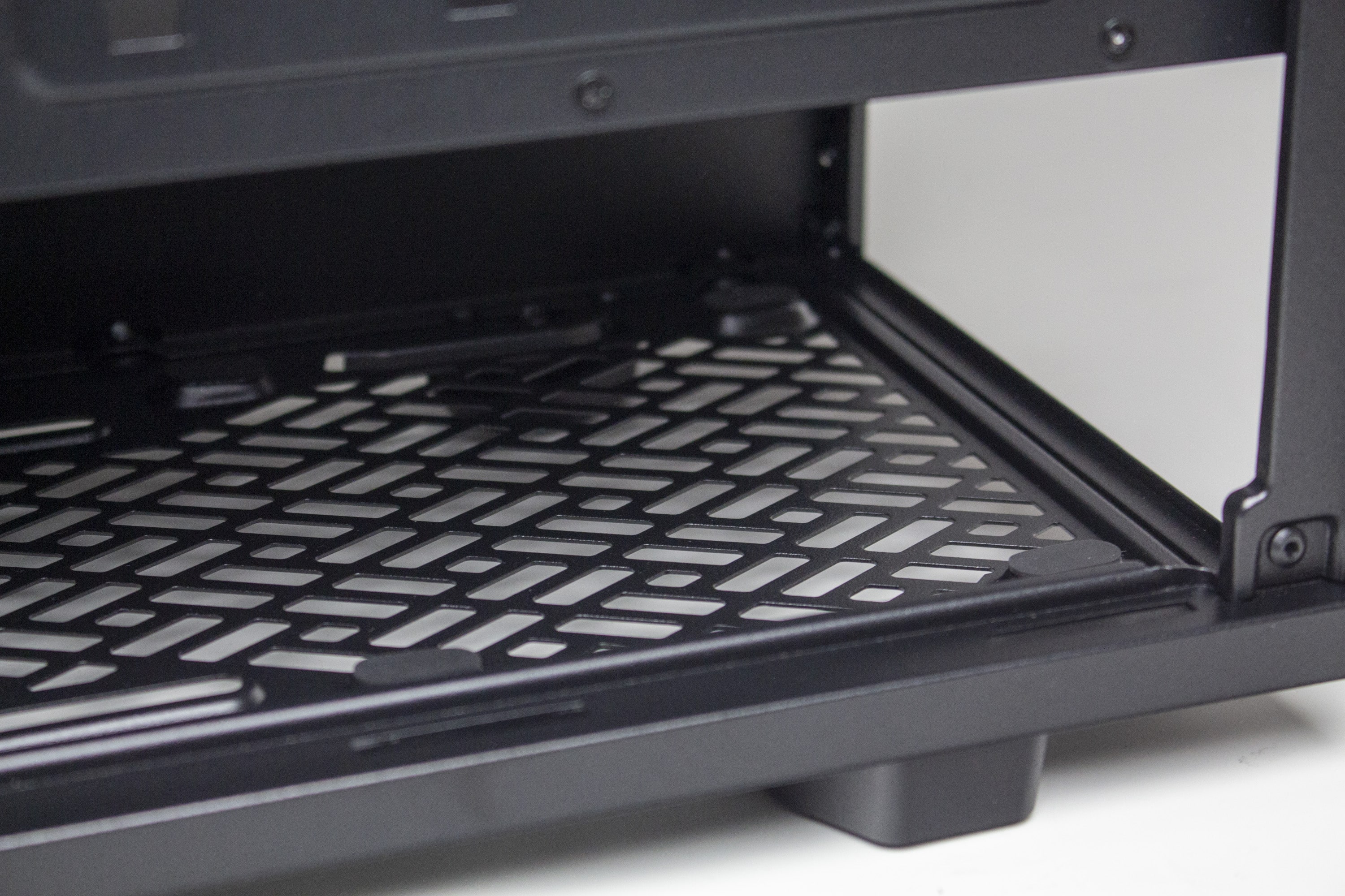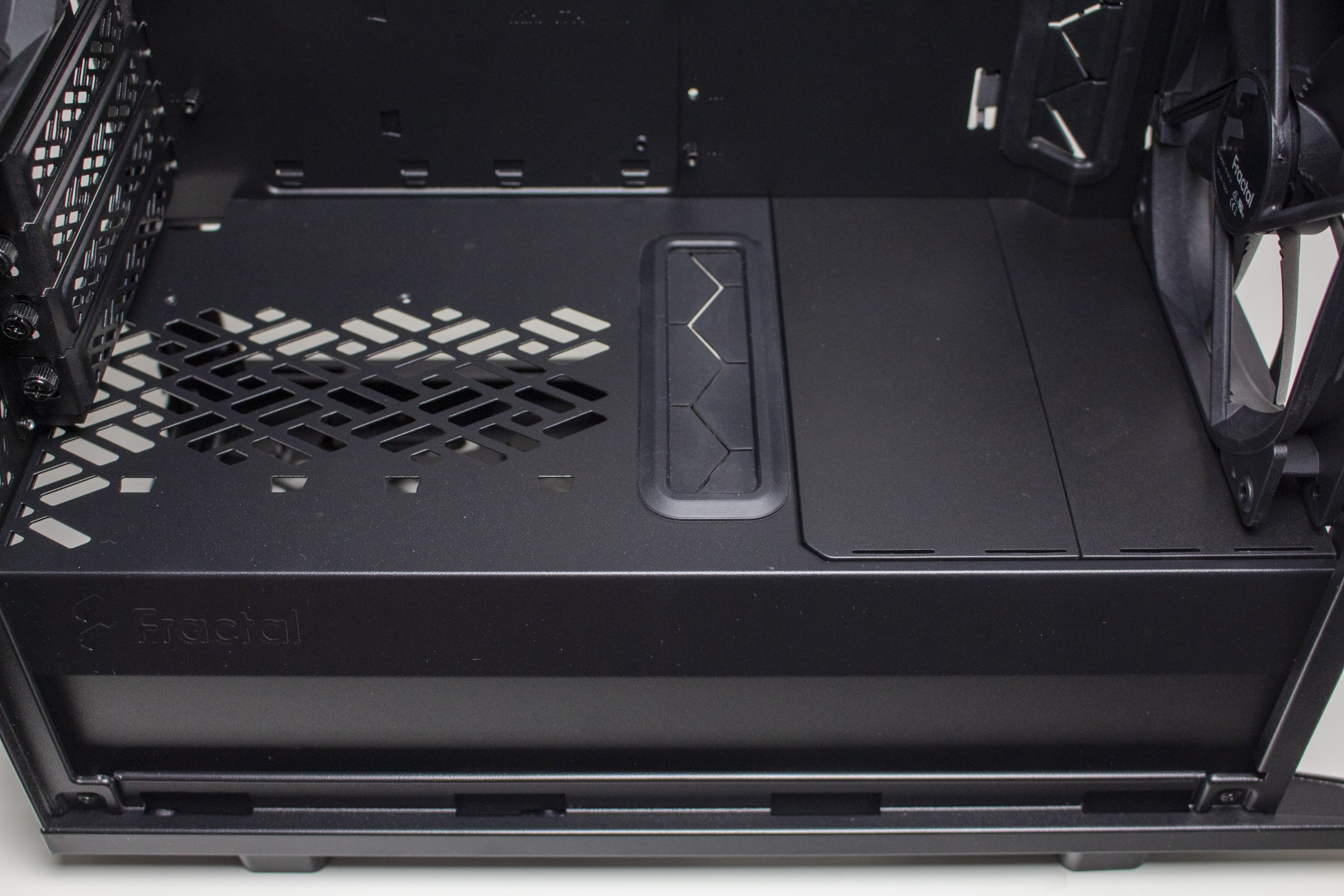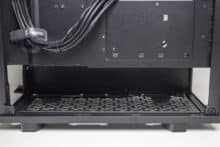 Die Netzteilkammer im unteren Bereich wird durch eine Stahlblende von der Hauptkammer abgetrennt. Neben einem eingestanzten Herstellerlogo verfügt die Blende über zwei weitere Kabelmanagementöffnungen, eine davon mit Gummimanschette, und weitere Belüftungsöffnungen. Letztere erlauben eine Orientierung des Netzteils mit dem Lüfter nach oben. Der vordere Bereich der Blende besteht nicht aus Stahl, verfügt dafür aber über zwei modulare Kunststoffplatten, die entfernt werden können. Das ist zum Beispiel nötig, wenn in der Front eine Wasserkühlung befestigt werden soll.