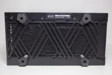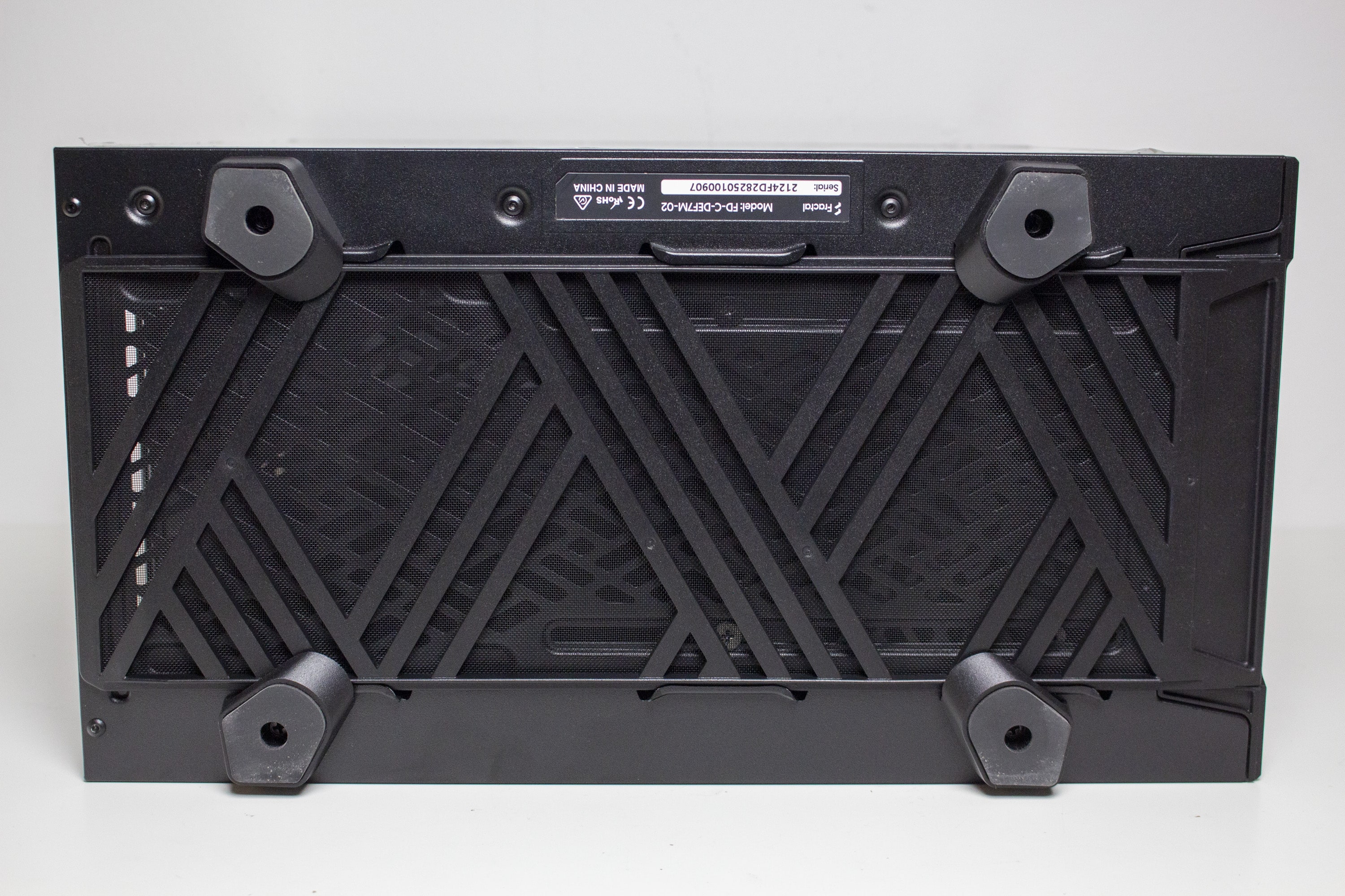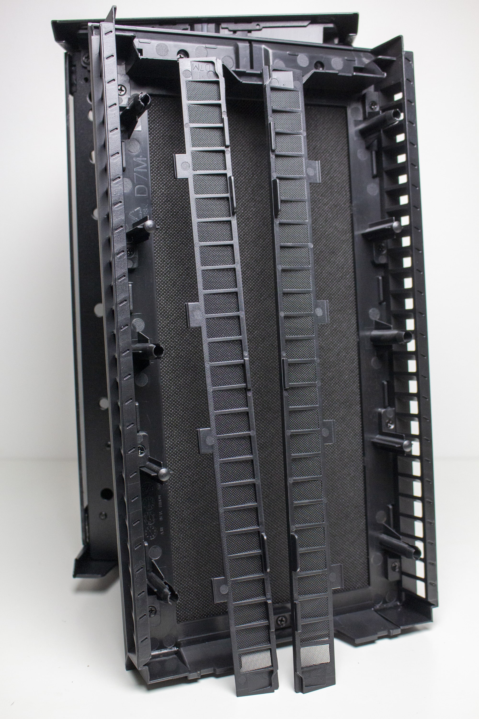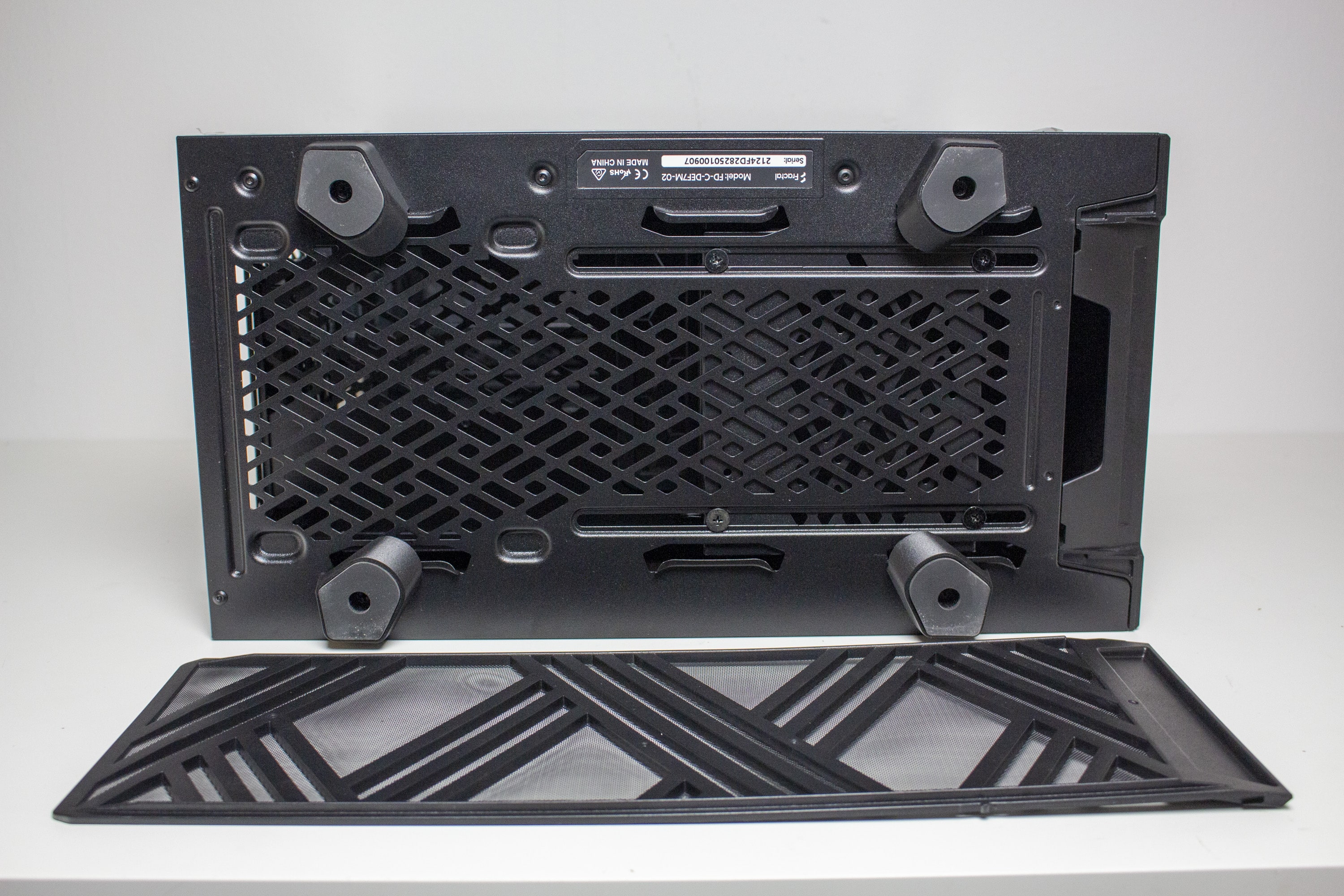 Die Unterseite des Define 7 Mini wird durch einen riesigen Staubfilter aus meinem Netzstoff dominiert, der sich zur Reinigung einfach nach vorne entfernen lässt. Er soll die Luft für das Netzteil sowie einen optionalen 120-mm-Lüfter im Boden filtern, welchen man montieren kann, wenn der modulare HDD-Käfig entfernt wird.