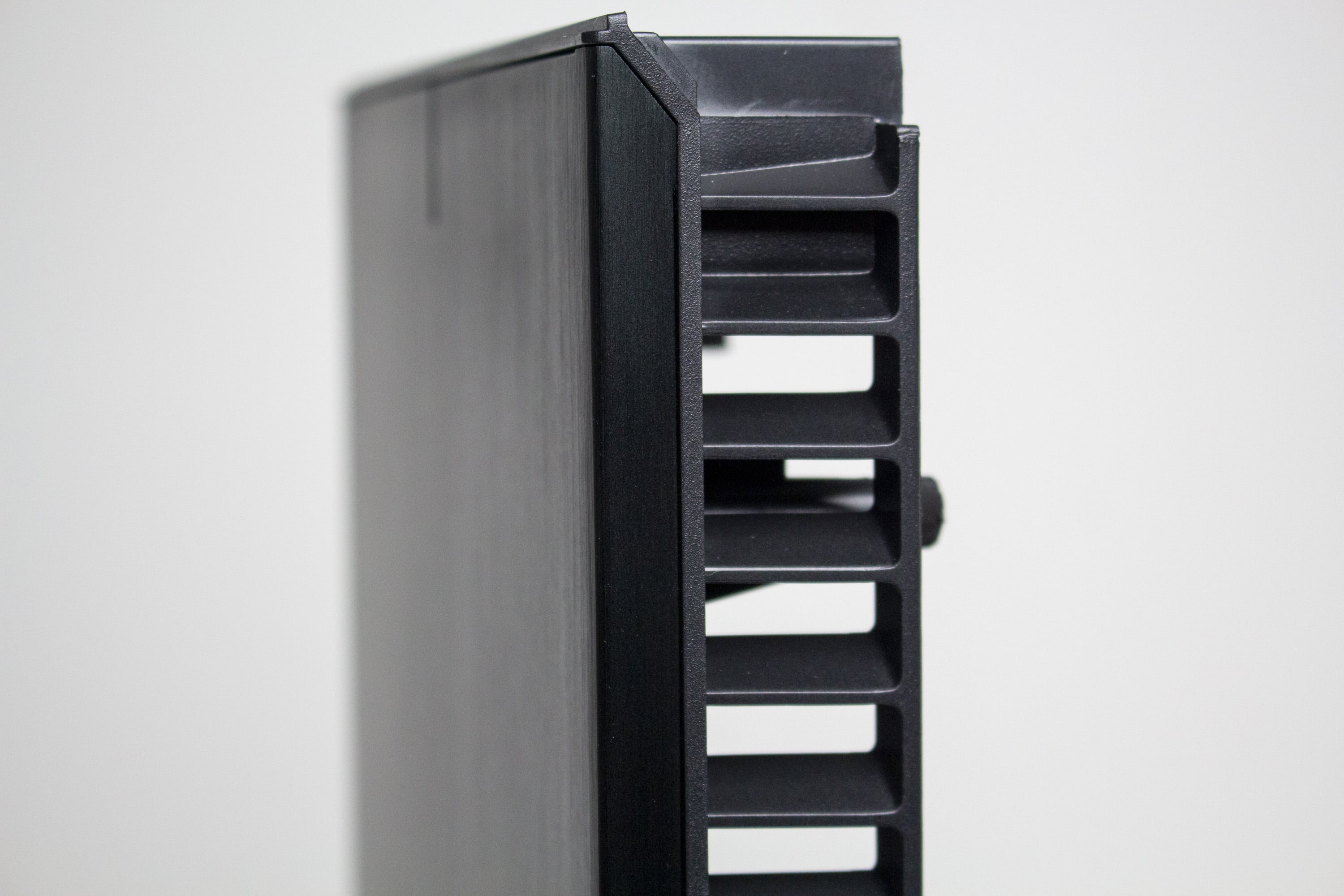 Die Verarbeitungsqualität ist auf einem sehr hohem Niveau und entspricht den Standards, welche wir von Fractal Design gewohnt sind. Die Lackierung ist frei von Fehlern und an allen Stellen gleichmäßig erfolgt. Zudem gibt es weder außen noch innen scharfe Kanten an denen man sich verletzen könnte. Die Implementierung der Push-Pin-Mechanismen für die Seitenteile sowie das Topcover machen einen langlebigen Eindruck, funktionieren problemlos und wirken stabil. Abgerundet werden Verarbeitung und Optik durch die gebürstete Aluminiumplatte des Frontpanels. Diese verleiht dem Mini-Tower eine schlichte Eleganz.
