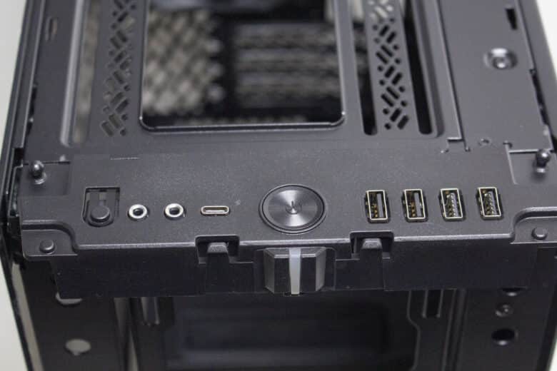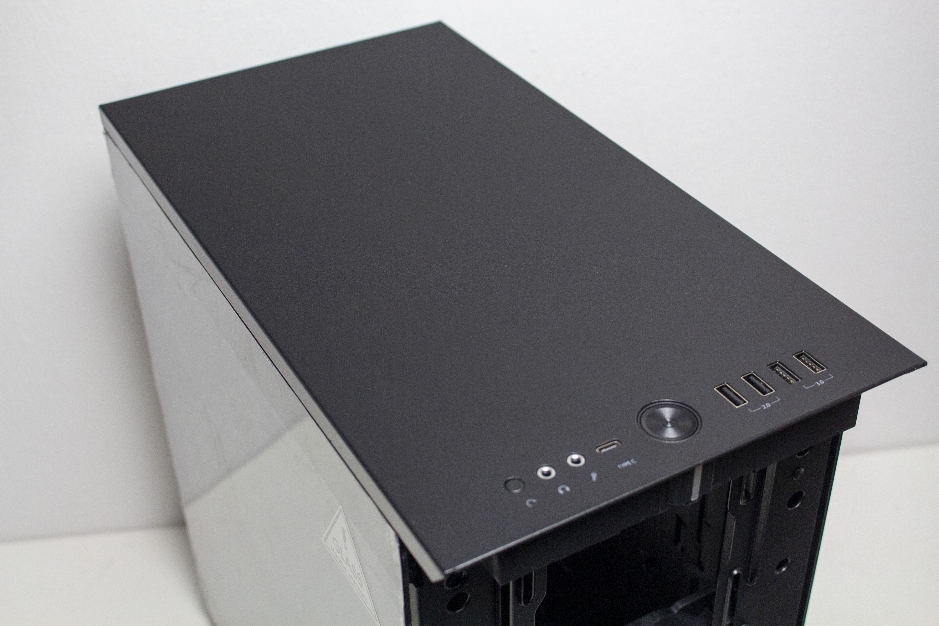 Das I/O-Panel ist fest mit den Korpus verbunden, befindet sich im vorderen Bereich und verfügt über zwei USB 3.0- bzw. zwei USB 2.0-Typ-A-Ports, einen USB 3.1-Typ-C-Anschluss, zwei Buchsen für Kopfhörer bzw. Mikrofon sowie zwei Taster für Power und Reset. Zudem gibt es eine weiße Power-LED unterhalb des Power-Buttons.