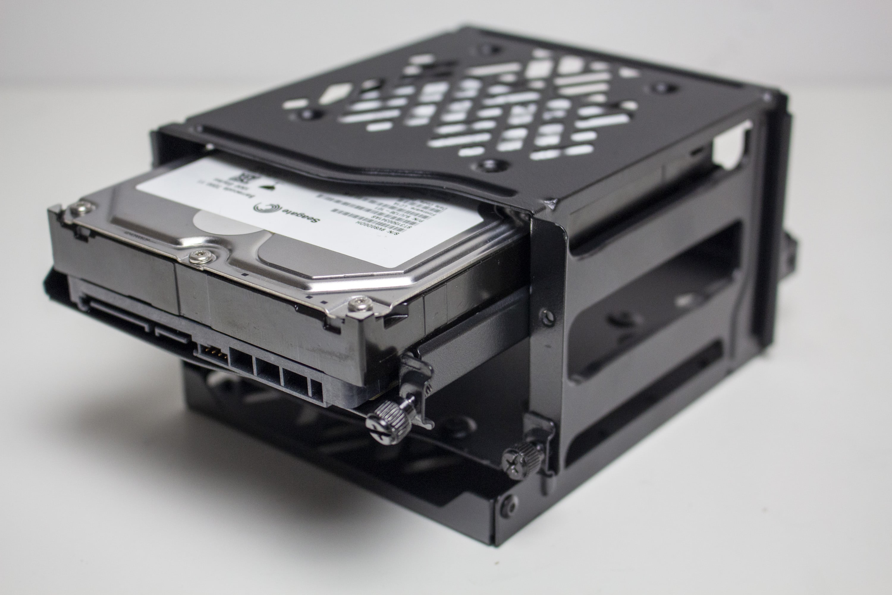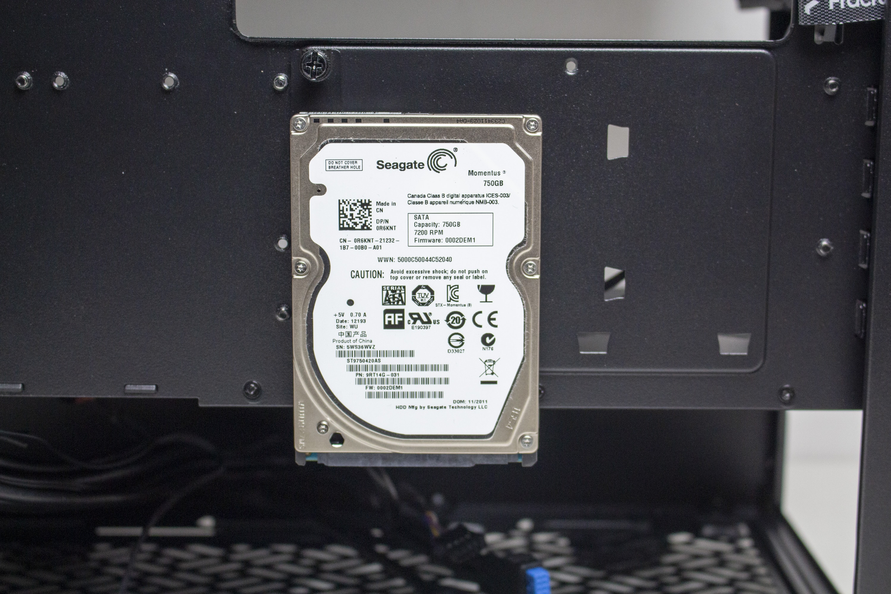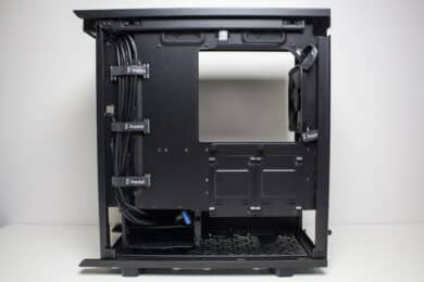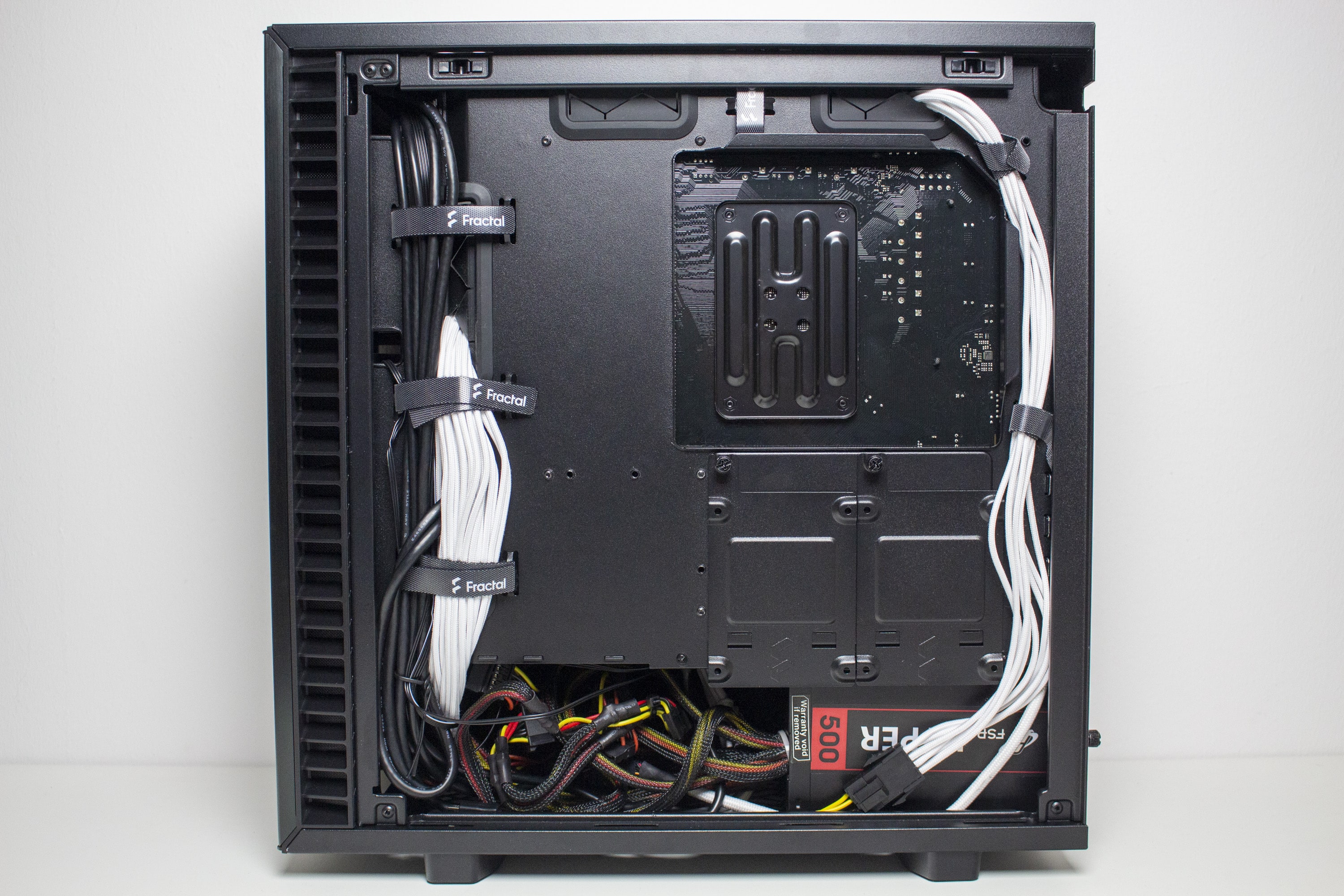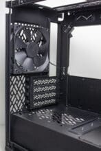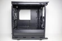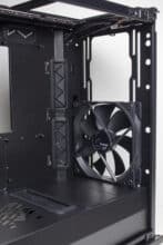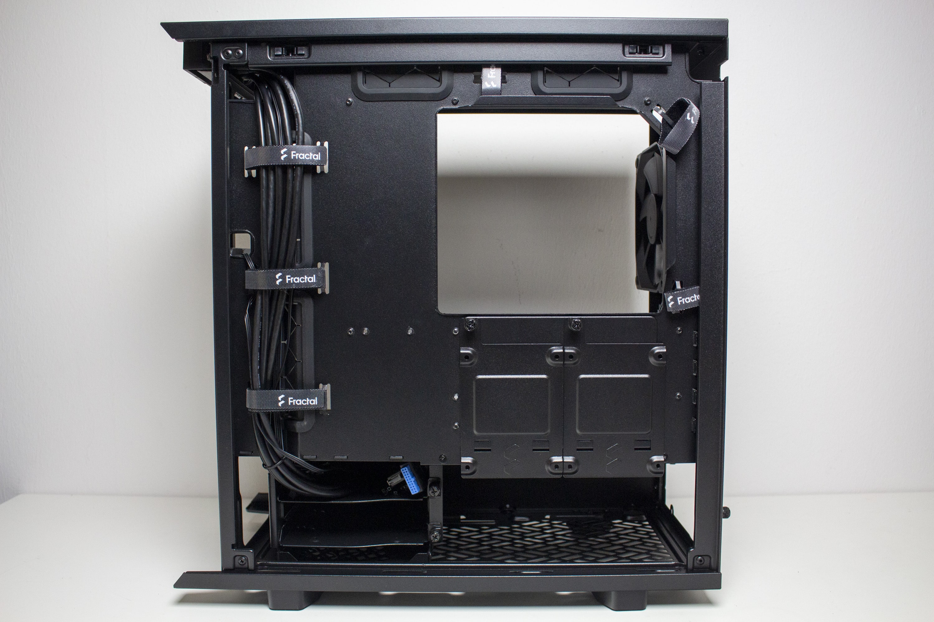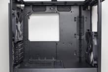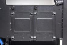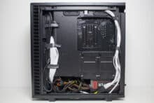 Negative Aspekte gibt es aber dennoch ein paar. So erfolgt die Montage der Datenträger, im Vergleich zu fast allen anderen Komponenten und Gehäuseelementen, nicht werkzeuglos. Außerdem sind die Platzverhältnisse hinter dem Mainboard-Tray nur im Bereich des Kabelkanals ausreichend und mit verbautem HDD-Käfig wird es bei einem nicht modularen Netzteil schwer Platz für die Kabel zu finden. Zuletzt könnte es bei ausladenden Grafikkarten zu Kompatibilitätsproblemen kommen, da diese dann entweder zu lang oder so tief sind, dass die Lüfter auf der Netzteilabdeckung liegen. Ein fünfter Slot (wie z.B. beim Define Mini C) wäre hier von Vorteil gewesen.