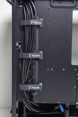An der Rückseite des Mainboards-Trays verzichtet der Hersteller vollständig auf Ösen für Kabelbinder. Dafür kommen aber sechs Klettkabelbinder zum Einsatz. Diese sind wiederverwendbar und schonen somit die Umwelt und die Nerven, falls man doch mal einen Kabelstrang vergessen haben sollte. Auf der linken Seite finden wir zudem eine Vertiefung, welche als Kabelkanal für das 24-Pin-ATX- und die I/O-Panel-Kabel dienen soll.