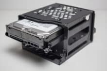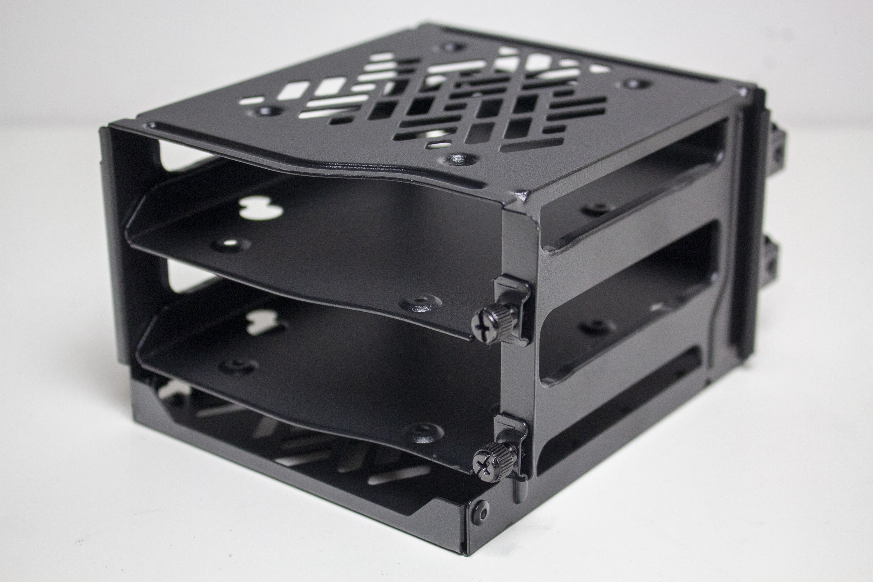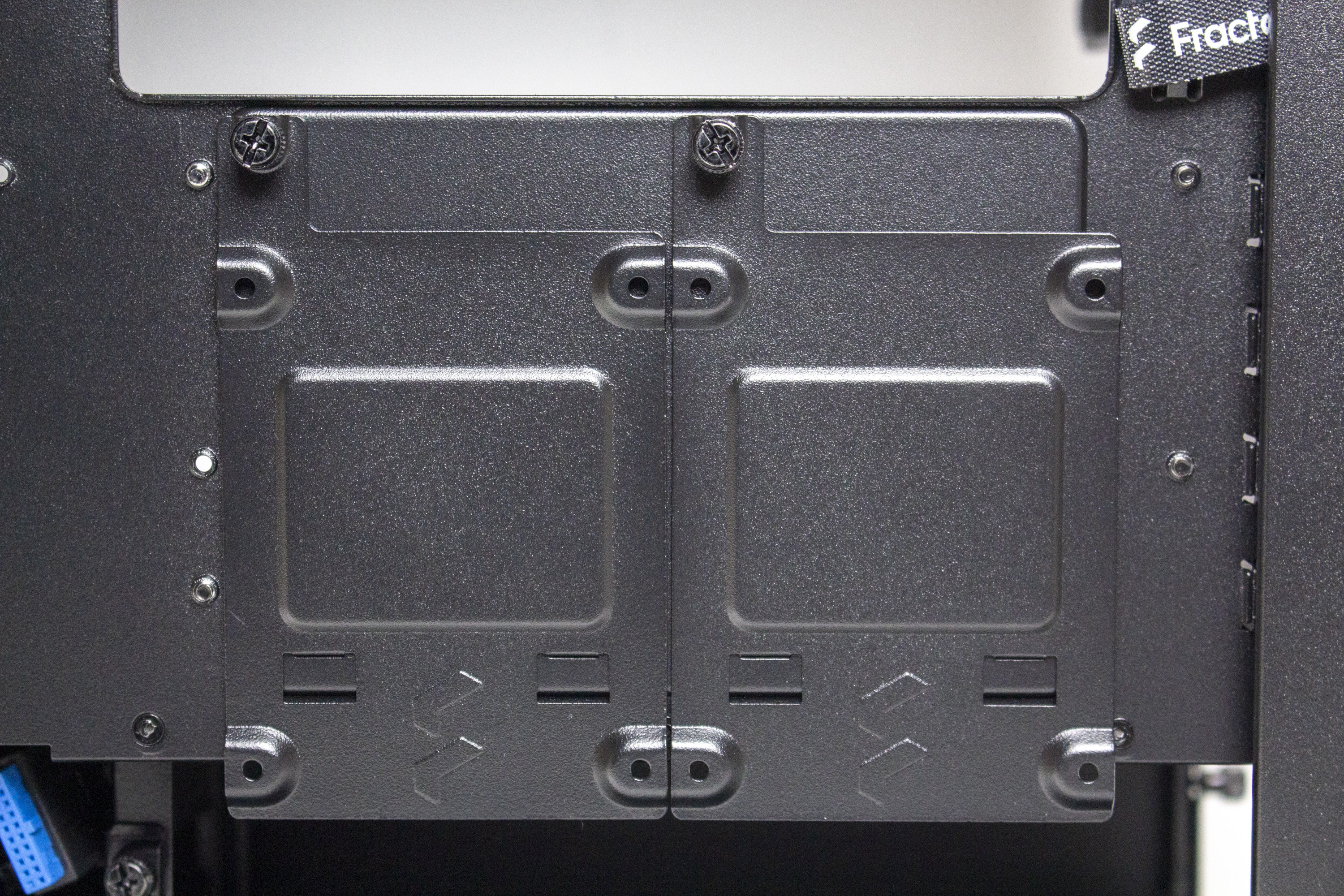 Ab Werk lassen sich im Define 7 Mini bis zu vier Datenträger montieren. Dazu gehören zwei 2,5″-SSDs, die hinter dem Mainboard-Tray an entsprechenden Stahlplatten befestigt werden können. Für die Montage müssen Schrauben bzw. Werkzeug verwendet werden. Wem das nicht genug ist, der hat die Möglichkeit im unteren HDD-Käfig zwei 3,5″- oder 2,5″-HDDs zu positionieren. Auch hier sind zur Anbringung der Datenträger am Stahlrahmen Werkzeug und Schrauben notwendig. Dafür werden 3,5″-HDDs über Gummiringe entkoppelt. Optional bietet die Oberseite der Netzteilblende zwei weitere Montagepunkte für 2,5″-SSDs. Entsprechende Rahmen müssen aber zusätzlich erworben werden und sind nicht Teil des Lieferumfangs.