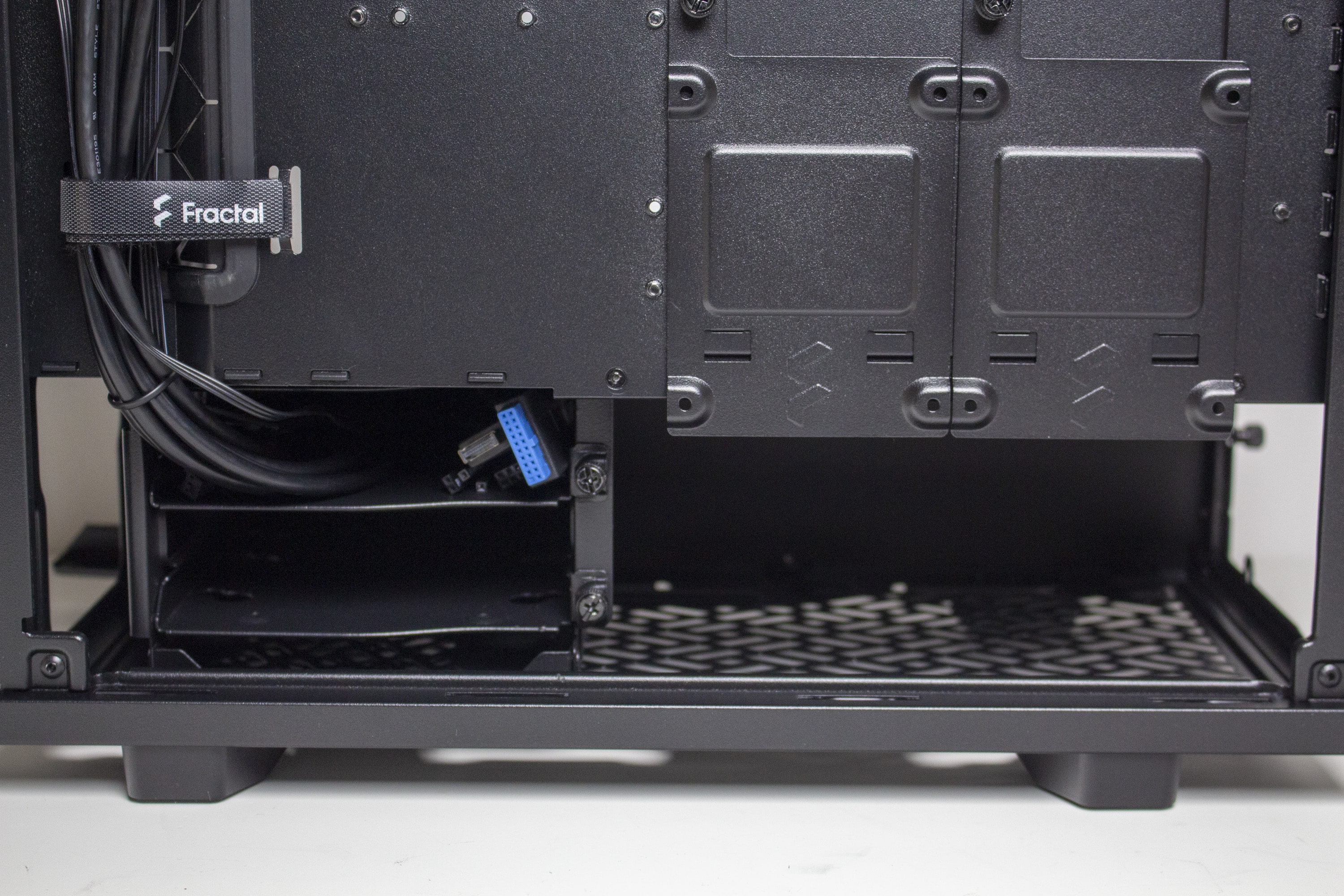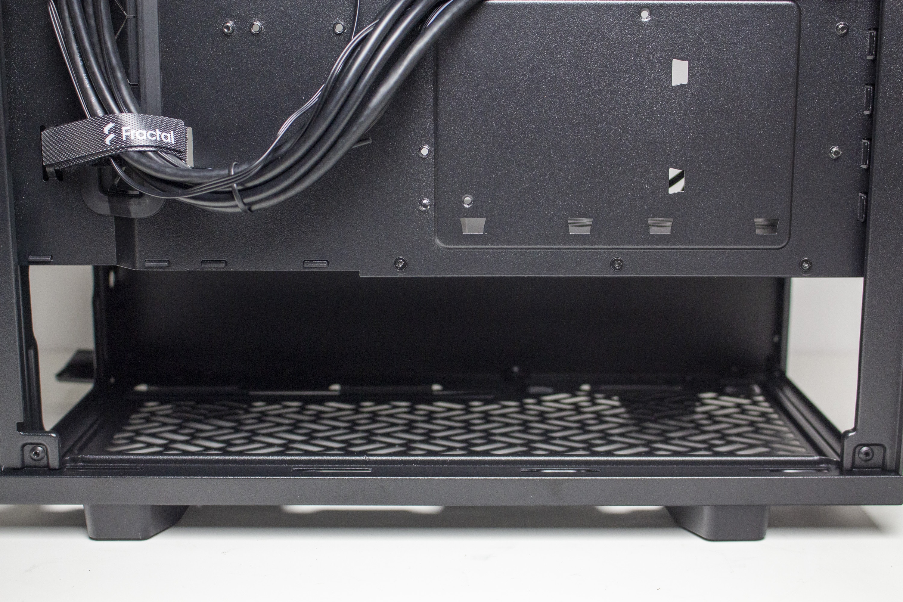 Im Netzteiltunnel finden wir einen modularen HDD-Käfig aus Stahl sowie den Montageplatz für das Netzteil. Zur Entkopplung spendiert Fractal Design dem Mini-Tower vier Gummientkoppler, auf welchen das Netzteil ruhen kann. Die Montage des Netzteils erfolgt von hinten über einen abnehmbaren Stahlrahmen.
