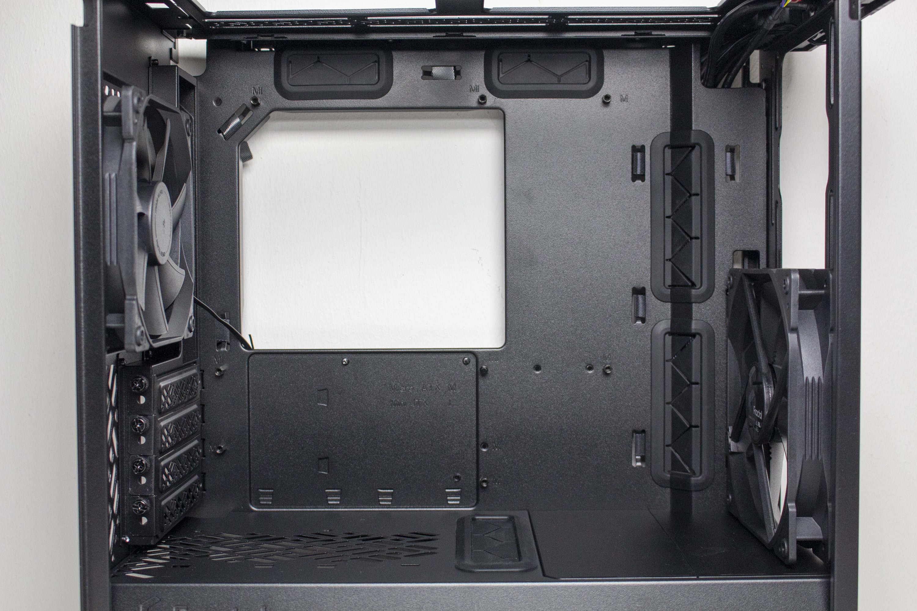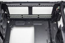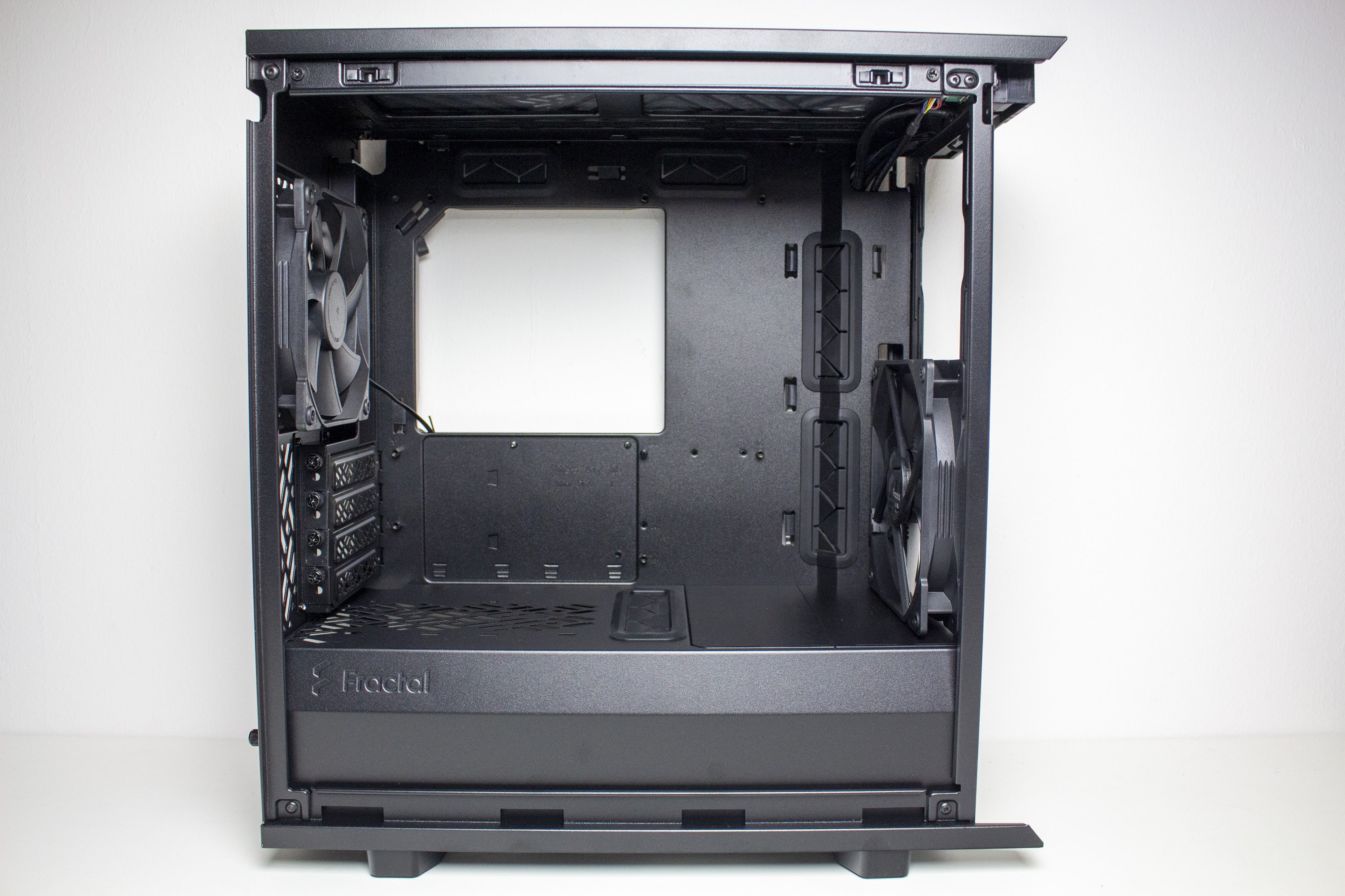 Fractal Design unterteilt den Innenraum des Define Mini 7 in eine große Hauptkammer sowie eine deutlich kleinere Netzteilkammer. Die Hauptkammer bietet Platz für ein µATX-Mainboard, welches durch die vier gummierten Kabelmanagementöffnungen sauber verkabelt werden kann. Außerdem kommt der obligatorische Ausschnitt für CPU-Kühler mit Backplate zum Einsatz. Da Fractal Design in der Hauptkammer auf HDD-Käfige verzichtet, kann der vorinstallierte Frontlüfter ungehindert Luft in den Innenraum befördern. Ebenfalls praktisch ist, dass sich der Montagerahmen im Deckel mit Hilfe von zwei kleinen Schrauben vollständig entfernen lässt. Das könnte besonders beim Einbau eines Radiators praktisch werden.